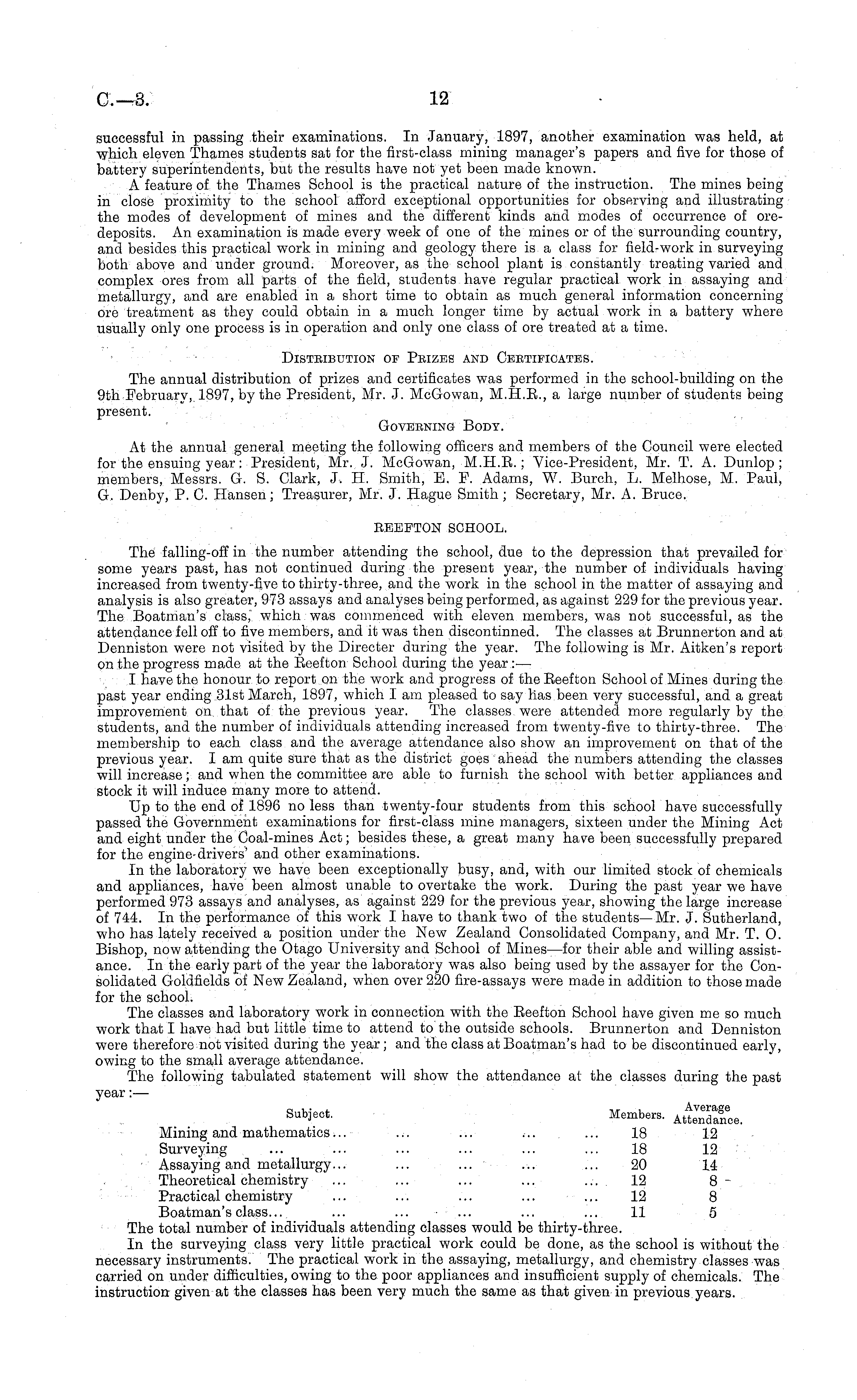 successful in passing their examinations. In January, 1897, another examination was held, at which eleven Thames students sat for the first-class mining manager's papers and five for those of battery superintendents, but the results have not yet been made known. A feature of the Thames School is the practical nature of the instruction. The mines being in close proximity to the school afford exceptional opportunities for observing and illustrating the modes of development of mines and the different kinds and modes of occurrence of oredeposits. An examination is made every week of one of the mines or of the surrounding country, and besides this practical work in mining and geology there is a class for field-work in surveying both above and under ground. Moreover, as the school plant is constantly treating varied and complex ores from all parts of the field, students have regular practical work in assaying and metallurgy, and are enabled in a short time to obtain as much general information concerning ore treatment as they could obtain in a much longer time by actual work in a battery where usually only one process is in operation and only one class of ore treated at a time. Distribution of Prizes and Certificates. The annual distribution of prizes and certificates was performed in the school-building on the 9th February, 1897, by the President, Mr. J. McGowan, M.H.E., a large number of students being present. Governing Body. At the annual general meeting the following officers and members of the Council were elected for the ensuing year: President, Mr. J. McGowan, M.H.E. ; Vice-President, Mr. T. A. Dunlop ; members, Messrs. G. S. Clark, J. H. Smith, E. F. Adams, W. Burch, L. Melhose, M. Paul, G, Denby, P. C. Hansen; Treasurer, Mr. J. Hague Smith; Secretary, Mr. A. Bruce. EEEFTON SCHOOL. The falling-off in the number attending the school, due to the depression that prevailed for some years past, has not continued during the present year, the number of individuals having increased from twenty-five to thirty-three, and the work in the school in the matter of assaying and analysis is also greater, 973 assays and analyses being performed, as against 229 for the previous year. The Boatman's class, which was commenced with eleven members, was not successful, as the attendance fell off to five members, and it was then diseontinned. The classes at Brunnerton and at Denniston were not visited by the Directer during the year. The following is Mr. Aitken's report on the progress made at the Eeefton School during the year : — I have the honour to report on the work and progress of the Eeefton School of Mines during the past year ending 31st March, 1897, which I am pleased to say has been very successful, and a great improvement on that of the previous year. The classes were attended more regularly by the students, and the number of individuals attending increased from twenty-five to thirty-three. The membership to each class and the average attendance also show an improvement on that of the previous year. lam quite sure that as the district goes ahead the numbers attending the classes will increase; and when the committee are able to furnish the school with better appliances and stock it will induce many more to attend. Up to the end of 1896 no less than twenty-four students from this school have successfully passed the Government examinations for first-class mine managers, sixteen under the Mining Act and eight under the Coal-mines Act; besides these, a great many have been successfully prepared for the engine-drivers' and other examinations. In the laboratory we have been exceptionally busy, and, with our limited stock of chemicals and appliances, have been almost unable to overtake the work. During the past year we have performed 973 assays and analyses, as against 229 for the previous year, showing the large increase of 744. In the performance of this work I have to thank two of the students—Mr. J. Sutherland, who has lately received a position under the New Zealand Consolidated Company, and Mr. T. 0. Bishop, now attending the Otago University and School of Mines —for their able and willing assistance. In the early part of the year the laboratory was also being used by the assayer for the Consolidated Goldfields of New Zealand, when over 220 fire-assays were made in addition to those made for the school. The classes and laboratory work in connection with the Eeefton School have given me so much work that I have had but little time to attend to the outside schools. Brunnerton and Denniston were therefore not visited during the year ; and the class at Boatman's had to be discontinued early, owing to the small average attendance. The following tabulated statement will show the attendance at the classes during the past year:— Sub J eot ' Members. A^dance. Mining and mathematics... ... ... ... ... 18 12 Surveying ... ... ... ... ... ... 18 12 Assaying and metallurgy... ... ... ... ... 20 14 Theoretical chemistry ... ... ... ... ... 12 8 - Practical chemistry ... ... ... ... ... 12 8 Boatman's class... ... ... ... ... ... 11 5 The total number of individuals attending classes would be thirty-three. In the surveying class very little practical work could be done, as the school is without the necessary instruments. The practical work in the assaying, metallurgy, and chemistry classes was carried on under difficulties, owing to the poor appliances and insufficient supply of chemicals. The instruction given at the classes has been very much the same as that given in previous years.
