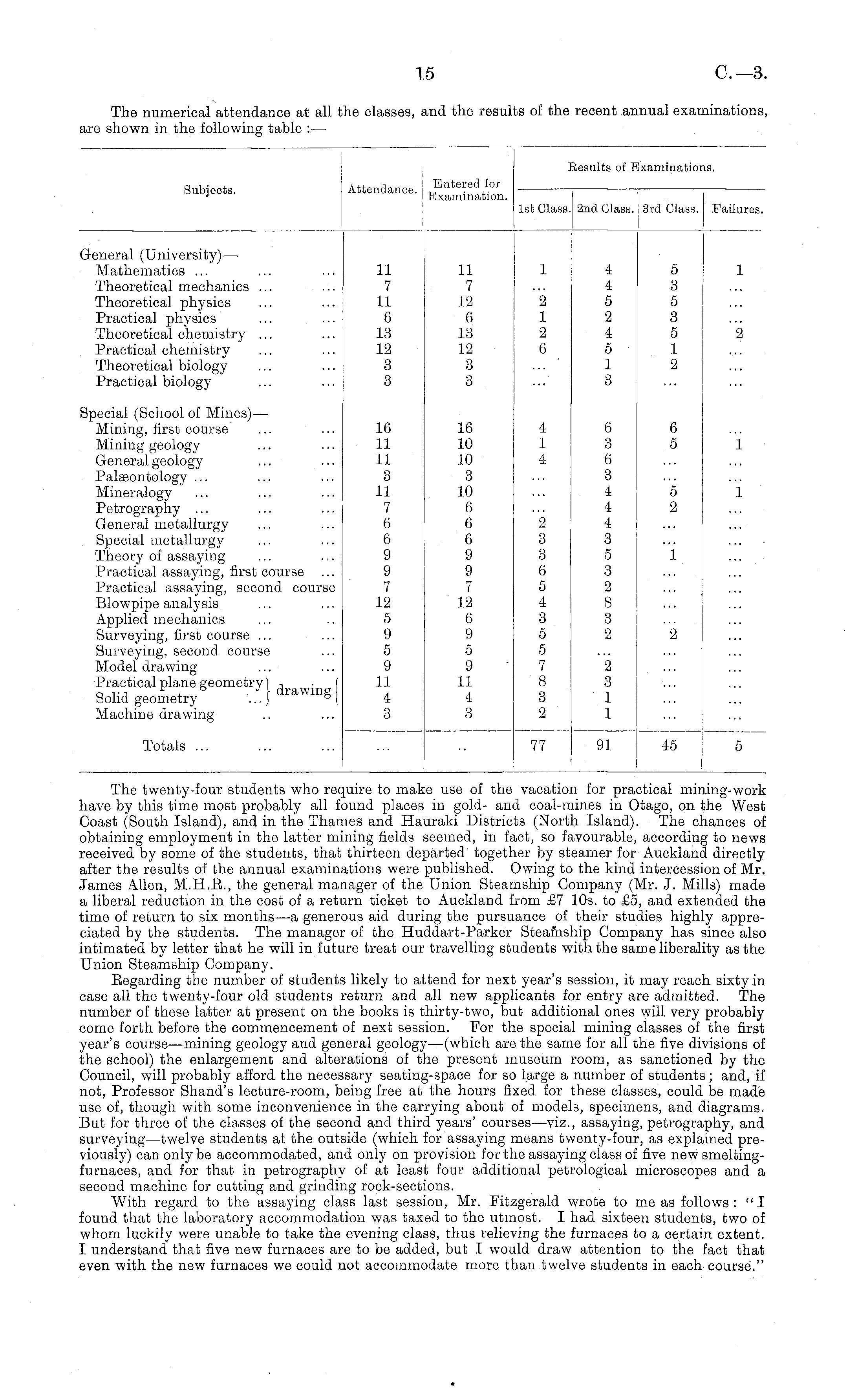 The twenty-four students who require to make use of the vacation for practical mining-work have by this time most probably all found places in gold- and coal-mines in Otago, on the West Coast (South Island), and in the Thames and Hauraki Districts (North Island). The chances of obtaining employment in the latter mining fields seemed, in fact, so favourable, according to news received by some of the students, that thirteen departed together by steamer for Auckland directly after the results of the annual examinations were published. Owing to the kind intercession of Mr. James Allen, M.H.E., the general manager of the Union Steamship Company (Mr. J. Mills) made a liberal reduction in the cost of a return ticket to Auckland from £7 10s. to £5, and extended the time of return to six months—a generous aid during the pursuance of their studies highly appreciated by the students. The manager of the Huddart-Parker Steamship Company has since also intimated by letter that he will in future treat our travelling students with the same liberality as the Union Steamship Company. Eegarding the number of students likely to attend for next year's session, it may reach sixty in case all the twenty-four old students return and all new applicants for entry are admitted. The number of these latter at present on the books is thirty-two, but additional ones will very probably come forth before the commencement of next session. For the special mining classes of the first year's course —mining geology and general geology —(which are the same for all the five divisions of the school) the enlargement and alterations of the present museum room, as sanctioned by the Council, will probably afford the necessary seating-space for so large a number of students; and, if not, Professor Shand's lecture-room, being free at the hours fixed for these classes, could be made use of, though with some inconvenience in the carrying about of models, specimens, and diagrams. But for three of the classes of the second and third years' courses—viz., assaying, petrography, and surveying—twelve students at the outside (which for assaying means twenty-four, as explained previously) can only be accommodated, and only on provision for the assaying class of five newsmeltingfurnaces, and for that in petrography of at least four additional petrological microscopes and a second machine for cutting and grinding rock-sections. With regard to the assaying class last session, Mr. Fitzgerald wrote to me as follows : " I found that the laboratory accommodation was taxed to the utmost. I had sixteen students, two of whom luckily were unable to take the evening class, thus relieving the furnaces to a certain extent. I understand that five new furnaces are to be added, but I would draw attention to the fact that even with the new furnaces we could not accommodate more than twelve students in each course."