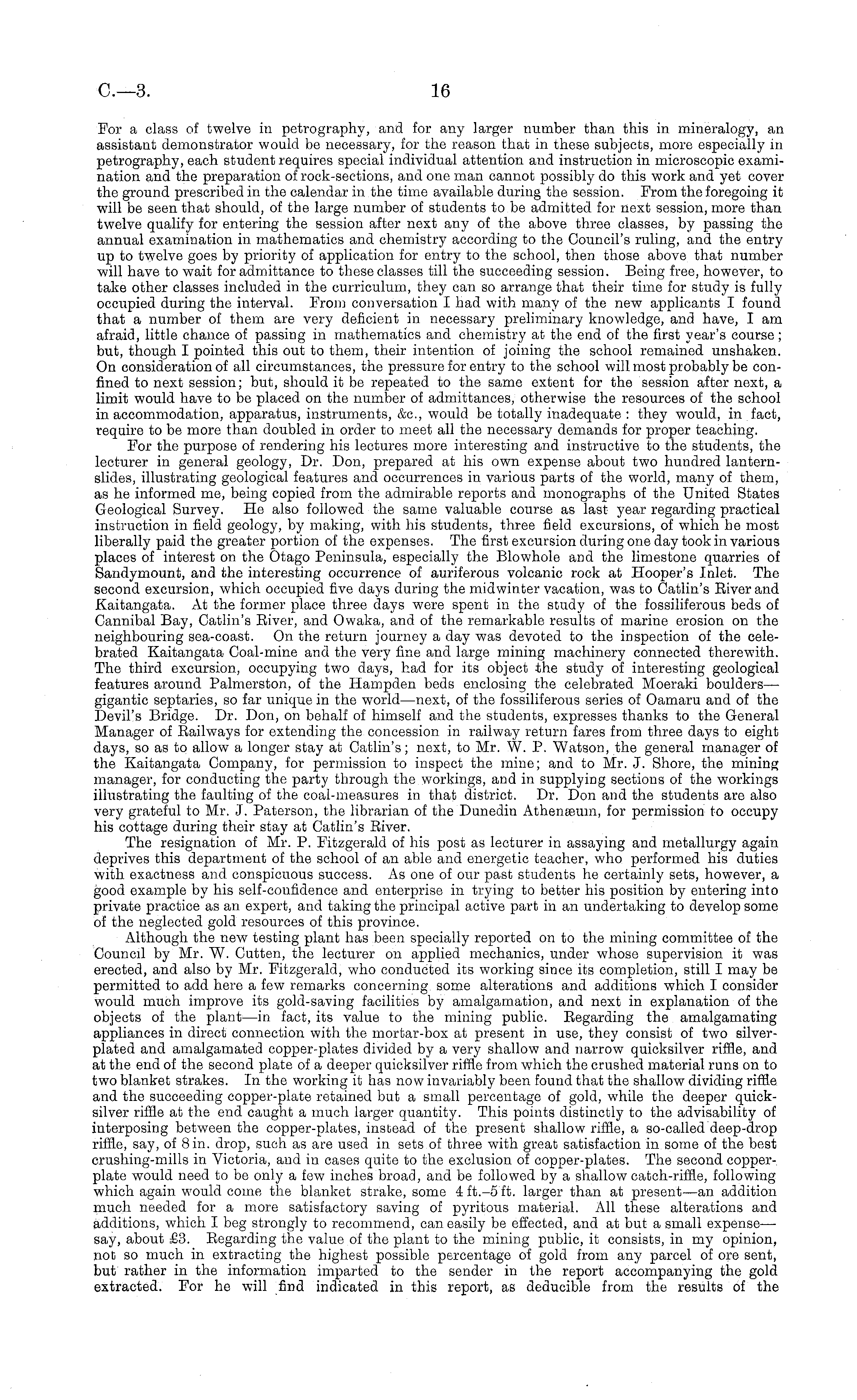 For a class of twelve in petrography, and for any larger number than this in mineralogy, an assistant demonstrator would be necessary, for the reason that in these subjects, more especially in petrography, each student requires special individual attention and instruction in microscopic examination and the preparation of rock-sections, and one man cannot possibly do this work and yet cover the ground prescribed in the calendar in the time available during the session. From the foregoing it will be seen that should, of the large number of students to be admitted for next session, more than twelve qualify for entering the session after next any of the above three classes, by passing the annual examination in mathematics and chemistry according to the Council's ruling, and the entry up to twelve goes by priority of application for entry to the school, then those above that number will have to wait for admittance to these classes till the succeeding session. Being free, however, to take other classes included in the curriculum, they can so arrange that their time for study is fully occupied during the interval. From conversation I had with many of the new applicants I found that a number of them are very deficient in necessary preliminary knowledge, and have, I am afraid, little chance of passing in mathematics and chemistry at the end of the first year's course; but, though I pointed this out to them, their intention of joining the school remained unshaken. On consideration of all circumstances, the pressure for entry to the school will most probably be confined to next session; but, should it be repeated to the same extent for the session after next, a limit would have to be placed on the number of admittances, otherwise the resources of the school in accommodation, apparatus, instruments, &c, would be totally inadequate : they would, in fact, require to be more than doubled in order to meet all the necessary demands for proper teaching. For the purpose of rendering his lectures more interesting and instructive to the students, the lecturer in general geology, Dr. Don, prepared at his own expense about two hundred lanternslides, illustrating geological features and occurrences in various parts of the world, many of them, as he informed me, being copied from the admirable reports and monographs of the United States Geological Survey. He also followed the same valuable course as last year regarding practical instruction in field geology, by making, with his students, three field excursions, of which he most liberally paid the greater portion of the expenses. The first excursion during one day took in various places of interest on the Otago Peninsula, especially the Blowhole and the limestone quarries of Sandymount, and the interesting occurrence of auriferous volcanic rock at Hooper's Inlet. The second excursion, which occupied five days during the midwinter vacation, was to Catlin's Biver and Kaitangata. At the former place three days were spent in the study of the fossiliferous beds of Cannibal Bay, Catlin's Biver, and Owaka, and of the remarkable results of marine erosion on the neighbouring sea-coast. On the return journey a day was devoted to the inspection of the celebrated Kaitangata Coal-mine and the very fine and large mining machinery connected therewith. The third excursion, occupying two days, had for its object -the study of interesting geological features around Palmerston, of the Hampden beds enclosing the celebrated Moeraki boulders— gigantic septaries, so far unique in the world—next, of the fossiliferous series of Oamaru and of the Devil's Bridge. Dr. Don, on behalf of himself and the students, expresses thanks to the General Manager of Bailways for extending the concession in railway return fares from three days to eight days, so as to allow a longer stay at Catlin's; next, to Mr. W. P. Watson, the general manager of the Kaitangata Company, for permission to inspect the mine; and to Mr. J. Shore, the mining manager, for conducting the party through the workings, and in supplying sections of the workings illustrating the faulting of the coal-measures in that district. Dr. Don and the students are also very grateful to Mr. J. Paterson, the librarian of the Dunedin Athenaeum, for permission to occupy his cottage during their stay at Catlin's Biver. The resignation of Mr. P. Fitzgerald of his post as lecturer in assaying and metallurgy again deprives this department of the school of an able and energetic teacher, who performed his duties with exactness and conspicuous success. As one of our past students he certainly sets, however, a good example by his self-confidence and enterprise in trying to better his position by entering into private practice as an expert, and taking the principal active part in an undertaking to develop some of the neglected gold resources of this province. Although the new testing plant has been specially reported on to the mining committee of the Council by Mr. W. Cutten, the lecturer on applied mechanics, under whose supervision it was erected, and also by Mr. Fitzgerald, who conducted its working since its completion, still I may be permitted to add here a few remarks concerning some alterations and additions which I consider would much improve its gold-saving facilities by amalgamation, and next in explanation of the objects of the plant —in fact, its value to the mining public. Begarding the amalgamating appliances in direct connection with the mortar-box at present in use, they consist of two silverplated and amalgamated copper-plates divided by a very shallow and narrow quicksilver riffle, and at the end of the second plate of a deeper quicksilver riffle from which the crushed material runs on to two blanket strakes. In the working it has now invariably been found that the shallow dividing riffle and the succeeding copper-plate retained but a small percentage of gold, while the deeper quicksilver riffle at the end caught a much larger qua