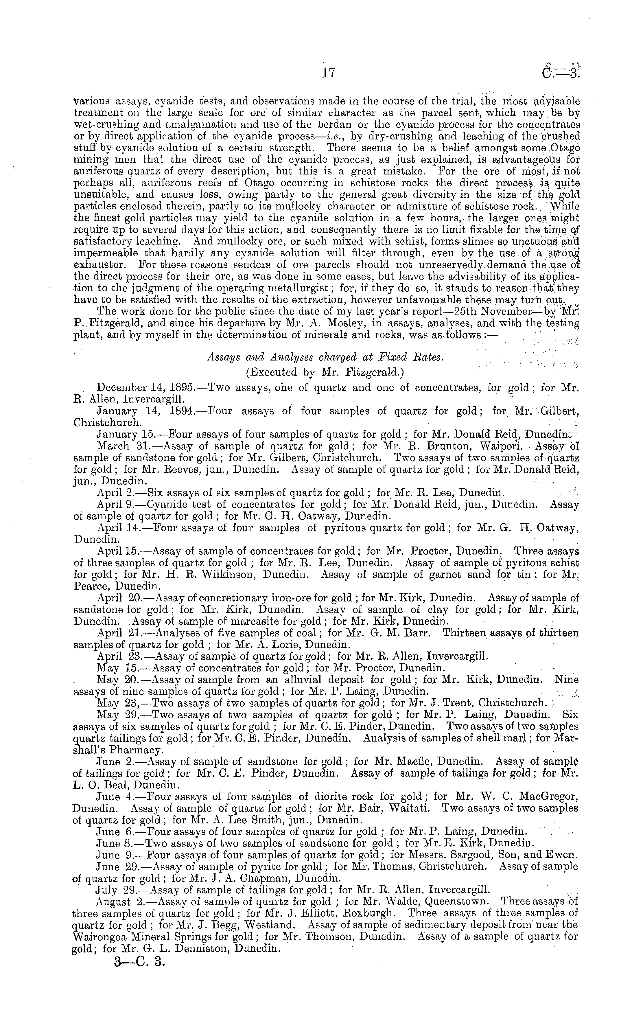 various assays, cyanide tests, and observations made in the course of the trial, the most advisable treatment on the large scale for ore of similar character as the parcel sent, which may be by wet-crushing and amalgamation and use of the berdan or the cyanide process for the concentrates or by direct application of the cyanide process— i.e., by dry-crushing and leaching of the crushed stuff by cyanide solution of a certain strength. There seems to be a belief amongst some OtagO mining men that the direct use of the cyanide process, as just explained, is advantageous for auriferous quartz of every description, but this is a great mistake. For the ore of most, if not perhaps all, auriferous reefs of Otago occurring in schistose rocks the direct process is quite unsuitable, and causes loss, owing partly to the general great diversity in the size of the gold particles enclosed therein, partly to its mullocky character or admixture of schistose rock. While the finest gold particles may yield to the cyanide solution in a few hours, the larger ones might require up to several days for this action, and consequently there is no limit fixablefor the time qf satisfactory leaching. And mullocky ore, or such mixed with schist, forms slimes so unctuous and impermeable that hardly any cyanide solution will filter through, even by the use of a strong exhauster. For these reasons senders of ore parcels should not unreservedly demand the use of the direct process for their ore, as was done in some cases, but leave the advisability of its application to the judgment of the operating metallurgist; for, if they do so, it stands to reason that they have to be satisfied with the results of the extraction, however unfavourable these may turn out. The work done for the public since the date of my last year's report—2sth November—by Mr' P. Fitzgerald, and since his departure by Mr. A. Mosley, in assays, analyses, and with the testing plant, and by myself in the determination of minerals and rocks, was as follows ; — ' Assays and Analyses charged at Fixed Bates. (Executed by Mr. Fitzgerald.) December 14, 1895. —Two assays, one of quartz and one of concentrates, for gold ; for Mr. E. Allen, Invercargill. January 14, 1894.—Four assays of four samples of quartz for gold; for Mr. Gilbert, Christchurch. ■' ■.:.-, January 15.—Four assays of four samples of quartz for gold ; for Mr. Donald Eeid, Dunedin. March 31.—Assay of sample of quartz for gold; for Mr. E. Brunton, Waipori. Assay'of sample of sandstone for gold; for Mr. Gilbert, Christchurch. Two assays of two samples of quartz for gold ; for Mr. Eeeves, jun., Dunedin. Assay of sample of quartz for gold ; for Mr. Donald Reid, jun., Dunedin. April 2.—Six assays of six samples of quartz for gold ; for Mr. E. Lee, Dunedin. April 9.—Cyanide test of concentrates for gold; for Mr. Donald Eeid, jun., Dunedin. Assay of sample of quartz for gold; for Mr. G. H. Oatway, Dunedin. April 14.—Four assays of four samples of pyritous quartz for gold ; for Mr. G. H. Oatway, Dunedin. April 15. —Assay of sample of concentrates for gold; for Mr. Proctor, Dunedin. Three assays of three samples of quartz for gold ; for Mr. E. Lee, Dunedin. Assay of sample of pyritous schist for gold; for Mr. H. E. Wilkinson, Dunedin. Assay of sample of garnet sand for tin ; for Mr. Pearce, Dunedin. April 20.—Assay of concretionary iron-ore for gold ; for Mr. Kirk, Dunedin. Assay of sample of sandstone for gold; for Mr. Kirk, Dunedin. Assay of sample of clay for gold; for Mr. Kirk, Dunedin. Assay of sample of marcasite for gold ; for Mr. Kirk, Dunedin. April 21.—Analyses of five samples of coal; for Mr. G. M. Barr. Thirteen assays of thirteen samples of quartz for gold ; for Mr. A. Lorie, Dunedin. April 23. —Assay of sample of quartz for gold; for Mr. E. Allen, Invercargill. May 15.—Assay of concentrates for gold; for Mr. Proctor, Dunedin. May 20.—Assay of sample from an alluvial deposit for gold ; for Mr. Kirk, Dunedin. Nine assays of nine samples of quartz for gold ; for Mr. P. Laing, Dunedin. May 23, —Two assays of two samples of quartz for gold; for Mr. J. Trent, Christchurch. ; May 29.—Two assays of two samples of quartz for gold ; for Mr. P. Laing, Dunedin. Six assays of six samples of quartz for gold ; for Mr. C. E. Pinder, Dunedin. Two assays of two samples quartz tailings for gold; for Mr. C. E. Finder, Dunedin. Analysis of samples of shell marl; for Marshall's Pharmacy. June 2. —Assay of sample of sandstone for gold; for Mr. Macfie, Dunedin. Assay of sample of tailings for gold; for Mr. C. E. Pinder, Dunedin. Assay of sample of tailings for gold; for Mr. L. O. Beal, Dunedin. June 4.—Four assays of four samples of diorite rock for gold; for Mr. W. C. MacGregor, Dunedin. Assay of sample of quartz for gold ; for Mr. Bair, Waitati. Two assays of two samples of quartz for gold; for Mr. A. Lee Smith, jun., Dunedin. June 6.—Four assays of four samples of quartz for gold ; for Mr. P. Laing, Dunedin. June 8. —Two assays of two samples of sandstone for gold ; for Mr. E. Kirk, Dunedin. June 9.—Four assays of four samples of quartz for gold ; for Messrs. Sargood, Son, and Ewen. June 29.—Assay of sample of pyrite for gold ; for Mr. Thomas, Christchurch. Assay of sample of quartz for gold ; for Mr. J. A. Chapman, Dunedin. July 29.—Assay of sample of tailings for gold ; for Mr. E. Allen, Invercargill. August 2. —Assay of sample of quartz for gold ; for Mr. Walde, Queenstown. Three assays of three samples of quartz for gold ; for Mr. J. Elliott, Eoxburgh. Three assays of three samples of quartz for gold ; for Mr. J. Begg, Westland. Assay of sample of sedimentary deposit from near the Wairongoa Mineral Springs for gold ; for Mr. Thomson, Dunedin. Assay of a sample of quartz for gold; for Mr. G. L. Denniston, Dunedin. 3—C. 3.