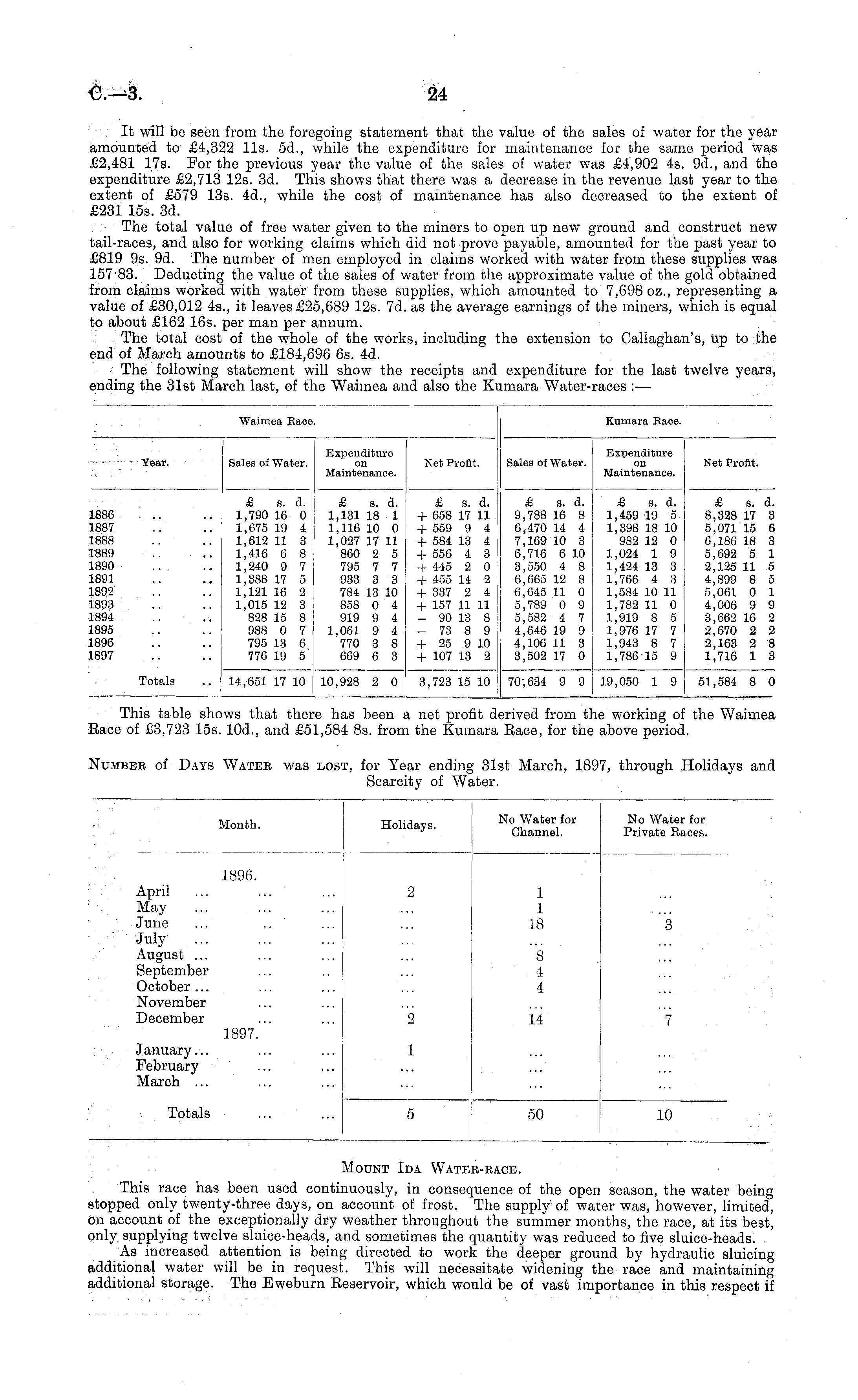 Waimea Eace. Kumara Eace. Year. Sales of Water. Expenditure on Maintenance. Net Profit. Sales of Water. Expenditure on Maintenance. Net Profit. 1886 L887 1888 .889 .890 .891 .892 .893 .894 .895 .896 .897 £ s. d. 1,790 16 0 1,675 19 4 1,612 11 3 1,416 6 8 1,240 9 7 1,388 17 5 1,121 16 2 1,015 12 3 828 15 8 988 0 7 795 13 6 776 19 5 £ s. d. 1,131 18 1 1,116 10 0 1,027 17 11 860 2 5 795 7 7 933 3 3 784 13 10 858 0 4 919 9 4 1,061 9 4 770 3 8 669 6 3 £ s. d. + 658 17 11 + 559 9 4 + 584 13 4 +556 4 3 +445 2 0 + 455 14 2 +337 2 4 + 157 11 11 - 90 13 8 - 73 8 9 + 25 9 10 + 107 13 2 £ s. d. 9.788 16 8 6,470 14 4 7,169 10 3 6,716 6 10 3,550 4 8 6,665 12 8 6.645 11 0 5.789 0 9 5,582 4 7 4.646 19 9 4,106 11 3 3,502 17 0 £ s. d. 1,459 19 5 1,398 18 10 982 12 0 1,024 1 9 1,424 13 3 1,766 4 3 1,584 10 11 1,782 11 0 1,919 8 5 1,976 17 7 1,943 8 7 1,786 15 9 £ s. d. 8,328 17 3 5,071 15 6 6,186 18 3 5,692 5 1 2,125 11 5 4,899 8 5 5,061 0 1 4,006 9 9 3,662 16 2 2,670 2 2 2,163 2 8 1,716 1 3 Totals 14,651 17 10 10,928 2 0 3,723 15 10 70,634 9 9 19,050 1 9 51,584 8 0