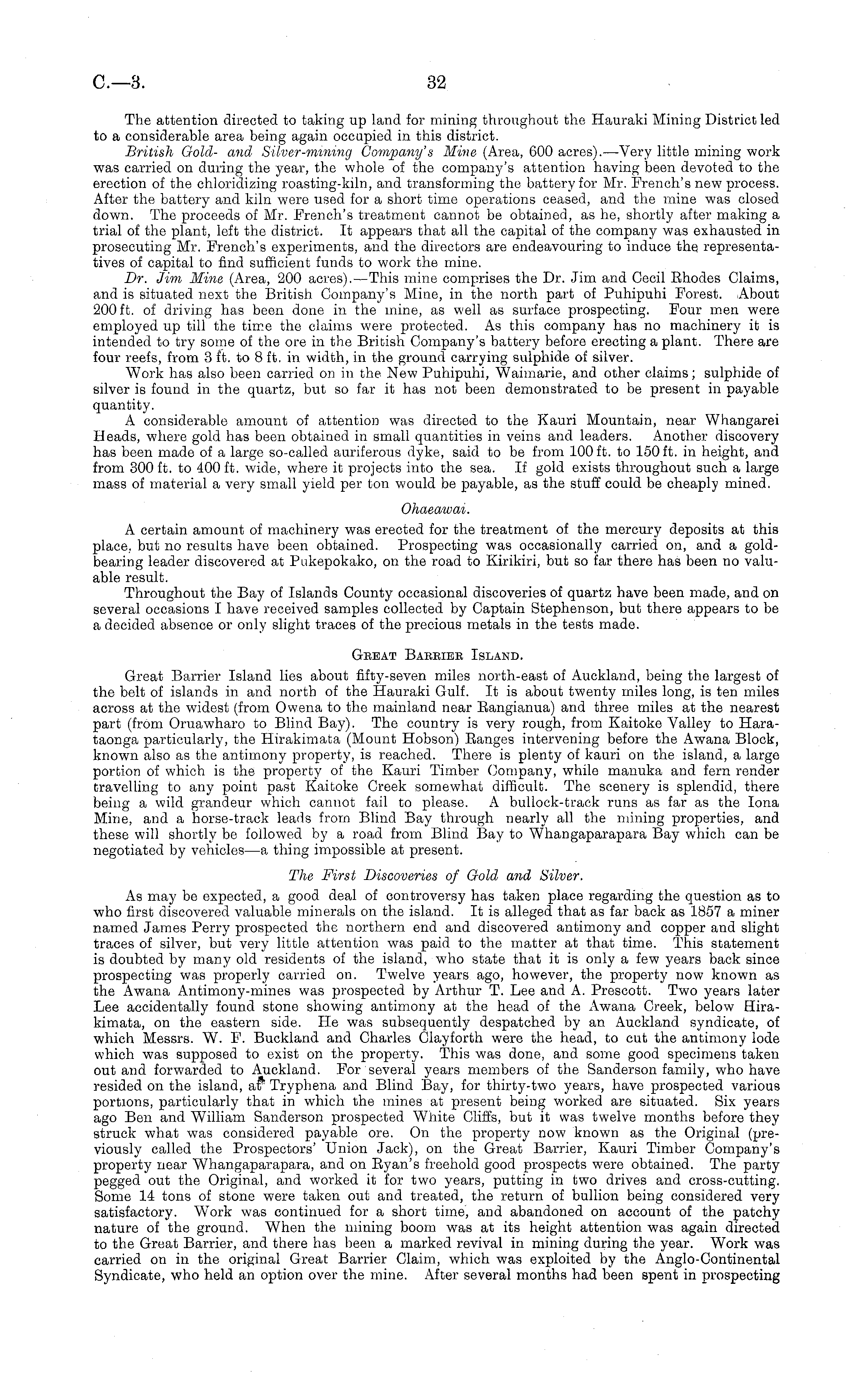 The attention directed to taking up land for mining throughout the Hauraki Mining District led to a considerable area being again occupied in this district. British Gold- and Silver-mining Company's Mine (Area, 600 acres). —Very little mining work was carried on during the year, the whole of the company's attention having been devoted to the erection of the chloridizing roasting-kiln, and transforming the battery for Mr. French's new process. After the battery and kiln were used for a short time operations ceased, and the mine was closed down. The proceeds of Mr. French's treatment cannot be obtained, as he, shortly after making a trial of the plant, left the district. It appears that all the capital of the company was exhausted in prosecuting Mr. French's experiments, and the directors are endeavouring to induce the representatives of capital to find sufficient funds to work the mine. Dr. Jim Mine (Area, 200 acres). —This mine comprises the Dr. Jim and Cecil Ehodes Claims, and is situated next the British Company's Mine, in the north part of Puhipuhi Forest. About 200 ft. of driving has been done in the mine, as well as surface prospecting. Four men were employed up till the time the claims were protected. As this company has no machinery it is intended to try some of the ore in the British Company's battery before erecting a plant. There are four reefs, from 3 ft. to 8 ft. in width, in the ground carrying sulphide of silver. Work has also been carried on in the New Puhipuhi, Waimarie, and other claims; sulphide of silver is found in the quartz, but so far it has not been demonstrated to be present in payable quantity. A considerable amount of attention was directed to the Kauri Mountain, near Whangarei Heads, where gold has been obtained in small quantities in veins and leaders. Another discovery has been made of a large so-called auriferous dyke, said to be from 100 ft. to 150 ft. in height, and from 300 ft. to 400 ft. wide, where it projects into the sea. If gold exists throughout such a large mass of material a very small yield per ton would be payable, as the stuff could be cheaply mined. Ohaeawai. A certain amount of machinery was erected for the treatment of the mercury deposits at this place, but no results have been obtained. Prospecting was occasionally carried on, and a goldbearing leader discovered at Pukepokako, on the road to Kirikiri, but so far there has been no valuable result. Throughout the Bay of Islands County occasional discoveries of quartz have been made, and on several occasions I have received samples collected by Captain Stephenson, but there appears to be a decided absence or only slight traces of the precious metals in the tests made. Geeat Baebieb Island. Great Barrier Island lies about fifty-seven miles north-east of Auckland, being the largest of the belt of islands in and north of the Hauraki Gulf. It is about twenty miles long, is ten miles across at the widest (from Owena to the mainland near Eangianua) and three miles at the nearest part (from Oruawharo to Blind Bay). The country is very rough, from Kaitoke Valley to Harataonga particularly, the Hirakimata (Mount Hobson) Eanges intervening before the Awana Block, known also as the antimony property, is reached. There is plenty of kauri on the island, a large portion of which is the property of the Kauri Timber Company, while manuka and fern render travelling to any point past Kaitoke Creek somewhat difficult. The scenery is splendid, there being a wild grandeur which cannot fail to please. A bullock-track runs as far as the lona Mine, and a horse-track leads from Blind Bay through nearly all the mining properties, and these will shortly be followed by a road from Blind Bay to Whangaparapara Bay which can be negotiated by vehicles—a thing impossible at present. The First Discoveries of Gold and Silver. As may be expected, a good deal of controversy has taken place regarding the question as to who first discovered valuable minerals on the island. It is alleged that as far back as 1857 a miner named James Perry prospected the northern end and discovered antimony and copper and slight traces of silver, but very little attention was paid to the matter at that time. This statement is doubted by many old residents of the island, who state that it is only a few years back since prospecting was properly carried on. Twelve years ago, however, the property now known as the Awana Antimony-mines was prospected by Arthur T. Lee and A. Prescott. Two years later Lee accidentally found stone showing antimony at the head of the Awana Creek, below Hirakimata, on the eastern side. He was subsequently despatched by an Auckland syndicate, of which Messrs. W. F. Buckland and Charles Clayforth were the head, to cut the antimony lode which was supposed to exist on the property. This was done, and some good specimens taken out and forwarded to Auckland. For several years members of the Sanderson family, who have resided on the island, a* Tryphena and Blind Bay, for thirty-two years, have prospected various portions, particularly that in which the mines at present being worked are situated. Six years ago Ben and William Sanderson prospected White Cliffs, but it was twelve months before they struck what was considered payable ore. On the property now known as the Original (previously called the Prospectors' Union Jack), on the Great Barrier, Kauri Timber Company's property near Whangaparapara, and on Eyan's freehold good prospects were obtained. The party pegged out the Original, and worked it for two years, putting in two drives and cross-cutting. Some 14 tons of stone were taken out and treated, the return of bullion being considered very satisfactory. Work was continued for a short time, and abandoned on account of the patchy nature of the ground. When the mining boom was at its height attention was again directed to the Great Barrier, and there has been a marked revival in mining during the year. Work was carried on in