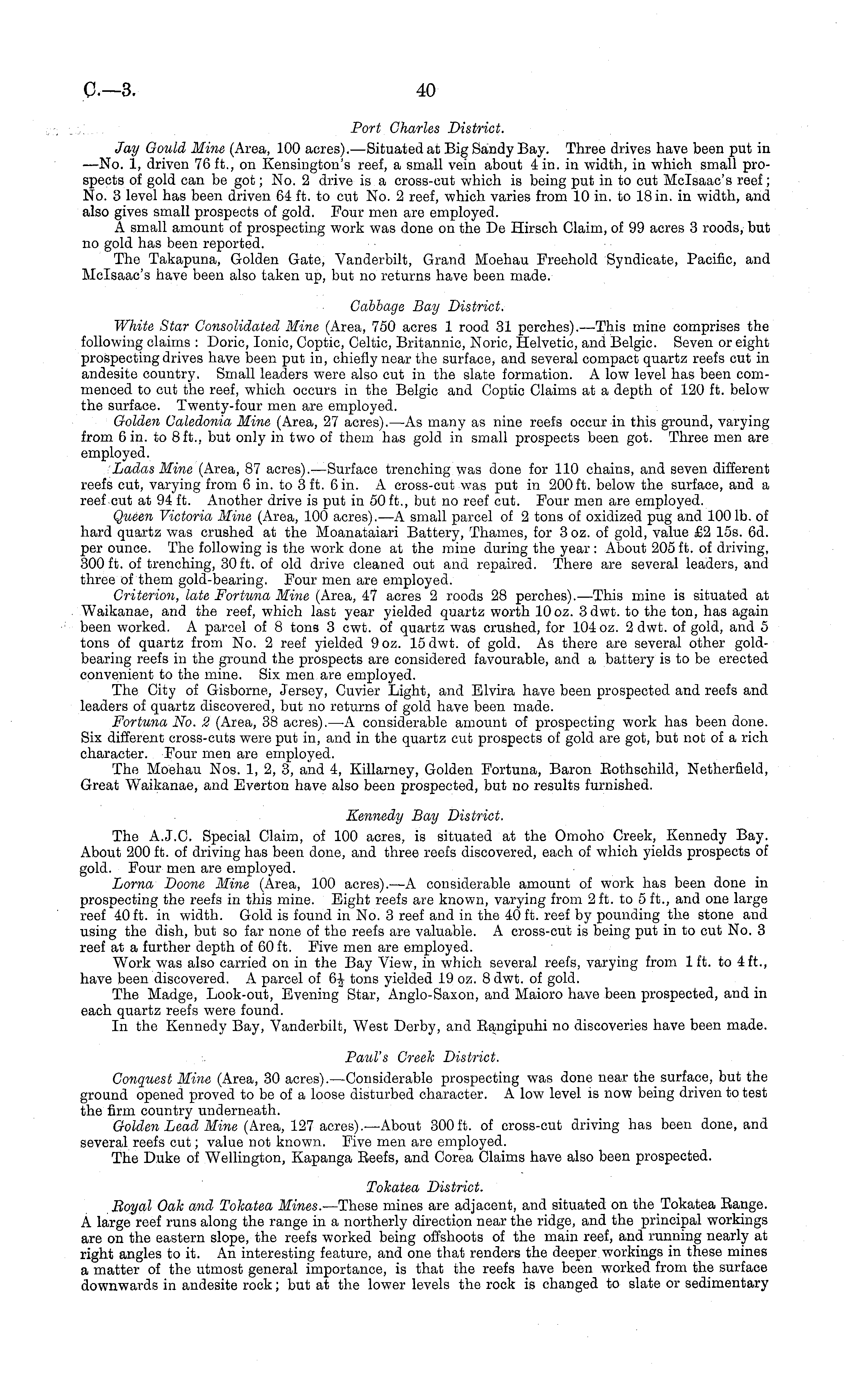 Port Charles District. Jay Gould Mine (Area, 100 acres). —Situated at Big Sandy Bay. Three drives have been put in —No. 1, driven 76 ft., on Kensington's reef, a small vein about 4 in. in width, in which small prospects of gold can be got; No. 2 drive is a cross-cut which is being put in to cut Mclsaac's reef; No. 3 level has been driven 64 ft. to cut No. 2 reef, which varies from 10 in. to 18 in. in width, and also gives small prospects of gold. Pour men are employed. A small amount of prospecting work was done on the De Hirsch Claim, of 99 acres 3 roods, but no gold has been reported. The Takapuna, Golden Gate, Vanderbilt, Grand Moehau Freehold Syndicate, Pacific, and Mclsaac's have been also taken up, but no returns have been made. Cabbage Bay District. White Star Consolidated Mine (Area, 750 acres 1 rood 31 perches).—This mine comprises the following claims : Doric, lonic, Coptic, Celtic, Britannic, Noric, Helvetic, and Belgic. Seven or eight prospecting drives have been put in, chiefly near the surface, and several compact quartz reefs cut in andesite country. Small leaders were also cut in the slate formation. A low level has been commenced to cut the reef, which occurs in the Belgic and Coptic Claims at a depth of 120 ft. below the surface. Twenty-four men are employed. Golden Caledonia Mine (Area, 27 acres). —As many as nine reefs occur in this ground, varying from 6 in. to 8 ft., but only in two of them has gold in small prospects been got. Three men are employed. Ladas Mine (Area, 87 acres). —Surface trenching was done for 110 chains, and seven different reefs cut, varying from 6 in. to 3 ft. 6 in. A cross-cut was put in 200 ft. below the surface, and a reef cut at 94 ft. Another drive is put in 50 ft., but no reef cut. Four men are employed. Queen Victoria Mine (Area, 100 acres). —A small parcel of 2 tons of oxidized pug and 1001b. of hard quartz was crushed at the Moanataiari Battery, Thames, for 3oz. of gold, value £2 15s. 6d. per ounce. The following is the work done at the mine during the year : About 205 ft. of driving, 300 ft. of trenching, 30 ft. of old drive cleaned out and repaired. There are several leaders, and three of them gold-bearing. Four men are employed. Criterion, late Fortuna Mine (Area, 47 acres 2 roods 28 perches).—This mine is situated at Waikanae, and the reef, which last year yielded quartz worth 10 oz. 3 dwt. to the ton, has again been worked. A parcel of 8 tons 3 cwt. of quartz was crushed, for 104 oz. 2 dwt. of gold, and 5 tons of quartz from No. 2 reef yielded 9 oz. 15 dwt. of gold. As there are several other goldbearing reefs in the ground the prospects are considered favourable, and a battery is to be erected convenient to the mine. Six men are employed. The City of Gisborne, Jersey, Cuvier Light, and Elvira have been prospected and reefs and leaders of quartz discovered, but no returns of gold have been made. Fortuna No. 2 (Area, 38 acres). —A considerable amount of prospecting work has been done. Six different cross-cuts were put in, and in the quartz cut prospects of gold are got, but not of a rich character. Four men are employed. The Moehau Nos. 1, 2, 3, and 4, Killarney, Golden Fortuna, Baron Eothschild, Netherfield, Great Waikanae, and Everton have also been prospected, but no results furnished. Kennedy Bay District. The A.J.C. Special Claim, of 100 acres, is situated at the Omoho Creek, Kennedy Bay. About 200 ft. of driving has been done, and three reefs discovered, each of which yields prospects of gold. Pour men are employed. Lorna Doone Mine (Area, 100 acres). —A considerable amount of work has been done in prospecting the reefs in this mine. Eight reefs are known, varying from 2 ft. to 5 ft., and one large reef 40 ft. in width. Gold is found in No. 3 reef and in the 40 ft. reef by pounding the stone and using the dish, but so far none of the reefs are valuable. A cross-cut is being put in to cut No. 3 reef at a further depth of 60 ft. Five men are employed. Work was also carried on in the Bay View, in which several reefs, varying from Ift. to 4 ft., have been discovered. A parcel of 6J tons yielded 19 oz. 8 dwt. of gold. The Madge, Look-out, Evening Star, Anglo-Saxon, and Maioro have been prospected, and in each quartz reefs were found. In the Kennedy Bay, Vanderbilt, West Derby, and Eangipuhi no discoveries have been made. Paul's Creek District. Conquest Mine (Area, 30 acres). —Considerable prospecting was done near the surface, but the ground opened proved to be of a loose disturbed character. A low level is now being driven to test the firm country underneath. Golden Lead Mine (Area, 127 acres) .• —About 300 ft. of cross-cut driving has been done, and several reefs cut; value not known. Five men are employed. The Duke of Wellington, Kapanga Beefs, and Corea Claims have also been prospected. Tokatea District. Boyal Oak and Tokatea Mines. —These mines are adjacent, and situated on the Tokatea Range. A large reef runs along the range in a northerly direction near the ridge, and the principal workings are on the eastern slope, the reefs worked being offshoots of the main reef, and running nearly at right angles to it. An interesting feature, and one that renders the deeper workings in these mines a matter of the utmost general importance, is that the reefs have been worked from the surface downwards in andesite rock; but at the lower levels the rock is changed to slate or sedimentary