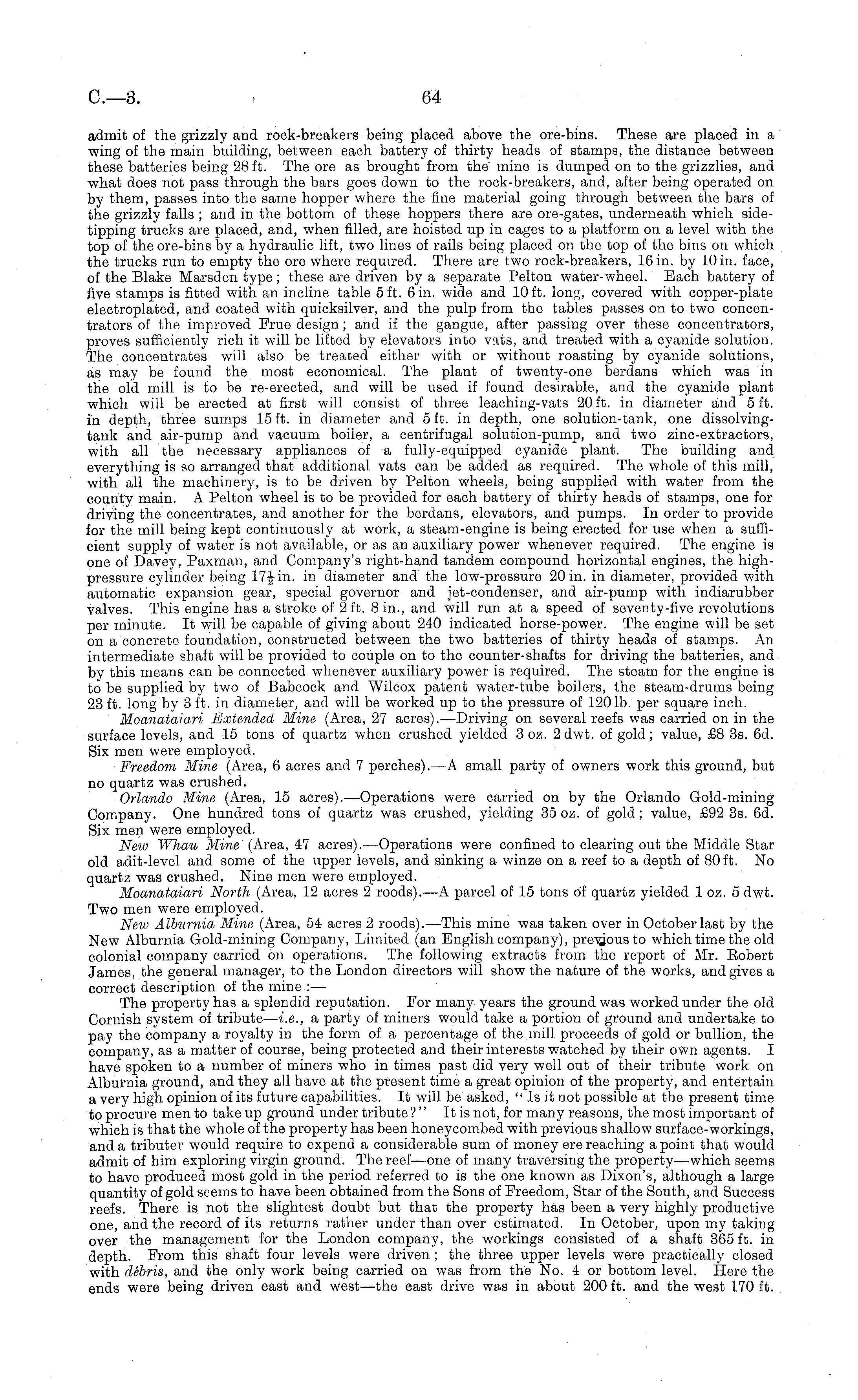 admit of the grizzly and rock-breakers being placed above the ore-bins. These are placed in a wing of the main building, between each battery of thirty heads of stamps, the distance between these batteries being 28 ft. The ore as brought from the mine is dumped on to the grizzlies, and what does not pass through the bars goes down to the rock-breakers, and, after being operated on by them, passes into the same hopper where the fine material going through between the bars of the grizzly falls ; and in the bottom of these hoppers there are ore-gates, underneath which sidetipping trucks are placed, and, when filled, are hoisted up in cages to a platform on a level with the top of the ore-bins by a hydraulic lift, two lines of rails being placed on the top of the bins on which the trucks run to empty the ore where required. There are two rock-breakers, 16 in. by 10 in. face, of the Blake Marsden type; these are driven by a separate Pelton water-wheel. Each battery of five stamps is fitted with an incline table 5 ft. 6 in. wide and 10 ft. long, covered with copper-plate electroplated, and coated with quicksilver, and the pulp from the tables passes on to two concentrators of the improved Frue design; and if the gangue, after passing over these concentrators, proves sufficiently rich it will be lifted by elevators into vats, and treated with a cyanide solution. The concentrates will also be treated either with or without roasting by cyanide solutions, as may be found the most economical. The plant of twenty-one berdans which was in the olid mill is to be re-erected, and will be used if found desirable, and the cyanide plant which will be erected at first will consist of three leaching-vats 20 ft. in diameter and 5 ft. in depth, three sumps 15 ft. in diameter and 5 ft. in depth, one solution-tank, one dissolvingtank and air-pump and vacuum boiler, a centrifugal solution-pump, and two zinc-extractors, with all the necessary appliances of a fully-equipped cyanide plant. The building and everything is so arranged that additional vats can be added as required. The whole of this mill, with all the machinery, is to be driven by Pelton wheels, being supplied with water from the county main. A Pelton wheel is to be provided for each battery of thirty heads of stamps, one for driving the concentrates, and another for the berdans, elevators, and pumps. In order to provide for the mill being kept continuously at work, a steam-engine is being erected for use when a sufficient supply of water is not available, or as an auxiliary power whenever required. The engine is one of Davey, Paxman, and Company's right-hand tandem compound horizontal engines, the highpressure cylinder being 17-|in. in diameter and the low-pressure 20 in. in diameter, provided with automatic expansion gear, special governor and jet-condenser, and air-pump with indiarubber valves. This engine has a stroke of 2 ft. 8 in., and will run at a speed of seventy-five revolutions per minute. It will be capable of giving about 240 indicated horse-power. The engine will be set on a concrete foundation, constructed between the two batteries of thirty heads of stamps. An intermediate shaft will be provided to couple on to the counter-shafts for driving the batteries, and by this means can be connected whenever auxiliary power is required. The steam for the engine is to be supplied by two of Babcock and Wilcox patent water-tube boilers, the steam-drums being 23 ft. long by 3 ft. in diameter, and will be worked up to the pressure of 1201b. per square inch. Moanataiari Extended Mine (Area, 27 acres). —Driving on several reefs was carried on in the surface levels, and 15 tons of quartz when crushed yielded 3 oz. 2 dwt. of gold; value, £8 3s. 6d. Six men were employed. Freedom Mine (Area, 6 acres and 7 perches).—A small party of owners work this ground, but no quartz was crushed. Orlando Mine (Area, 15 acres). —Operations were carried on by the Orlando Gold-mining Company. One hundred tons of quartz was crushed, yielding 35 oz. of gold ; value, £92 3s. 6d. Six men were employed. New Whau Mine (Area, 47 acres). —Operations were confined to clearing out the Middle Star old adit-level and some of the upper levels, and sinking a winze on a reef to a depth of 80 ft. No quartz was crushed. Nine men were employed. Moanataiari North (Area, 12 acres 2 roods). —A parcel of 15 tons of quartz yielded 1 oz. 5 dwt. Two men were employed. Neiu Alburnia Mine (Area, 54 acres 2 roods). —This mine was taken over in October last by the New Alburnia Gold-mining Company, Limited (an English company), prevjous to which time the old colonial company carried, on operations. The following extracts from the report of Mr. Robert James, the general manager, to the London directors will show the nature of the works, and gives a correct description of the mine : — The property has a splendid reputation. For many years the ground was worked under the old Cornish system of tribute — i.e., a party of miners would take a portion of ground and undertake to pay the company a royalty in the form of a percentage of the.mill proceeds of gold or bullion, the company, as a matter of course, being protected and their interests watched by their own agents. I have spoken to a number of miners who in times past did very well out of their tribute work on Alburnia ground, and they all have at the present time a great opinion of the property, and entertain a very high opinion of its future capabilities. It will be asked, "Is it not possible at the present time to procure men to take up ground under tribute ? " It is not, for many reasons, the most important of which is that the whole of the property has been honeycombed with previous shallow surface-workings, and a tributer would require to expend a considerable sum of money ere reaching a point that would admit of him exploring virgin ground. The reef—one of many traversing the property—which seems to have produced most gold in 