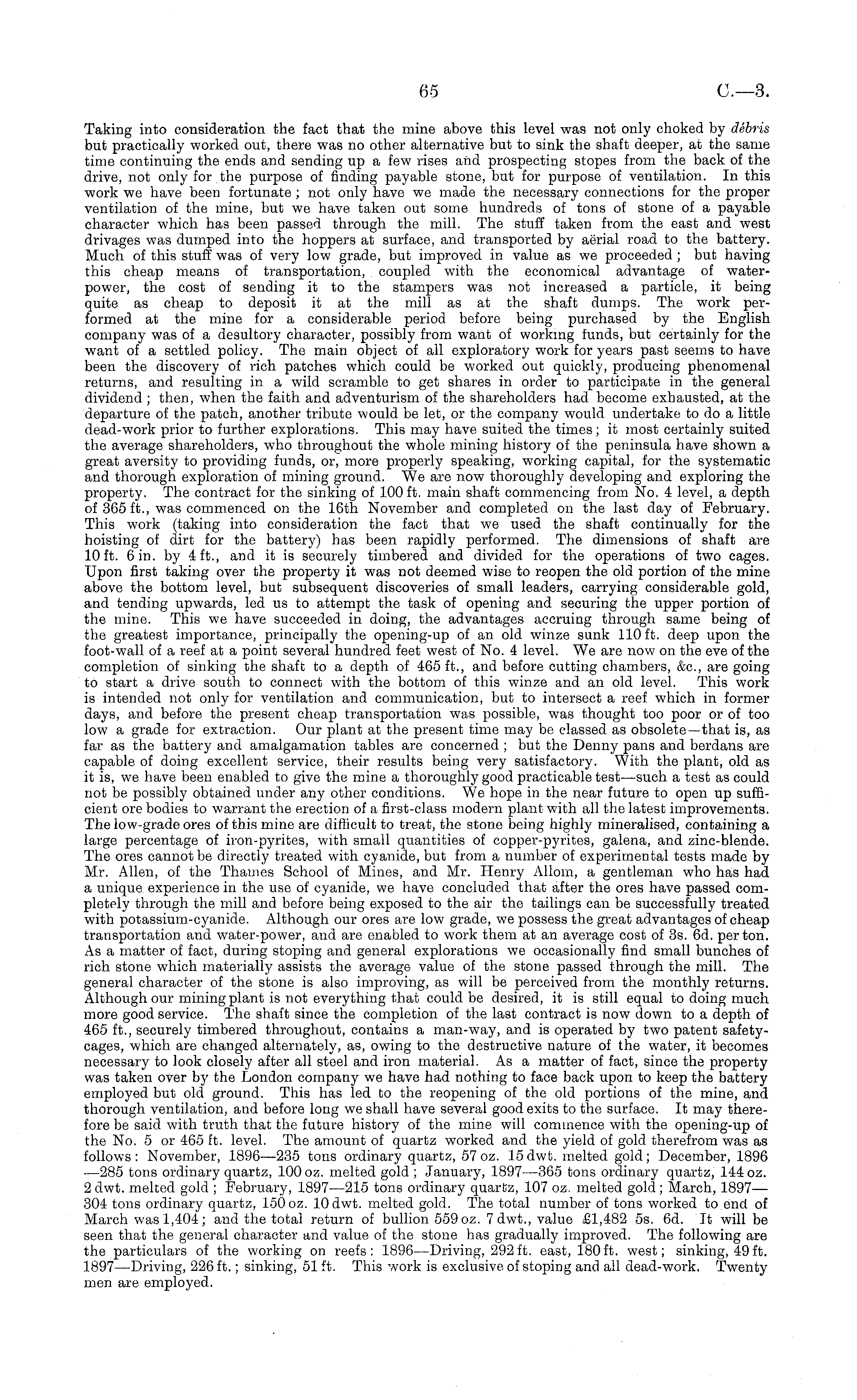 Taking into consideration the fact that the mine above this level was not only choked by debris but practically worked out, there was no other alternative but to sink the shaft deeper, at the same time continuing the ends and sending up a few rises and prospecting stopes from the back of the drive, not only for the purpose of finding payable stone, but for purpose of ventilation. In this work we have been fortunate ; not only have we made the necessary connections for the proper ventilation of the mine, but we have taken out some hundreds of tons of stone of a payable character which has been passed through the mill. The stuff taken from the east and west drivages was dumped into the hoppers at surface, and transported by aerial road to the battery. Much of this stuff was of very low grade, but improved in value as we proceeded ; but having this cheap means of transportation, coupled with the economical advantage of waterpower, the cost of sending it to the stampers was not increased a particle, it being quite as cheap to deposit it at the mill as at the shaft dumps. The work performed at the mine for a considerable period before being purchased by the English company was of a desultory character, possibly from want of working funds, but certainly for the want of a settled policy. The main object of all exploratory work for years past seems to have been the discovery of rich patches which could be worked out quickly, producing phenomenal returns, and resulting in a wild scramble to get shares in order to participate in the general dividend ; then, when the faith and adventurism of the shareholders had become exhausted, at the departure of the patch, another tribute would be let, or the company would undertake to do a little dead-work prior to further explorations. This may have suited the times; it most certainly suited the average shareholders, who throughout the whole mining history of the peninsula have shown a great aversity to providing funds, or, more properly speaking, working capital, for the systematic and thorough exploration of mining ground. We are now thoroughly developing and exploring the property. The contract for the sinking of 100 ft. main shaft commencing from No. 4 level, a depth of 365 ft., was commenced on the 16th November and completed on the last day of February. This work (taking into consideration the fact that we used the shaft continually for the hoisting of dirt for the battery) has been rapidly performed. The dimensions of shaft are 10 ft. 6 in. by 4 ft., and it is securely timbered and divided for the operations of two cages. Upon first taking over the property it was not deemed wise to reopen the old portion of the mine above the bottom level, but subsequent discoveries of small leaders, carrying considerable gold, and tending upwards, led us to attempt the task of opening and securing the upper portion of the mine. This we have succeeded in doing, the advantages accruing through same being of the greatest importance, principally the opening-up of an old winze sunk 110 ft. deep upon the foot-wall of a reef at a point several hundred feet west of No. 4 level. We are now on the eve of the completion of sinking the shaft to a depth of 465 ft., and before cutting chambers, &c, are going to start a drive south to connect with the bottom of this winze and an old level. This work is intended not only for ventilation and communication, but to intersect a reef which in former days, and before the present cheap transportation was possible, was thought too poor or of too low a grade for extraction. Our plant at the present time may be classed as obsolete—that is, as far as the battery and amalgamation tables are concerned ; but the Denny pans and berdans are capable of doing excellent service, their results being very satisfactory. With the plant, old as it is, we have been enabled to give the mine a thoroughly good practicable test —such a test as could not be possibly obtained under any other conditions. We hope in the near future to open up sufficient ore bodies to warrant the erection of a first-class modern plant with all the latest improvements. The low-grade ores of this mine are difficult to treat, the stone being highly mineralised, containing a large percentage of iron-pyrites, with small quantities of copper-pyrites, galena, and zinc-blende. The ores cannot be directly treated with cyanide, but from a number of experimental tests made by Mr. Allen, of the Thames School of Mines, and Mr. Henry Allom, a gentleman who has had a unique experience in the use of cyanide, we have concluded that after the ores have passed completely through the mill and before being exposed to the air the tailings can be successfully treated with potassium-cyanide. Although our ores are low grade, we possess the great advantages of cheap transportation and water-power, and are enabled to work them at an average cost of 3s. 6d. per ton. As a matter of fact, during stoping and general explorations we occasionally find small bunches of rich stone which materially assists the average value of the stone passed through the mill. The general character of the stone is also improving, as will be perceived from the monthly returns. Although our mining plant is not everything that could be desired, it is still equal to doing much more good service. The shaft since the completion of the last contract is now down to a depth of 465 ft., securely timbered throughout, contains a man-way, and is operated by two patent safetycages, which are changed alternately, as, owing to the destructive nature of the water, it becomes necessary to look closely after all steel and iron material. As a matter of fact, since the property was taken over by the London company we have had nothing to face back upon to keep the battery employed but old ground. This has led to the reopening of the old portions of the mine, and thorough ventilation, and before long we shall have several good exits to the surface. It 