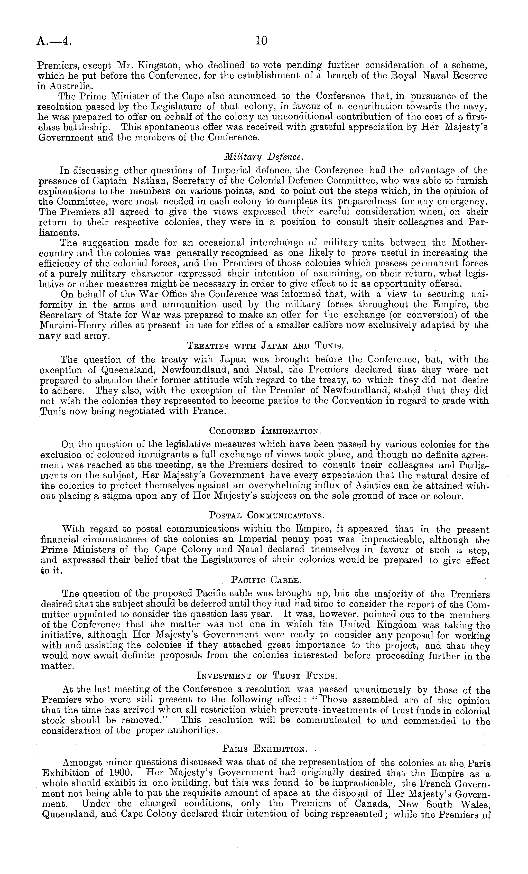 Premiers, except Mr. Kingston, who declined to vote pending further consideration of a scheme, which he put before the Conference, for the establishment of a branch of the Eoyal Naval Eeserve in Australia. The Prime Minister of the Cape also announced to the Conference that, in pursuance of the resolution passed by the Legislature of that colony, in favour of a contribution towards the navy, he was prepared to offer on behalf of the colony an unconditional contribution of the cost of a firstclass battleship. This spontaneous offer was received with grateful appreciation by Her Majesty's Government and the members of the Conference. Military Defence. In discussing other questions of Imperial defence, the Conference had the advantage of the presence of Captain Nathan, Secretary of the Colonial Defence Committee, who was able to furnish explanations to the members on various points, and to point out the steps which, in the opinion of the Committee, were most needed in each colony to complete its preparedness for any emergency. The Premiers all agreed to give the views expressed their careful consideration when, on their return to their respective colonies, they were in a position to consult their colleagues and Parliaments. The suggestion made for an occasional interchange of military units between the Mothercountry and the colonies was generally recognised as one likely to prove useful in increasing the efficiency of the colonial forces, and the Premiers of those colonies which possess permanent forces of a purely military character expressed their intention of examining, on their return, what legislative or other measures might be necessary in order to give effect to it as opportunity offered. On behalf of the War Office the Conference was informed that, with a view to securing uniformity in the arms and ammunition used by the military forces throughout the Empire, the Secretary of State for War was prepared to make an offer for the exchange (or conversion) of the Martini-Henry rifles at present in use for rifles of a smaller calibre now exclusively adapted by the navy and army. Treaties with Japan and Tunis. The question of the treaty with Japan was brought before the Conference, but, with the exception of Queensland, Newfoundland, and Natal, the Premiers declared that they were not prepared to abandon their former attitude with regard, to the treaty, to which they did not desire to adhere. They also, with the exception of the Premier of Newfoundland, stated that they did not wish the colonies they represented to become parties to the Convention in regard to trade with Tunis now being negotiated with France. Coloured Immigbation. On the question of the legislative measures which have been passed by various colonies for the exclusion of coloured immigrants a full exchange of views took place, and though no definite agreement was reached at the meeting, as the Premiers desired to consult their colleagues and Parliaments on the subject, Her Majesty's Government have every expectation that the natural desire of the colonies to protect themselves against an overwhelming influx of Asiatics can be attained without placing a stigma upon any of Her Majesty's subjects on the sole ground of race or colour. Postal Communications. With regard to postal communications within the Empire, it appeared that in the present financial circumstances of the colonies an Imperial penny post was impracticable, although the Prime Ministers of the Cape Colony and Natal declared themselves in favour of such a step, and expressed their belief that the Legislatures of their colonies would be prepared to give effect to it. Pacific Cable. The question of the proposed Pacific cable was brought up, but the majority of the Premiers desired that the subject should be deferred until they had had time to consider the report of the Committee appointed to consider the question last year. It was, however, pointed out to the members of the Conference that the matter was not one in which the United Kingdom was taking the initiative, although Her Majesty's Government were ready to consider any proposal for working with and assisting the colonies if they attached great importance to the project, and that they would now await definite proposals from the colonies interested before proceeding further in the matter. Investment op Teust Funds. At the last meeting of the Conference a resolution was passed unanimously by those of the Premiers who were still present to the following effect: " Those assembled are of the opinion that the time has arrived when all restriction which prevents investments of trust funds in colonial stock should be removed." This resolution will be communicated to and commended to the consideration of the proper authorities. Paris Exhibition. Amongst minor questions discussed was that of the representation of the colonies at the Paris Exhibition of 1900. Her Majesty's Government had originally desired that the Empire as a whole should exhibit in one building, but this was found to be impracticable, the French Government not being able to put the requisite amount of space at the disposal of Her Majesty's Government. Under the changed conditions, only the Premiers of Canada, New South Wales, Queensland, and Cape Colony declared their intention of being represented; while the Premiers of