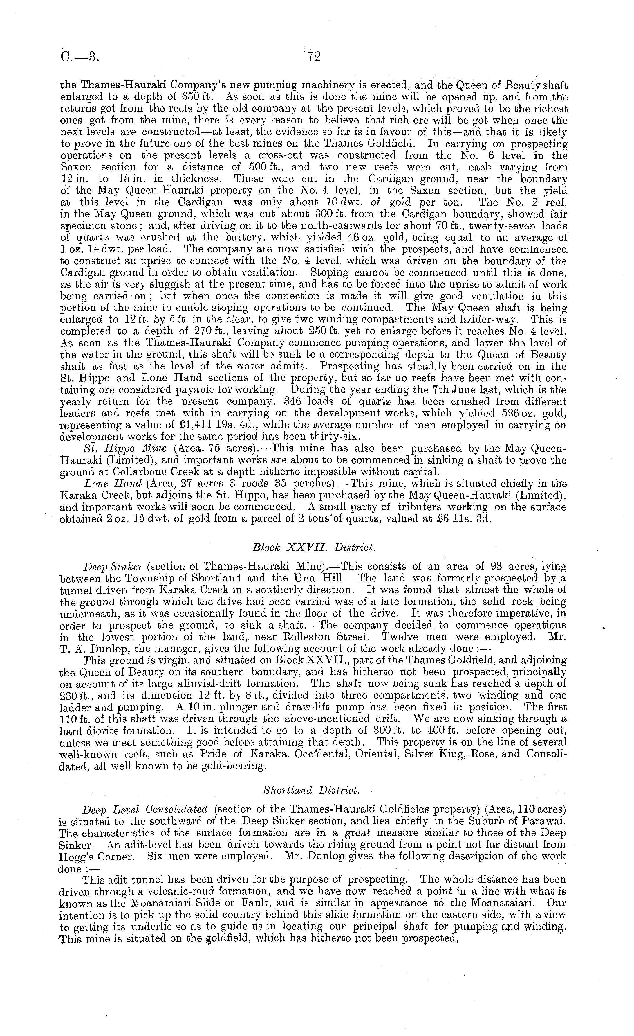 the Thames-Hauraki Company's new pumping machinery is erected, and the Queen of Beauty shaft enlarged to a depth of 650 ft. As soon as this is done the mine will be opened up, and from the returns got from the reefs by the old company at the present levels, which proved to be the richest ones got from the mine, there is every reason to believe that rich ore will be got when once the next levels are constructed—at least, the evidence so far is in favour of this —and that it is likely to prove in the future one of the best mines on the Thames Goldfield. In carrying on prospecting operations on the present levels a cross-cut was constructed from the No. 6 level in the Saxon section for a distance of 500 ft., and two new reefs were cut, each varying from 12 in. to 15 in. in thickness. These were cut in the Cardigan ground, near the boundary of the May Queen-Hauraki property on the No. 4 level, in the Saxon section, but the yield at this level in the Cardigan was only about 10 dwt. of gold per ton. The No. 2 reef, in the May Queen ground, which was cut about 300 ft. from the Cardigan boundary, showed fair specimen stone; and, after driving on it to the north-eastwards for about 70 ft., twenty-seven loads of quartz was crushed at the battery, which yielded 46 oz. gold, being equal to an average of 1 oz. 14 dwt. per load. The company are now satisfied with the prospects, and have commenced to construct an uprise to connect with the No. 4 level, which was driven on the boundary of the Cardigan ground in order to obtain ventilation. Stoping cannot be commenced until this is done, as the air is very sluggish at the present time, and has to be forced into the uprise to admit of work being carried on ; but when once the connection is made it will give good ventilation in this portion of the mine to enable stoping operations to be continued. The May Queen shaft is being enlarged to 12 ft. by 5 ft. in the clear, to give two winding compartments and ladder-way. This is completed to a depth of 270 ft., leaving about 250 ft. yet to enlarge before it reaches No. 4 level. As soon as the Thames-Hauraki Company commence pumping operations, and lower the level of the water in the ground, this shaft will be sunk to a corresponding depth to the Queen of Beauty shaft as fast as the level of the water admits. Prospecting has steadily been carried on in the St. Hippo and Lone Hand sections of the property, but so far no reefs have been met with containing ore considered payable for working. During the year ending the 7th June last, which is the yearly return for the present company, 346 loads of quartz has been crushed from different leaders and reefs met with in carrying on the development works, which yielded 526 oz. gold, representing a value of £1,411 19s. 4d., while the average number of men employed in carrying on development works for the same period has been thirty-six. St. Hippo Mine (Area, 75 acres). —This mine has also been purchased by the May QueenHauraki (Limited), and important works are about to be commenced in sinking a shaft to prove the ground at Collarbone Creek at a depth hitherto impossible without capital. Lone Hand (Area, 27 acres 3 roods 35 perches).—This mine, which is situated chiefly in the Karaka Creek, but adjoins the St. Hippo, has been purchased by the May Queen-Hauraki (Limited), and important works will soon be commenced. A small party of tributers working on the surface obtained 2 oz. 15 dwt. of gold from a parcel of 2 tons'of quartz, valued at £6 lis. 3d. Block XXVII. District. Deep Sinker (section of Thames-Hauraki Mine). —This consists of an area of 93 acres, lying between the Township of Shortland and the Una Hill. The land was formerly prospected by a tunnel driven from Karaka Creek in a southerly direction. It was found that almost the whole of the ground through which the drive had been carried was of a late formation, the solid rock being underneath, as it was occasionally found in the floor of the drive. It was therefore imperative, in order to prospect the ground, to sink a shaft. The company decided to commence operations in the lowest portion of the land, near Eolleston Street. Twelve men were employed. Mr. T. A. Dunlop, the manager, gives the following account of the work already done : — This ground is virgin, and situated on Block XXVII., part of the Thames Goldfield, and adjoining the Queen of Beauty on its southern boundary, and has hitherto not been prospected, principally on account of its large alluvial-drift formation. The shaft now being sunk has reached a depth of 230 ft., and its dimension 12 ft. by 8 ft., divided into three compartments, two winding and one ladder and pumping. AlO in. plunger and draw-lift pump has been fixed in position. The first 110 ft. of this shaft was driven through the above-mentioned drift. We are now sinking through a hard diorite formation. It is intended to go to a depth of 300 ft. to 400 ft. before opening out, unless we meet something good before attaining that depth. This property is on the line of several well-known reefs, such as Pride of Karaka, Occidental, Oriental, Silver King, Eose, and Consolidated, all well known to be gold-bearing. Shortland District. Deep Level Consolidated (section of the Thames-Hauraki Goldfields property) (Area, 110 acres) is situated to the southward of the Deep Sinker section, and lies chiefly in the Suburb of Parawai. The characteristics of the surface formation are in a great measure similar to those of the Deep Sinker. An adit-level has been driven towards the rising ground from a point not far distant from Hogg's Corner. Six men were employed. Mr. Dunlop gives the following description of the work done :— This adit tunnel has been driven for the purpose of prospecting. The whole distance has been driven through a volcanic-mud formation, and we have now reached a point in a line with what is known as the Moanataiari Slide or Fault, and is similar in appearance to the Moanata