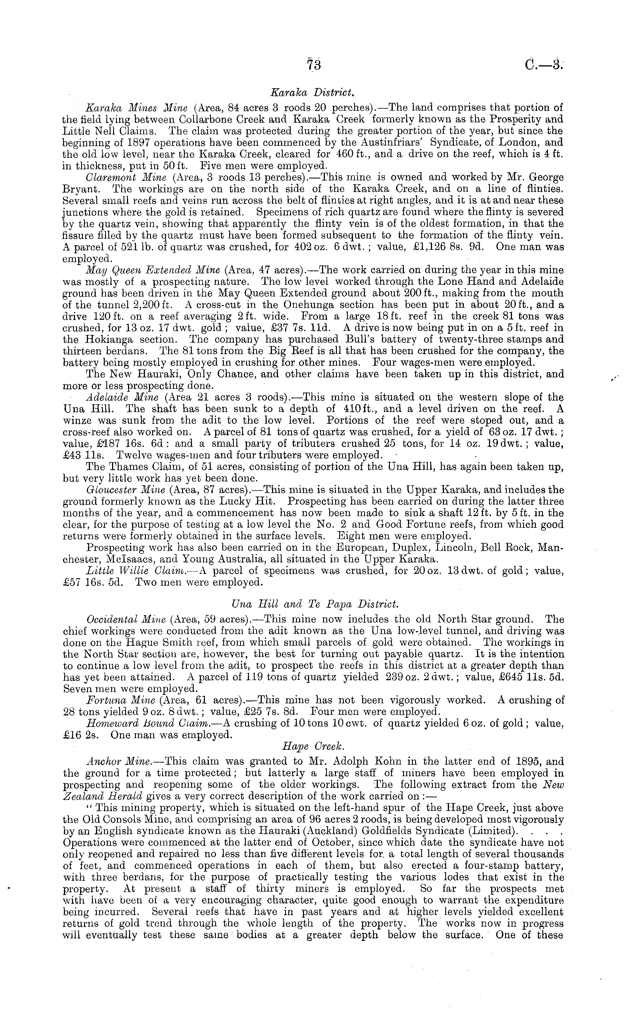 Karaka District. Karaka Mines Mine (Area, 84 acres 3 roods 20 perches). —The land comprises that portion of the field lying between Collarbone Creek and Karaka Creek formerly known as the Prosperity and Little Nell Claims. The claim was protected during the greater portion of the year, but since the beginning of 1897 operations have been commenced by the Austinfriars' Syndicate, of London, and the old low level, near the Karaka Creek, cleared for 460 ft., and a drive on the reef, which is 4 ft. in thickness, put in 50 ft. Five men were employed. Claremont Mine (Area, 3 roods 13 perches).—This mine is owned and worked by Mr. George Bryant. The workings are on the north side of the Karaka Creek, and on a line of flinties. Several small reefs and veins run across the belt of flinties at right angles, and it is at and near these junctions where the gold is retained. Specimens of rich quartz are found where the flinty is severed by the quartz vein, showing that apparently the flinty vein is of the oldest formation, in that the fissure filled by the quartz must have been formed subsequent to the formation of the flinty vein. A parcel of 521 lb. of quartz was crushed, for 402 oz. 6 dwt. ; value, £1,126 Bs. 9d. One man was employed. May Queen Extended Mine (Area, 47 acres). —The work carried on during the year in this mine was mostly of a prospecting nature. The low level worked through the Lone Hand and Adelaide ground has been driven in the May Queen Extended ground about 200 ft., making from the mouth of the tunnel 2,200 ft. A cross-cut in the Onehunga section has been put in about 20 ft., and a drive 120 ft. on a reef averaging 2 ft. wide. From a large 18 ft. reef in the creek 81 tons was crushed, for 13 oz. 17 dwt. gold ; value, £37 7s. lid. A drive is now being put in on a 5 ft. reef in the Hokianga section. The company has purchased Bull's battery of twenty-three stamps and thirteen berdans. The 81 tons from the Big Eeef is all that has been crushed for the company, the battery being mostly employed in crushing for other mines. Four wages-men were employed. The New Hauraki, Only Chance, and other claims have been taken up in this district, and more or less prospecting done. Adelaide Mine (Area 21 acres 3 roods). —This mine is situated on the western slope of the Una Hill. The shaft has been sunk to a depth of 410 ft., and a level driven on the reef. A winze was sunk from the adit to the low level. Portions of the reef were stoped out, and a cross-reef also worked on. A parcel of 81 tons of quartz was crushed, for a yield of 63 oz. 17 dwt. ; value, £187 16s. 6d : and a small party of tributers crushed 25 tons, for 14 oz. 19 dwt. ; value, £43 lis. Twelve wages-men and four tributers were employed. The Thames Claim, of 51 acres, consisting of portion of the Una Hill, has again been taken up, but very little work has yet been done. Gloucester Mine (Area, 87 acres). —This mine is situated in the Upper Karaka, and includes the ground formerly known as the Lucky Hit. Prospecting has been carried on during the latter three months of the year, and a commencement has now been made to sink a shaft 12 ft. by 5 ft. in the clear, for the purpose of testing at a low level the No. 2 and Good Fortune reefs, from which good returns were formerly obtained in the surface levels. Eight men were employed. Prospecting work has also been carried on in the European, Duplex, Lincoln, Bell Eock, Manchester, Mclsaacs, and Young Australia, all situated in the Upper Karaka. Little Willie Claim. —A parcel of specimens was crushed, for 20 oz. 13 dwt. of gold; value, £57 16s. sd. Two men were employed. Una Hill and Te Papa District. Occidental Mine (Area, 59 acres). —This mine now includes the old North Star ground. The chief workings were conducted from the adit known as the Una low-level tunnel, and driving was done on the Hague Smith reef, from which small parcels of gold were obtained. The workings in the North Star section are, however, the best for turning out payable quartz. It is the intention to continue a low level from the adit, to prospect the reefs in this district at a greater depth than has yet been attained. A parcel of 119 tons of quartz yielded 239 oz. 2 dwt.; value, £645 lis. sd. Seven men were employed. Fortuna Mine (Area, 61 acres). —This mine has not been vigorously worked. A crushing of 28 tons yielded 9oz. 8 dwt.; value, £25 7s. Bd. Four men were employed. Homeivard Bound Claim. —A crushing of 10tons 10cwt. of quartz yielded 6oz. of gold; value, £16 2s. One man was employed. Hape Greek. Anchor Mine. —This claim was granted to Mr. Adolph Kohn in the latter end of 1895, and the ground for a time protected; but latterly a large staff of miners have been employed in prospecting and reopening some of the older workings. The following extract from the New Zealand Herald gives a very correct description of the work carried on : — " This mining property, which is situated on the left-hand spur of the Hape Creek, just above the Old Consols Mine, and comprising an area of 96 acres 2 roods, is being developed most vigorously by an English syndicate known as the Hauraki (Auckland) Goldfields Syndicate (Limited). Operations were commenced at the latter end of October, since which date the syndicate have not only reopened and repaired no less than five different levels for. a total length of several thousands of feet, and commenced operations in each of them, but also erected a four-stamp battery, with three berdans, for the purpose of practically testing the various lodes that exist in the property. At preseut a staff of thirty miners is employed. So far the prospects met with have been of a very encouraging character, quite good enough to warrant the expenditure being incurred. Several reefs that have in past years and at higher levels yielded excellent returns of gold trend through the whole length of the property. The works now in progress will eventually test these same bodies