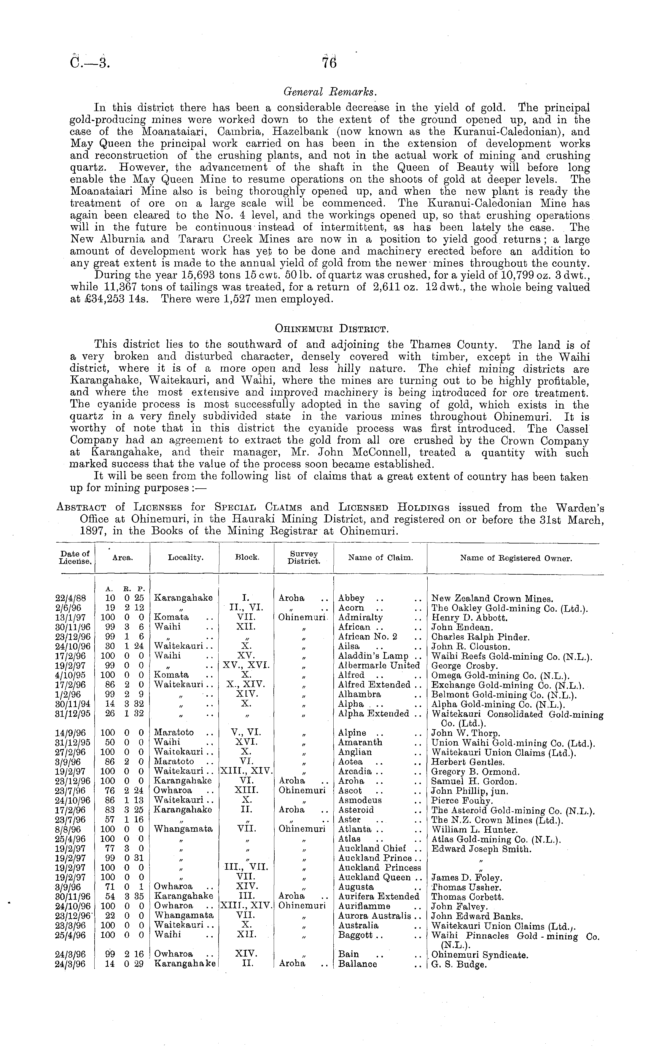 Abstract of Licenses for Special Claims and Licensed Holdings issued from the Warden's Office at Ohinemuri, in the Hauraki Mining District, and registered on or before the 31st March, 1897, in the Books of the Mining Registrar at Ohinemuri.