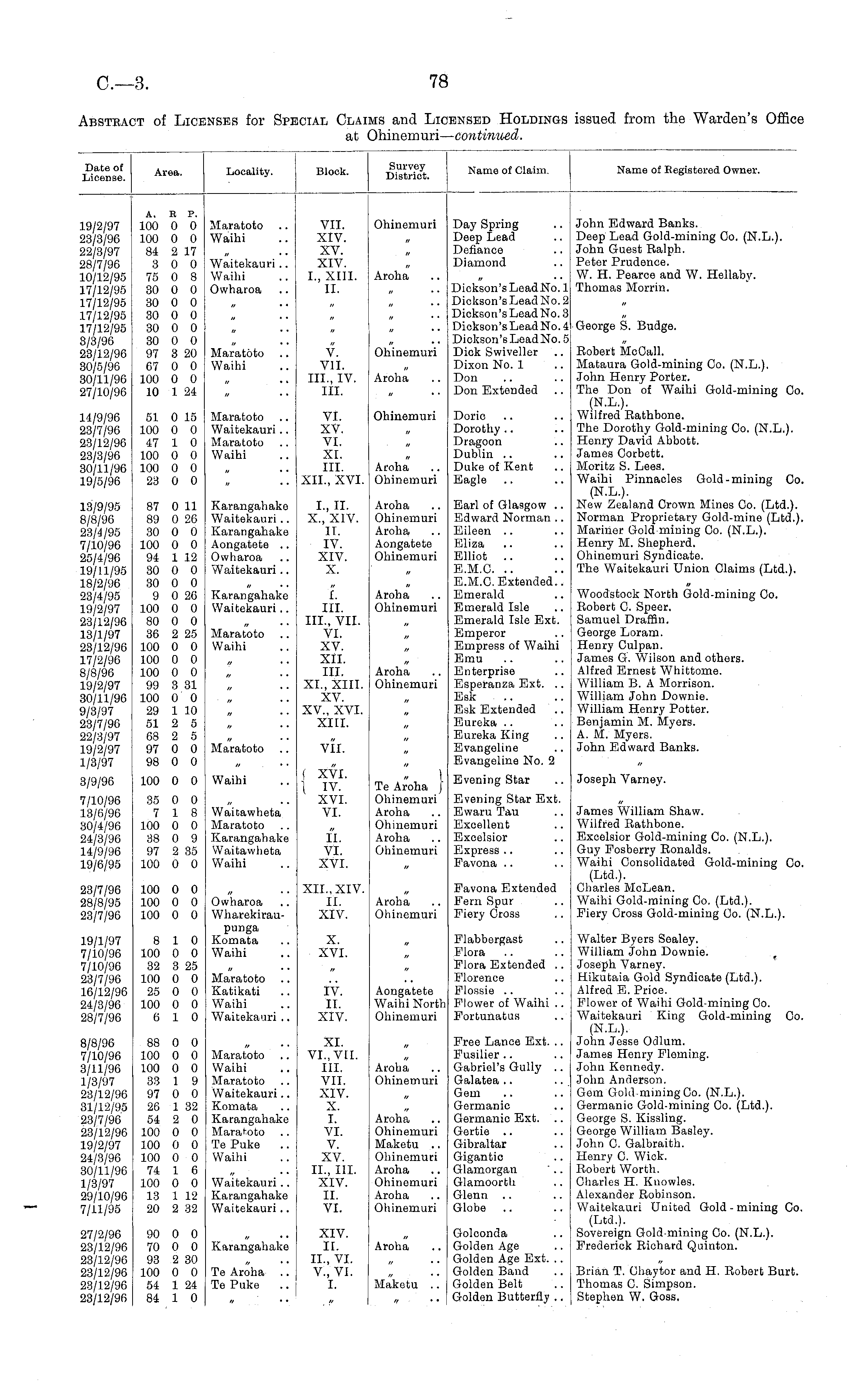Date of License. Area. Locality. Block. Survey District. Name of Claim. Name of Eegistered Owner. 19/2/97 23/3/96 22/3/97 28/7/96 10/12/95 17/12/95 17/12/95 17/12/95 17/12/95 3/3/96 23/12/96 30/5/96 30/11/96 27/10/96 A. B P. 100 0 0 100 0 0 84 2 17 3 0 0 75 0 8 30 0 0 30 0 0 30 0 0 30 0 0 30 0 0 97 3 20 67 0 0 100 0 0 10 1 24 Maratoto Waihi Waitekauri.. Waihi Owharoa VII. XIV. XV. XIV. I., XIII. II. Ohinemuri Aroha Day Spring Deep Lead Defiance Diamond Dickson'sLeadNo. 1 Dickson's Lead No. 2 Dickson's Lead No. 3 Dickson's Lead No. 4 Dickson'sLeadNo. 5 Dick Swiveller Dixon No. 1 Don Don Extended John Edward Banks. Deep Lead Gold-mining Co. (N.L.). John Guest Ralph. Peter Prudence. W. H. Pearce and W. Hellaby. Thomas Morrin. George S. Budge. 14/9/96 23/7/96 23/12/96 23/3/96 30/11/96 19/5/96 51 0 15 100 0 0 47 1 0 100 0 0 100 0 0 23 0 0 Maratoto Waihi Maratoto Waitekauri.. Maratoto Waihi V. VII. III., IV. III. VI. XV. VI. XI. III. XII., XVI. Ohinemuri Aroha Ohinemuri Aroha Ohinemuri Doric Dorothy Dragoon Dublin .. Duke of Kent Eagle Robert McCall. Mataura Gold-mining Co. (N.L.). John Henry Porter. The Don of Waihi Gold-mining Co. (N.L.). Wilfred Rathbone. The Dorothy Gold-mining Co. (N.L.). Henry David Abbott. James Corbett. Moritz S. Lees. Waihi Pinnacles Gold-mining Co. (N.L.). New Zealand Crown Mines Go. (Ltd.). Norman Proprietary Gold-mine (Ltd.). Mariner Gold-mining Oo. (N.L.). Henry M. Shepherd. Ohinemuri Syndicate. The Waitekauri Union Claims (Ltd.). 13/9/95 8/8/96 23/4/95 7/10/96 25/4/96 19/11/95 18/2/96 23/4/95 19/2/97 23/12/96 13/1/97 23/12/96 17/2/96 8/8/96 19/2/97 30/11/96 9/3/97 23/7/96 22/3/97 19/2/97 1/3/97 87 0 11 89 0 26 30 0 0 100 0 0 94 1 12 30 0 0 30 0 0 9 0 26 100 0 0 80 0 0 36 2 25 100 0 0 100 0 0 100 0 0 99 3 31 100 0 0 29 1 10 51 2 5 68 2 5 97 0 0 98 0 0 Karangahake Waitekauri .. Karangahake Aongatete .. Owharoa Waitekauri .. I., II. X., XIV. II. IV. XIV. X. Aroha Ohinemuri Aroha Aongatete Ohinemuri Earl of Glasgow .. Edward Norman .. Eileen Eliza Elliot .. E.M.C. .. E.M.C. Extended.. Emerald Emerald Isle Emerald Isle Ext. Emperor Empress of Waihi Emu Enterprise Esperanza Ext. .. Esk Esk Extended Eureka Eureka King Evangeline Evangeline No. 2 Karangahake Waitekauri.. Maratoto Waihi I. III. III., VII. VI. XV. XII. III. XL, XIII. XV. XV., XVI. XIII. Aroha Ohinemuri Aroha Ohinemuri Woodstock North Gold-mining Co. Robert C. Speer. Samuel Draffin. George Loram. Henry Culpan. James G. Wilson and others. Alfred Ernest Whittome. William B. A Morrison. William John Downie. William Henry Potter. Benjamin M. Myers. A. M. Myers. John Edward Banks. Maratoto VII. 3/9/96 100 0 0 Waihi f XVI. I iv. XVI. VI. 1 Te Aroha j Ohinemuri Aroha Ohinemuri Aroha Ohinemuri Evening Star Evening Star Ext. Ewaru Tau Excellent Excelsior Express Favona Joseph Varney. 7/10/96 13/6/96 80/4/96 24/3/96 14/9/96 19/6/95 35 0 0 7 18 100 0 0 38 0 9 97 2 35 100 0 0 Waitawheta Maratoto Karangahake Waitawheta Waihi II. VI. XVI. James William Shaw. Wilfred Rathbone. Excelsior Gold-mining Co. (N.L.). Guy Fosberry Ronalds. Waihi Consolidated Gold-mining Co. (Ltd.). Charles McLean. Waihi Gold-mining Co. (Ltd.). Fiery Cross Gold-mining Co. (N.L.). 23/7/96 28/8/95 23/7/96 100 0 0 100 0 0 100 0 0 Owharoa Wharekiraupunga Komata Waihi XII., XIV. II. XIV. Aroha Ohinemuri Favona Extended Fern Spur Fiery Cross 19/1/97 7/10/96 7/10/96 23/7/96 16/12/96 24/3/96 28/7/96 8/8/96 7/10/96 3/11/96 1/3/97 23/12/96 31/12/95 23/7/96 23/12/96 19/2/97 24/3/96 30/11/96 1/3/97 29/10/96 7/11/95 8 10 100 0 0 32 3 25 100 0 0 25 0 0 100 0 0 6 10 88 0 0 100 0 0 100 0 0 33 1 9 97 0 0 26 1 32 54 2 0 100 0 0 100 0 0 100 0 0 74 1 6 100 0 0 13 1 12 20 2 32 Maratoto Katikati Waihi Waitekauri .. Maratoto Waihi Maratoto Waitekauri.. Komata Karangahake Maratoto Te Puke .. Waihi X. XVI. IV. II. XIV. XL VI.,VII. III. VII. XIV. X. I. VI. V. XV. II., III. XIV. II. VI. Aongatete Waihi North Ohinemuri Aroha Ohinemuri Flabbergast Flora Flora Extended .. Florence Flossie .. Flower of Waihi .. Fortunatus Free Lance Ext. .. Fusilier Gabriel's Gully .. Galatea .. Gem Germanic Germanic Ext. Gertie Gibraltar Gigantio Glamorgan Glamoorth Glenn Globe Walter Byers Sealey. William John Downie. Joseph Varney. Hikutaia Gold Syndicate (Ltd.). Alfred E. Price. Flower of Waihi Gold-mining Co. Waitekauri King Gold-mining Co. (N.L.). John Jesse Odium. James Henry Fleming. John Kennedy. John Anderson. Gem Gold mining Co. (N.L.). Germanic Gold-mining Co. (Ltd.). George S. Kissling. George William Basley. John C. Galbraith. Henry 0. Wick. Robert Worth. Charles H. Knowles. Alexander Robinson. Waitekauri United Gold-mining Co. (Ltd.). Sovereign Gold-mining Co. (N.L.). Frederick Richard Quinton. Aroha Ohinemuri Maketu .. Ohinemuri Aroha Ohinemuri Aroha Ohinemuri Waitekauri .. Karangahake Waitekauri .. 27/2/96 23/12/96 23/12/96 23/12/96 23/12/96 23/12/96 90 0 0 70 0 0 93 2 30 100 0 0 54 1 24 84 1 0 Karangahake XIV. II. IL, VI. V., VI. I. Aroha Golconda Golden Age Golden Age Ext. .. Golden Band Golden Belt Golden Butterfly .. Brian T. Chaytor and H. Robert Burt. Thomas C. Simpson. Stephen W. Goss. Te Aroha Te Puke Maketu .. '/ • •