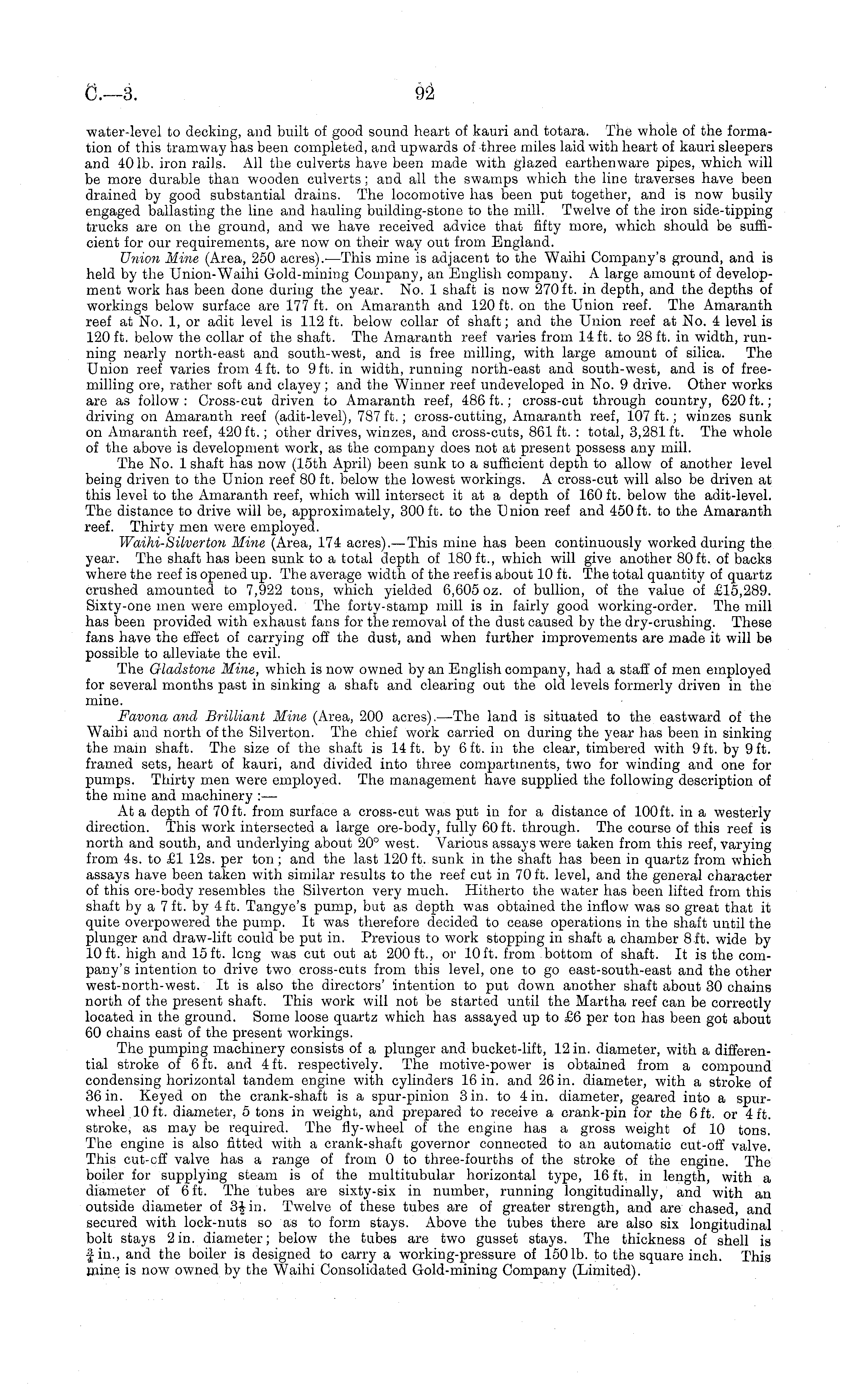 water-level to decking, and built of good sound heart of kauri and totara. The whole of the formation of this tramway has been completed, and upwards of -three miles laid with heart of kauri sleepers and 40 lb. iron rails. All the culverts have been made with glazed earthenware pipes, which will be more durable than wooden culverts; and all the swamps which the line traverses have been drained by good substantial drains. The locomotive has been put together, and is now busily engaged ballasting the line and hauling building-stone to the mill. Twelve of the iron side-tipping trucks are on the ground, and we have received advice that fifty more, which should be sufficient for our requirements, are now on their way out from England. Union Mine (Area, 250 acres).- —This mine is adjacent to the Waihi Company's ground, and is held by the Union-Waihi Gold-mining Company, an English company. A large amount of development work has been done during the year. No. 1 shaft is now 270 ft. in depth, and the depths of workings below surface are 177 ft. on Amaranth and 120 ft. on the Union reef. The Amaranth reef at No. 1, or adit level is 112 ft. below collar of shaft; and the Union reef at No. 4 level is 120 ft. below the collar of the shaft. The Amaranth reef varies from 14 ft. to 28 ft. in width, running nearly north-east and south-west, and is free milling, with large amount of silica. The Union reef varies from 4 ft. to 9 ft. in width, running north-east and south-west, and is of freemilling ore, rather soft and clayey; and the Winner reef undeveloped in No. 9 drive. Other works are as follow : Cross-cut driven to Amaranth reef, 486 ft.; cross-cut through country, 620 ft.; driving on Amaranth reef (adit-level), 787 ft.; cross-cutting, Amaranth reef, 107 ft.; winzes sunk on Amaranth reef, 420 ft.; other drives, winzes, and cross-cuts, 861 ft. : total, 3,281 ft. The whole of the above is development work, as the company does not at present possess any mill. The No. 1 shaft has now (15th April) been sunk to a sufficient depth to allow of another level being driven to the Union reef 80 ft. below the lowest workings. A cross-cut will also be driven at this level to the Amaranth reef, which will intersect it at a depth of 160 ft. below the adit-level. The distance to drive will be, approximately, 300 ft. to the Union reef and 450 ft. to the Amaranth reef. Thirty men were employed. Waihi-Silverton Mine (Area, 174 acres). — This mine has been continuously worked during the year. The shaft has been sunk to a total depth of 180 ft., which will give another 80 ft. of backs where the reef is opened up. The average width of the reef is about 10 ft. The total quantity of quartz crushed amounted to 7,922 tons, which yielded 6,605 oz. of bullion, of the value of £15,289. Sixty-one men were employed. The forty-stamp mill is in fairly good working-order. The mill has been provided with exhaust fans for the removal of the dust caused by the dry-crushing. These fans have the effect of carrying off the dust, and when further improvements are made it will be possible to alleviate the evil. The Gladstone Mine, which is now owned by an English company, had a staff of men employed for several months past in sinking a shaft and clearing out the old levels formerly driven in the mine. Favona and Brilliant Mine (Area, 200 acres). —The land is situated to the eastward of the Waihi and north of the Silverton. The chief work carried on during the year has been in sinking the mam shaft. The size of the shaft is 14 ft. by 6 ft. in the clear, timbered with 9 ft. by 9 ft. framed sets, heart of kauri, and divided into three compartments, two for winding and one for pumps. Thirty men were employed. The management have supplied the following description of the mine and machinery : — At a depth of 70ft. from surface a cross-cut was put in for a distance of 100 ft. in a westerly direction. This work intersected a large ore-body, fully 60 ft. through. The course of this reef is north and south, and underlying about 20° west. Various assays were taken from this reef, varying from 4s. to £1 12s. per ton; and the last 120 ft. sunk in the shaft has been in quartz from which assays have been taken with similar results to the reef cut in 70 ft. level, and the general character of this ore-body resembles the Silverton very much. Hitherto the water has been lifted from this shaft by a 7 ft. by 4 ft. Tangye's pump, but as depth was obtained the inflow was so great that it quite overpowered the pump. It was therefore decided to cease operations in the shaft until the plunger and draw-lift could be put in. Previous to work stopping in shaft a chamber Bft. wide by 10 ft. high and 15 ft. long was cut out at 200 ft., or 10 ft. from bottom of shaft. It is the company's intention to drive two cross-cuts from this level, one to go east-south-east and the other west-north-west. It is also the directors' intention to put down another shaft about 30 chains north of the present shaft. This work will not be started until the Martha reef can be correctly located in the ground. Some loose quartz which has assayed up to £6 per ton has been got about 60 chains east of the present workings. The pumping machinery consists of a plunger and bucket-lift, 12 in. diameter, with a differential stroke of 6 ft. and 4 ft. respectively. The motive-power is obtained from a compound condensing horizontal tandem engine with cylinders 16 in. and 26 in. diameter, with a stroke of 36 in. Keyed on the crank-shaft is a spur-pinion 3 in. to 4 in. diameter, geared into a spurwheel. 10 ft. diameter, 5 tons in weight, and prepared to receive a crank-pin for the 6 ft. or 4 ft. stroke, as may be required. The fly-wheel of the engine has a gross weight of 10 tons. The engine is also fitted with a crank-shaft governor connected to an automatic cut-off valve. This cut-cff valve has a range of from 0 to three-fourths of the stroke of the engine. The boiler for supplying steam is of