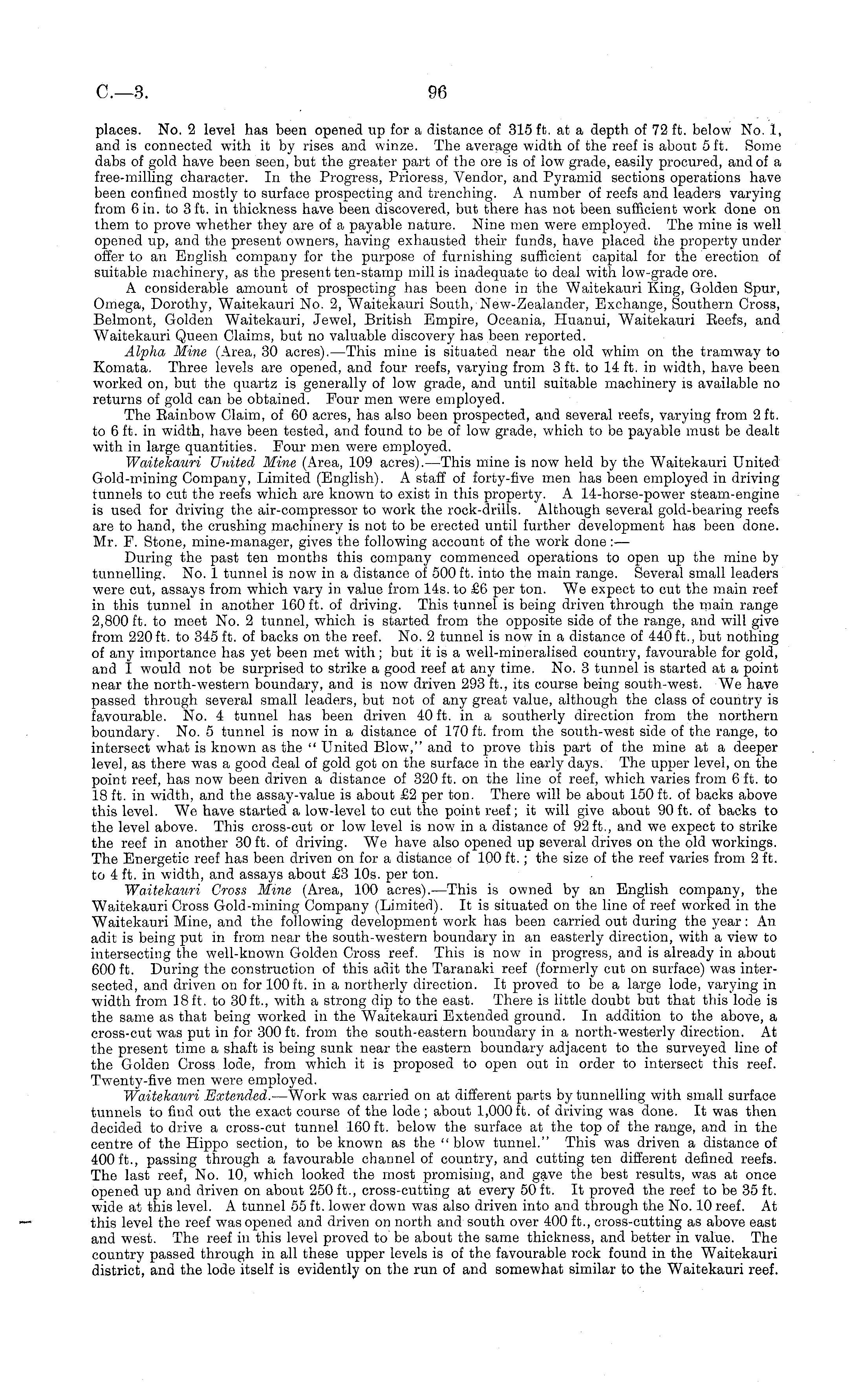 places. No. 2 level has been opened up for a distance of 315 ft. at a depth of 72 ft. below No. 1, and is connected with it by rises and winze. The average width of the reef is about 5 ft. Some dabs of gold have been seen, but the greater part of the ore is of low grade, easily procured, and of a free-milling character. In the Progress, Prioress, Vendor, and Pyramid sections operations have been confined mostly to surface prospecting and trenching. A number of reefs and leaders varying from 6 in. to 3 ft. in thickness have been discovered, but there has not been sufficient work done on them to prove whether they are of a payable nature. Nine men were employed. The mine is well opened up, and the present owners, having exhausted their funds, have placed the property under offer to an English company for the purpose of furnishing sufficient capital for the erection of suitable machinery, as the present ten-stamp mill is inadequate to deal with low-grade ore. A considerable amount of prospecting has been done in the Waitekauri King, Golden Spur, Omega, Dorothy, Waitekauri No. 2, Waitekauri South, New-Zealander, Exchange, Southern Cross, Belmont, Golden Waitekauri, Jewel, British Empire, Oceania, Huanui, Waitekauri Eeefs, and Waitekauri Queen Claims, but no valuable discovery has been reported. Alpha Mine (Area, 30 acres). —This mine is situated near the old whim on the tramway to Komata. Three levels are opened, and four reefs, varying from 3 ft. to 14 ft. in width, have been worked on, but the quartz is generally of low grade, and until suitable machinery is available no returns of gold can be obtained. Four men were employed. The Eainbow Claim, of 60 acres, has also been prospected, and several reefs, varying from 2 ft. to 6 ft. in width, have been tested, and found to be of low grade, which to be payable must be dealt with in large quantities. Four men were employed. Waitekauri United Mine (Area, 109 acres). —This mine is now held by the Waitekauri United Gold-mining Company, Limited (English). A staff of forty-five men has been employed in driving tunnels to cut the reefs which are known to exist in this property. A 14-horse-power steam-engine is used for driving the air-compressor to work the rock-drills. Although several gold-bearing reefs are to hand, the crushing machinery is not to be erected until further development has been done. Mr. F. Stone, mine-manager, gives the following account of the work done : — During the past ten months this company commenced operations to open up the mine by tunnelling. No. 1 tunnel is now in a distance of 500 ft. into the main range. Several small leaders were cut, assays from which vary in value from 14s. to £6 per ton. We expect to cut the main reef in this tunnel in another 160 ft. of driving. This tunnel is being driven through the main range 2,800 ft. to meet No. 2 tunnel, which is started from the opposite side of the range, and will give from 220 ft. to 345 ft. of backs on the reef. No. 2 tunnel is now in a distance of 440 ft., but nothing of any importance has yet been met with; but it is a well-mineralised country, favourable for gold, and I would not be surprised to strike a good reef at any time. No. 3 tunnel is started at a point near the north-western boundary, and is now driven 293 ft., its course being south-west. We have passed through several small leaders, but not of any great value, although the class of country is favourable. No. 4 tunnel has been driven 40 ft. in a southerly direction from the northern boundary. No. 5 tunnel is now in a distance of 170 ft. from the south-west side of the range, to intersect what is known as the " United Blow," and to prove this part of the mine at a deeper level, as there was a good deal of gold got on the surface in the early days. The upper level, on the point reef, has now been driven a distance of 320 ft. on the line of reef, which varies from 6 ft. to 18 ft. in width, and the assay-value is about £2 per ton. There will be about 150 ft. of backs above this level. We have started a low-level to cut the point reef; it will give about 90ft. of backs to the level above. This cross-cut or low level is now in a distance of 92 ft., and we expect to strike the reef in another 30 ft. of driving. We have also opened up several drives on the old workings. The Energetic reef has been driven on for a distance of 100 ft.; the size of the reef varies from 2 ft. to 4 ft. in width, and assays about £3 10s. per ton. Waitekauri Gross Mine (Area, 100 acres). —This is owned by an English company, the Waitekauri Cross Gold-mining Company (Limited). It is situated on the line of reef worked in the Waitekauri Mine, and the following development work has been carried out during the year: An adit is being put in from near the south-western boundary in an easterly direction, with a view to intersecting the well-known Golden Cross reef. This is now in progress, and is already in about 600 ft. During the construction of this adit the Taranaki reef (formerly cut on surface) was intersected, and driven on for 100 ft. in a northerly direction. It proved to be a large lode, varying in width from 18 ft. to 30ft., with a strong dip to the east. There is little doubt but that this lode is the same as that being worked in the Waitekauri Extended ground. In addition to the above, a cross-cut was put in for 300 ft. from the south-eastern boundary in a north-westerly direction. At the present time a shaft is being sunk near the eastern boundary adjacent to the surveyed line of the Golden Cross lode, from which it is proposed to open out in order to intersect this reef. Twenty-five men were employed. Waitekauri Extended. —Work was carried on at different parts by tunnelling with small surface tunnels to find out the exact course of the lode; about I,oooft. of driving was done. It was then decided to drive a cross-cut tunnel 160 ft. below the surface at the top of the range, and in the centre of the Hippo section, to b