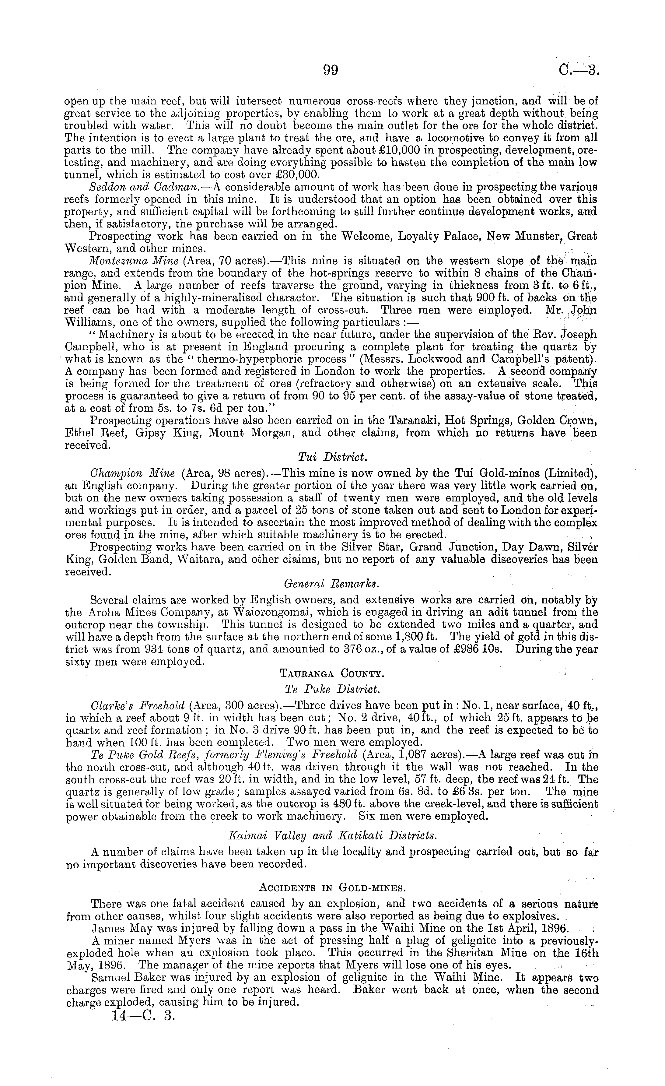 open up the main reef, but will intersect numerous cross-reefs where they junction, and will be of great service to the adjoining properties, by enabling them to work at a great depth without being troubled with water. This will no doubt become the main outlet for the ore for the whole district. The intention is to erect a large plant to treat the ore, and have a locomotive to convey it from all parts to the mill. The company have already spent about £10,000 in prospecting, development, oretesting, and machinery, and are doing everything possible to hasten the completion of the main low tunnel, which is estimated to cost over £30,000. Seddon and Cadman. —A considerable amount of work has been done in prospecting the various reefs formerly opened in this mine. It is understood that an option has been obtained over this property, and sufficient capital will be forthcoming to still further continue development works, and then, if satisfactory, the purchase will be arranged. Prospecting work has been carried on in the Welcome, Loyalty Palace, New Munster, Great Western, and other mines. Montezuma Mine (Area, 70 acres). —This mine is situated on the western slope of the main range, and extends from the boundary of the hot-springs reserve to within 8 chains of the Champion Mine. A large number of reefs traverse the ground, varying in thickness from 3 ft. to 6 ft., and generally of a highly-mineralised character. The situation is such that 900 ft. of backs on the reef can be had with a moderate length of cross-cut. Three men were employed. Mr. John Williams, one of the owners, supplied the following particulars : — " Machinery is about to be erected in the near future, under the supervision of the Eev. Joseph Campbell, who is at present in England procuring a complete plant for treating the quartz by what is known as the " thermo-hyperphoric process" (Messrs. Lockwood and Campbell's patent). A company has been formed and registered in London to work the properties. A second company is being formed for the treatment of ores (refractory and otherwise) on an extensive scale. This process is guaranteed to give a return of from 90 to 95 per cent, of the assay-value of stone treated, at a cost of from ss. to 7s. 6d per ton." Prospecting operations have also been carried on in the Taranaki, Hot Springs, Golden Crown, Ethel Eeef, Gipsy King, Mount Morgan, and other claims, from which no returns have been received. Tui District. Champion Mine (Area, 98 acres). —This mine is now owned by the Tui Gold-mines (Limited), an English company. During the greater portion of the year there was very little work carried on, but on the new owners taking possession a staff of twenty men were employed, and the old levels and workings put in order, and a parcel of 25 tons of stone taken out and sent to London for experimental purposes. It is intended to ascertain the most improved method of dealing with the complex ores found in the mine, after which suitable machinery is to be erected. Prospecting works have been carried on in the Silver Star, Grand Junction, Day Dawn, Silver King, Golden Band, Waitara, and other claims, but no report of any valuable discoveries has been received. General Bemarks. Several claims are worked by English owners, and extensive works are carried on, notably by the Aroha Mines Company, at Waiorongomai, which is engaged in driving an adit tunnel from the outcrop near the township. This tunnel is designed to be extended two miles and a quarter, and will have a depth from the surface at the northern end of some 1,800 ft. The yield of gold in this district was from 934 tons of quartz, and amounted to 376 oz., of a value of £986 10s. During the year sixty men were employed. Tauranga County. ; Te Puke District. Clarke's Freehold (Area, 300 acres). —Three drives have been put in : No. 1, near surface, 40 ft., in which a reef about 9 ft. in width has been cut; No. 2 drive, 40 ft., of which 25 ft. appears to be quartz and reef formation; in No. 3 drive 90ft. has been put in, and the reef is expected to be to hand when 100 ft. has been completed. Two men were employed. Te Puke Gold Beefs, formerly Fleming's Freehold (Area, 1,087 acres). —A large reef was cut in the north cross-cut, and although 40 ft. was driven through it the wall was not reached. In the south cross-cut the reef was 20 ft. in width, and in the low level, 57 ft. deep, the reef was 24 ft. The quartz is generally of low grade ; samples assayed varied from 6s. Bd. to £6 3s. per ton. The mine is well situated for being worked, as the outcrop is 480 ft. above the creek-level, and there is sufficient power obtainable from the creek to work machinery. Six men were employed. Kaimai Valley and Katikati Districts. A number of claims have been taken up in the locality and prospecting carried out, but so far no important discoveries have been recorded. Accidents in Gold-mines. There was one fatal accident caused by an explosion, and two accidents of a serious nature from other causes, whilst four slight accidents were also reported as being due to explosives. James May was injured by falling down a pass in the Waihi Mine on the Ist April, 1896. A miner named Myers was in the act of pressing half a plug of gelignite into a previouslyexploded hole when an explosion took place. This occurred in the Sheridan Mine on the 16th May, 1896. The manager of the mine reports that Myers will lose one of his eyes. Samuel Baker was injured by an explosion of gelignite in the Waihi Mine. It appears two charges were fired and only one report was heard. Baker went back at once, when the second charge exploded, causing him to be injured. 14—C. 3.