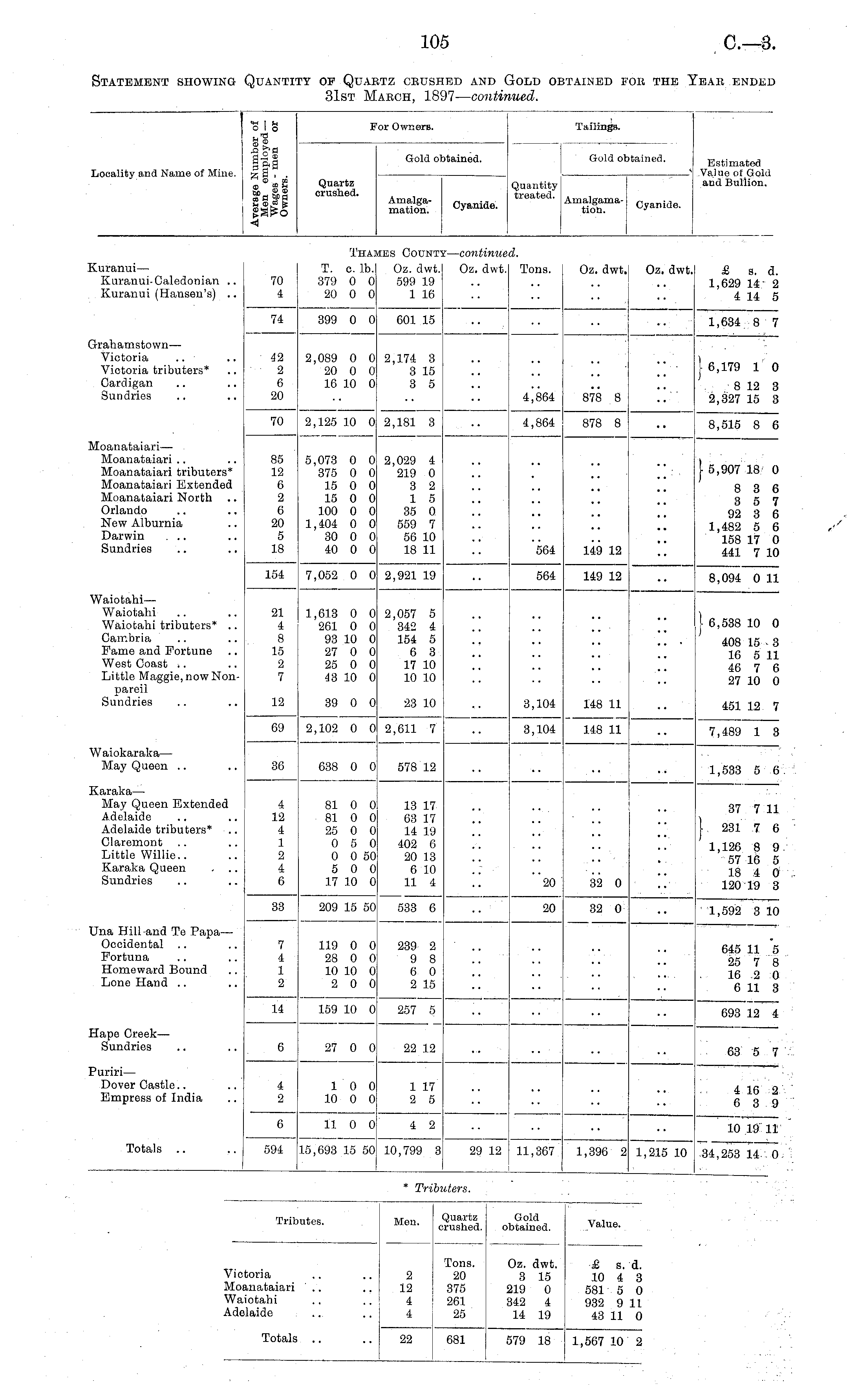 Tributes. Men. Quartz crushed. Gold obtained. Value. Victoria Moanataiari Waiotahi Adelaide 2 12 4 4 Tons. 20 375 261 25 Oz. dwt. 3 15 219 0 342 4 14 19 £ s. d. 10 4 3 581 5 0 932 9 11 43 11 0 Totals .. 22 681 579 18 1,567 10 2