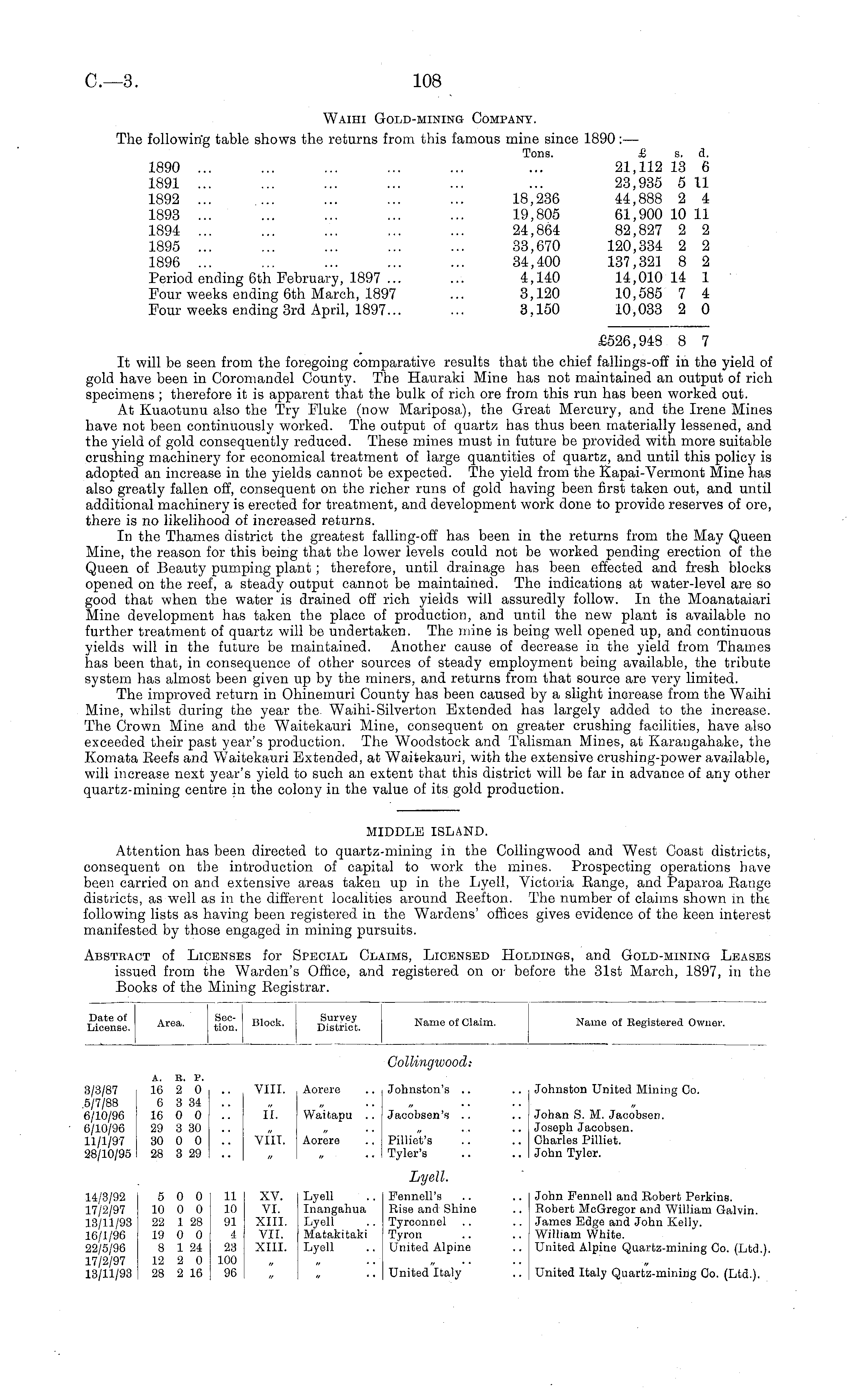 MIDDLE ISLAND. Attention has been directed to quartz-mining in the Collingwood and West Coast districts, consequent on the introduction of capital to work the mines. Prospecting operations have been carried on and extensive areas taken up in the Lyell, Victoria Eange, and Paparoa Eange districts, as well as in the different localities around Eeefton. The number of claims shown in the following lists as having been registered in the Wardens' offices gives evidence of the keen interest manifested by those engaged in mining pursuits.