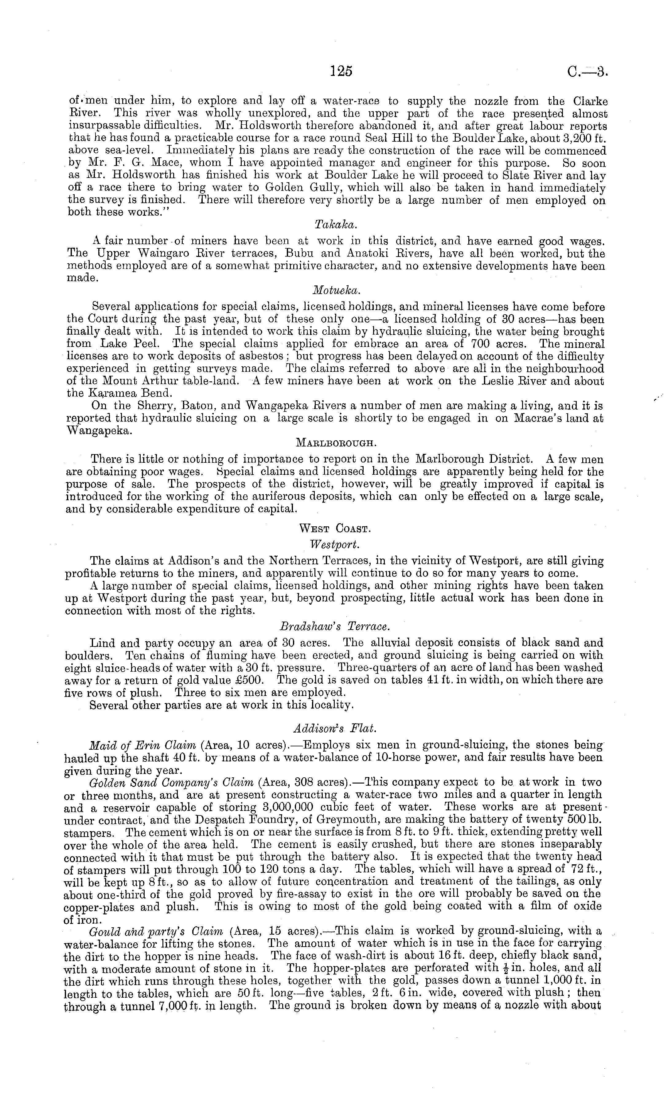 of-men under him, to explore and lay off a water-race to supply the nozzle from the Clarke River. This river was wholly unexplored, and the upper part of the race presented almost insurpassable difficulties. Mr. Holdsworth therefore abandoned it, and after great labour reports that he has found a practicable course for a race round Seal Hill to the Boulder Lake, about 3,200 ft. above sea-level. Immediately his plans are ready the construction of the race will be commenced by Mr. F. G. Mace, whom I have appointed manager and engineer for this purpose. So soon as Mr. Holdsworth has finished his work at Boulder Lake he will proceed to Slate River and lay off a race there to bring water to Golden Gully, which will also be taken in hand immediately the survey is finished. There will therefore very shortly be a large number of men employed on both these works." Takaka. A fair number of miners have been at work in this district, and have earned good wages. The Upper Waingaro River terraces, Bubu and Anatoki Rivers, have all been worked, but the methods employed are of a somewhat primitive character, and no extensive developments have been made. Motueka. Several applications for special claims, licensed holdings, and mineral licenses have come before the Court during the past year, but of these only one—a licensed holding of 30 acres—has been finally dealt with. It is intended to work this claim by hydraulic sluicing, the water being brought from Lake Peel. The special claims applied for embrace an area of 700 acres. The mineral licenses are to work deposits of asbestos; but progress has been delayed on account of the difficulty experienced in getting surveys made. The claims referred to above are all in the neighbourhood of the Mount Arthur table-land. A few miners have been at work on the Leslie River and about the Karamea Bend. On the Sherry, Baton, and Wangapeka Rivers a number of men are making a living, and it is reported that hydraulic sluicing on a large scale is shortly to be engaged in on Macrae's land at Wangapeka. Marlborough. There is little or nothing of importance to report on in the Marlborough District. A few men are obtaining poor wages. Special claims and licensed holdings are apparently being held for the purpose of sale. The prospects of the district, however, will be greatly improved if capital is introduced for the working of the auriferous deposits, which can only be effected on a large scale, and by considerable expenditure of capital. West Coast. Westport. The claims at Addison's and the Northern Terraces, in the vicinity of Westport, are still giving profitable returns to the miners, and apparently will continue to do so for many years to come. A large number of special claims, licensed holdings, and other mining rights have been taken up at Westport during the past year, but, beyond prospecting, little actual work has been done in connection with most of the rights. Bradshaw's Terrace. Lind and party occupy an area of 30 acres. The alluvial deposit consists of black sand and boulders. Ten chains of fluming have been erected, and ground sluicing is being carried on with eight sluice-heads of water with a3O ft. pressure. Three-quarters of an acre of land has been washed away for a return of gold value £500. The gold is saved on tables 41 ft. in width, on which there are five rows of plush. Three to six men are employed. Several other parties are at work in this locality. Addison's Flat. Maid of Erin Claim (Area, 10 acres). —Employs six men in ground-sluicing, the stones being hauled up the shaft 40 ft. by means of a water-balance of 10-horse power, and fair results have been given during the year. Golden Sand Company's Claim (Area, 308 acres). —This company expect to be at work in two or three months, and are at present constructing a water-race two miles and a quarter in length and a reservoir capable of storing 3,000,000 cubic feet of water. These works are at present under contract, and the Despatch Foundry, of Greymouth, are making the battery of twenty 5001b. stampers. The cement which is on or near the surface is from 8 ft. to 9 ft. thick, extending pretty well over the whole of the area held. The cement is easily crushed, but there are stones inseparably connected with it that must be put through the battery also. It is expected that the twenty head of stampers will put through 100 to 120 tons a day. The tables, which will have a spread of 72 ft., will be kept up Bft., so as to allow of future concentration and treatment of the tailings, as only about one-third of the gold proved by fire-assay to exist in the ore will probably be saved on the copper-plates and plush. This is owing to most of the gold being coated with a film of oxide of iron. Gould and party's Claim (Area, 15 acres). —This claim is worked by ground-sluicing, with a water-balance for lifting the stones. The amount of water which is in use in the face for carrying the dirt to the hopper is nine heads. The face of wash-dirt is about 16 ft. deep, chiefly black sand, with a moderate amount of stone m it. The hopper-plates are perforated with Jin. holes, and all the dirt which runs through these holes, together with the gold, passes down a tunnel 1,000 ft. in length to the tables, which are 50 ft. long—five tables, 2 ft. 6 in. wide, covered with plush ; then through a tunnel 7,000 ft. hi length. The ground is broken down by means of a nozzle with about