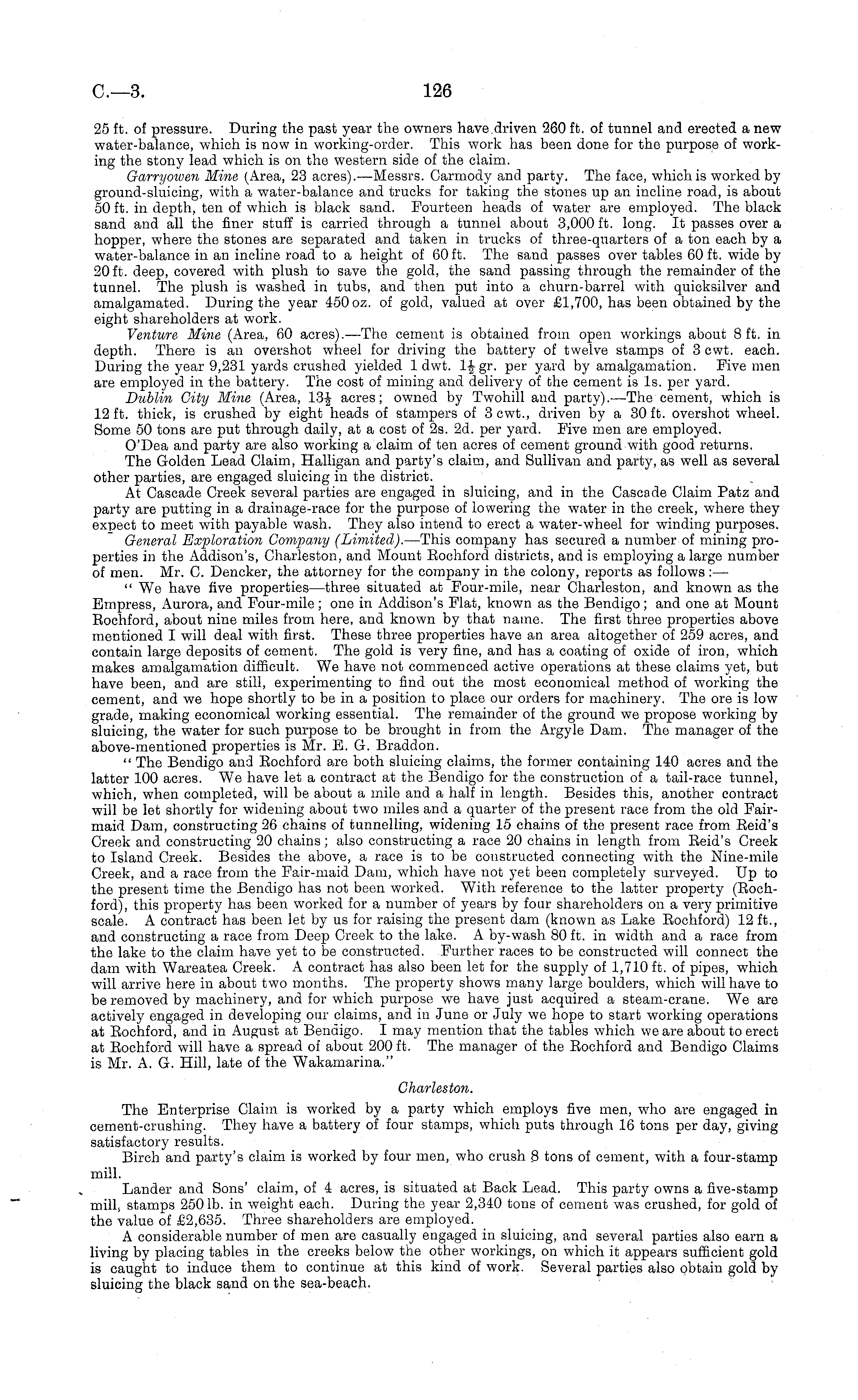 25 ft. of pressure. During the past year the owners have.driven 260 ft. of tunnel and erected a new water-balance, which is now in working-order. This work has been done for the purpose of working the stony lead which is on the western side of the claim. Garryoioen Mine (Area, 23 acres). —Messrs. Carmody and party. The face, which is worked by ground-sluicing, with a water-balance and trucks for taking the stones up an incline road, is about 50 ft. in depth, ten of which is black sand. Fourteen heads of water are employed. The black sand and all the finer stuff is carried through a tunnel about 3,000 ft. long. It passes over a hopper, where the stones are separated and taken in trucks of three-quarters of a ton each by a water-balance in an incline road to a height of 60 ft. The sand passes over tables 60 ft. wide by 20 ft. deep, covered with plush to save the gold, the sand passing through the remainder of the tunnel. The plush is washed in tubs, and then put into a churn-barrel with quicksilver and amalgamated. During the year 450 oz. of gold, valued at over £1,700, has been obtained by the eight shareholders at work. Venture Mine (Area, 60 acres). —The cement is obtained from open workings about 8 ft. in depth. There is an overshot wheel for driving the battery of twelve stamps of 3 cwt. each. During the year 9,231 yards crushed yielded 1 dwt. 1-J-gr. per yard by amalgamation. Five men are employed in the battery. The cost of mining and. delivery of the cement is Is. per yard. Dublin City Mine (Area, 13J acres; owned by Twohill and party).—The cement, which is 12 ft. thick, is crushed by eight heads of stampers of 3 cwt., driven by a 30 ft. overshot wheel. Some 50 tons are put through daily, at a cost of 2s. 2d. per yard. Five men are employed. ODea and party are also working a claim of ten acres of cement ground with good returns. The Golden Lead Claim, Halligan and party's claim, and Sullivan and party, as well as several other parties, are engaged sluicing in the district. At Cascade Creek several parties are engaged in sluicing, and in the Cascade Claim Patz and party are putting in a drainage-race for the purpose of lowering the water in the creek, where they expect to meet with payable wash. They also intend to erect a water-wheel for winding purposes. General Exploration Company (Limited). —This company has secured a number of mining properties in the Addison's, Charleston, and Mount Rochford districts, and is employing a large number of men. Mr. C. Dencker, the attorney for the company in the colony, reports as follows: — " We have five properties—three situated at Four-mile, near Charleston, and known as the Empress, Aurora, and Four-mile ; one in Addison's Flat, known as the Bendigo; and one at Mount Rochford, about nine miles from here, and known by that name. The first three properties above mentioned I will deal with first. These three properties have an area altogether of 259 acres, and contain large deposits of cement. The gold is very fine, and has a coating of oxide of iron, which makes amalgamation difficult. We have not commenced active operations at these claims yet, but have been, and are still, experimenting to find out the most economical method of working the cement, and we hope shortly to be in a position to place our orders for machinery. The ore is low grade, making economical working essential. The remainder of the ground we propose working by sluicing, the water for such purpose to be brought in from the Argyle Dam. The manager of the above-mentioned properties is Mr. E. G. Braddon. " The Bendigo and Rochford are both sluicing claims, the former containing 140 acres and the latter 100 acres. We have let a contract at the Bendigo for the construction of a tail-race tunnel, which, when completed, will be about a mile and a half in length. Besides this, another contract will be let shortly for widening about two miles and a quarter of the present race from the old Fairmaid Dam, constructing 26 chains of tunnelling, widening 15 chains of the present race from Reid's Creek and constructing 20 chains; also constructing a race 20 chains in length from Reid's Creek to Island Creek. Besides the above, a race is to be constructed connecting with the Nine-mile Creek, and a race from the Fair-maid Dam, which have not yet been completely surveyed. Up to the present time the Bendigo has not been worked. With reference to the latter property (Rochford), this property has been worked for a number of years by four shareholders on a very primitive scale. A contract has been let by us for raising the present dam (known as Lake Rochford) 12 ft., and constructing a race from Deep Creek to the lake. A by-wash 80 ft. in width and a race from the lake to the claim have yet to be constructed. Further races to be constructed will connect the dam with Wareatea Creek. A contract has also been let for the supply of 1,710 ft. of pipes, which will arrive here in about two months. The property shows many large boulders, which will have to be removed by machinery, and for which purpose we have just acquired a steam-crane. We are actively engaged in developing our claims, and in June or July we hope to start working operations at Rochford, and in August at Bendigo. I may mention that the tables which we are about to erect at Rochford will have a spread of about 200 ft. The manager of the Rochford and Bendigo Claims is Mr. A. G. Hill, late of the Wakamarina." Charleston. The Enterprise Claim is worked by a party which employs five men, who are engaged in cement-crushing. They have a battery of four stamps, which puts through 16 tons per day, giving satisfactory results. Birch and party's claim is worked by four men, who crush 8 tons of cement, with a four-stamp mill. Lander and Sons' claim, of 4 acres, is situated at Back Lead. This party owns a five-stamp mill, stamps 2501b. in weight each. During the year 2,340 tons of cement was crushed, for gold of the value of £2,635. Thr