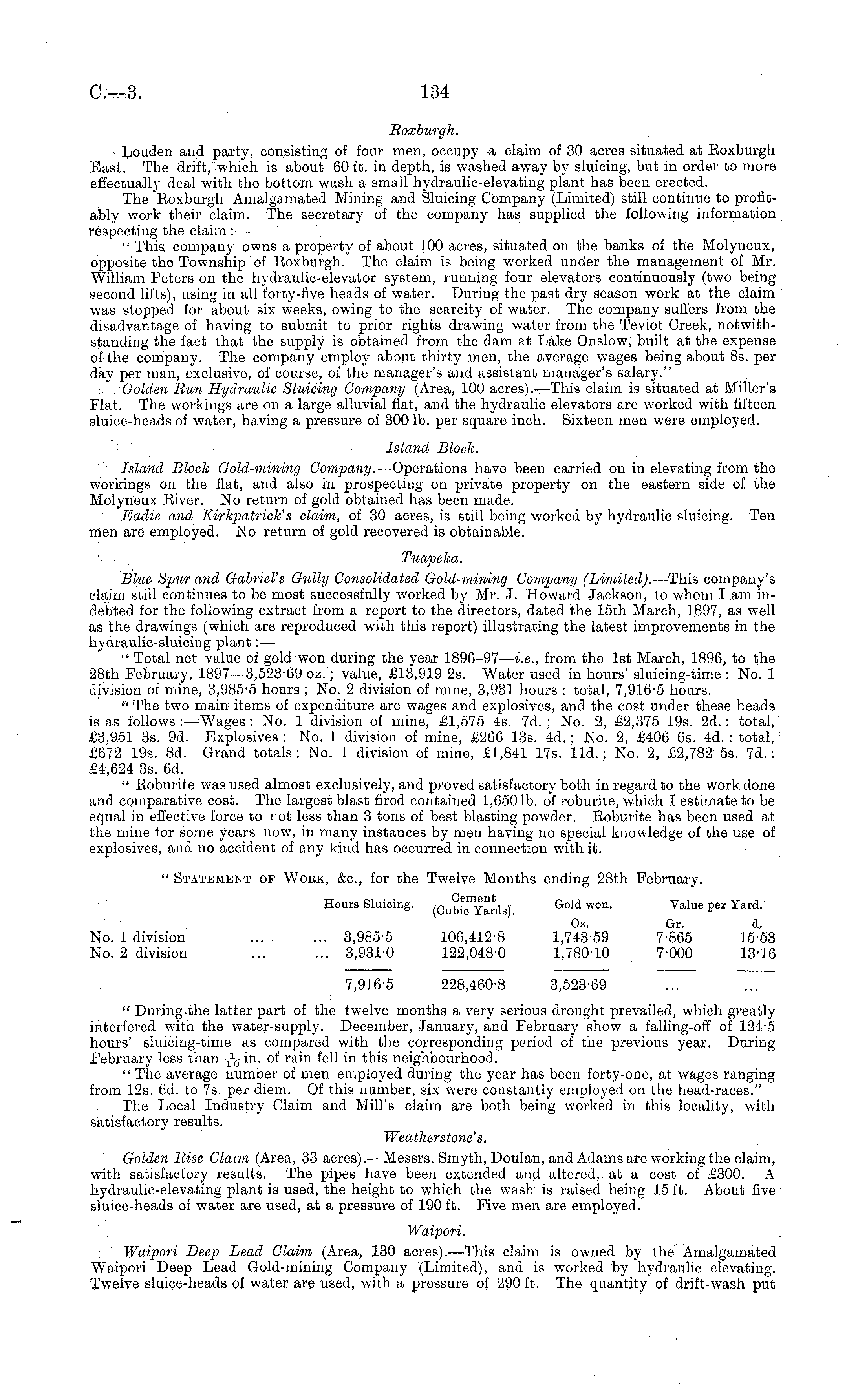 Boxburgh. Louden and party, consisting of four men, occupy a, claim of 30 acres situated at Roxburgh East. The drift, which is about 60 ft. in depth, is washed away by sluicing, but in order to more effectually deal with the bottom wash a small hydraulic-elevating plant has been erected. The Roxburgh Amalgamated Mining and Sluicing Company (Limited) still continue to profitably work their claim. The secretary of the company has supplied the following information respecting the claim : — " This company owns a property of about 100 acres, situated on the banks of the Molyneux, opposite the Township of Roxburgh. The claim is being worked under the management of Mr. William Peters on the hydraulic-elevator system, running four elevators continuously (two being second lifts), using in all forty-five heads of water. During the past dry season work at the claim was stopped for about six weeks, owing to the scarcity of water. The company suffers from the disadvantage of having to submit to prior rights drawing water from the Teviot Creek, notwithstanding the fact that the supply is obtained from the dam at Lake Onslow, built at the expense of the company. The company employ about thirty men, the average wages being about Bs. per day per man, exclusive, of course, of the manager's and assistant manager's salary." i Golden Bun Hydraulic Sluicing Company (Area, 100 acres). —This claim is situated at Miller's Flat. The workings are on a large alluvial flat, and the hydraulic elevators are worked with fifteen sluice-heads of water, having a pressure of 300 lb. per square inch. Sixteen men were employed. Island Block. Island Block Gold-mining Company. —Operations have been carried on in elevating from the workings on the flat, and also in prospecting on private property on the eastern side of the Molyneux River. No return of gold obtained has been made. Eadie and Kirkpatrick's claim, of 30 acres, is still being worked by hydraulic sluicing. Ten men are employed. No return of gold recovered is obtainable. Tuapeka. Blue Spur and Gabriel's Gully Consolidated Gold-mining Company (Limited). —This company's claim still continues to be most successfully worked by Mr. J. Howard Jackson, to whom I am indebted for the following extract from a report to the directors, dated the 15th March, 1897, as well as the drawings (which are reproduced with this report) illustrating the latest improvements in the hydraulic-sluicing plant:— " Total net value of gold won during the year 1896-97 — i.e., from the Ist March, 1896, to the 28th February, 1897—3,523-69 oz.; value, £13,919 2s. Water used in hours' sluicing-time : No. 1 division of mine, 3,985-5 hours ; No. 2 division of mine, 3,931 hours : total, 7,916-5 hours. " The two main items of expenditure are wages and explosives, and the cost under these heads is as follows :—Wages: No. 1 division of mine, £1,575 4s. 7d. ; No. 2, £2,375 19s. 2d.: total, £3,951 3s. 9d. Explosives : No. 1 division of mine, £266 13s. 4d.; No. 2, £406 6s. 4d. : total, £672 19s. Bd. Grand totals: No. 1 division of mine, £1,841 17s. lid.; No. 2, £2,782 ss. 7d.: £4,624 3s. 6d. " Roburite was used almost exclusively, and proved satisfactory both in regard to the work done and comparative cost. The largest blast fired contained 1,6501b. of roburite, which I estimate to be equal in effective force to not less than 3 tons of best blasting powder. Roburite has been used at the mine for some years now, in many instances by men having no special knowledge of the use of explosives, and no accident of any kind has occurred in connection with it. " Statement of Work, &c, for the Twelve Months ending 28th February. Hours Sluicing. (OubicYardst ol< * won ' Value per Yard. Oz. Gr. d. No. 1 division ... ... 3,985-5 106,412-8 1,743-59 7-865 15-53 No. 2 division ... ... 3,931-0 122,048-0 1,780-10 7-000 13-16 7,916-5 228,460-8 3,52369 " During.the latter part of the twelve months a very serious drought prevailed, which greatly interfered with the water-supply. December, January, and February show a falling-off of 124-5 hours' sluicing-time as compared with the corresponding period of the previous year. During February less than in. of rain fell in this neighbourhood. " The average number of men employed during the year has been forty-one, at wages ranging from 12s. 6d. to 7s. per diem. Of this number, six were constantly employed on the head-races." The Local Industry Claim and Mill's claim are both being worked in this locality, with satisfactory results. Weathers tone's. Golden Bise Claim (Area, 33 acres). —Messrs. Smyth, Doulan, and Adams are working the claim, with satisfactory results. The pipes have been extended and altered,, at a cost of £300. A hydraulic-elevating plant is used, the height to which the wash is raised being 15 ft. About five sluice-heads of water are used, at a pressure of 190 ft. Five men are employed. Waipori. Waipori Deep Lead Claim (Area, 130 acres). —This claim is owned by the Amalgamated Waipori Deep Lead Gold-mining Company (Limited), and is worked by hydraulic elevating. Twelve sluice-heads of water are used, with a pressure of 290 ft. The quantity of drift-wash put