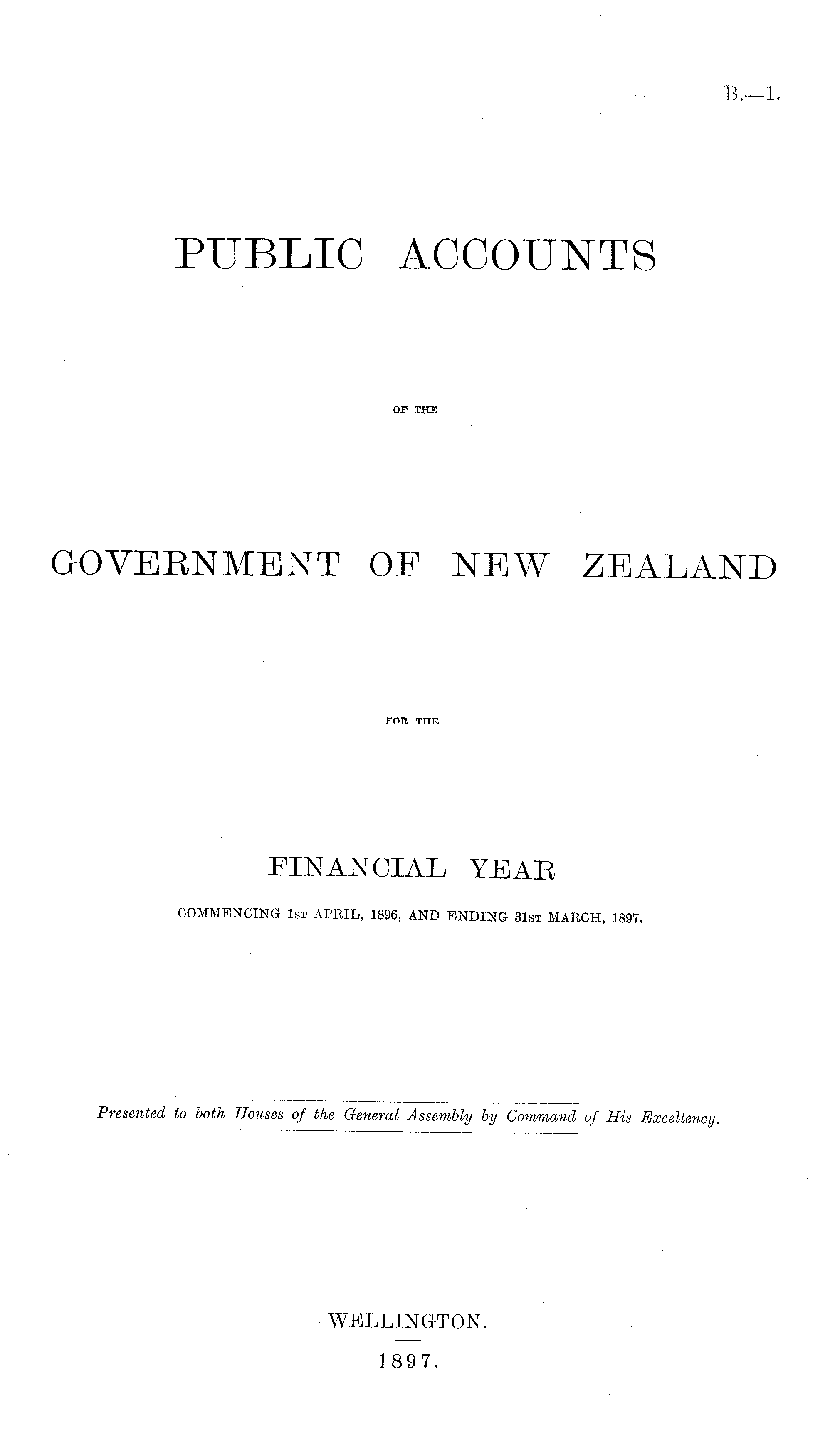 PUBLIC ACCOUNTS OF THE GOVERNMENT OF NEW ZEALAND FOR THE FINANCIAL YEAR COMMENCING 1st APRIL, 1896, AND ENDING 31st MARCH, 1897.