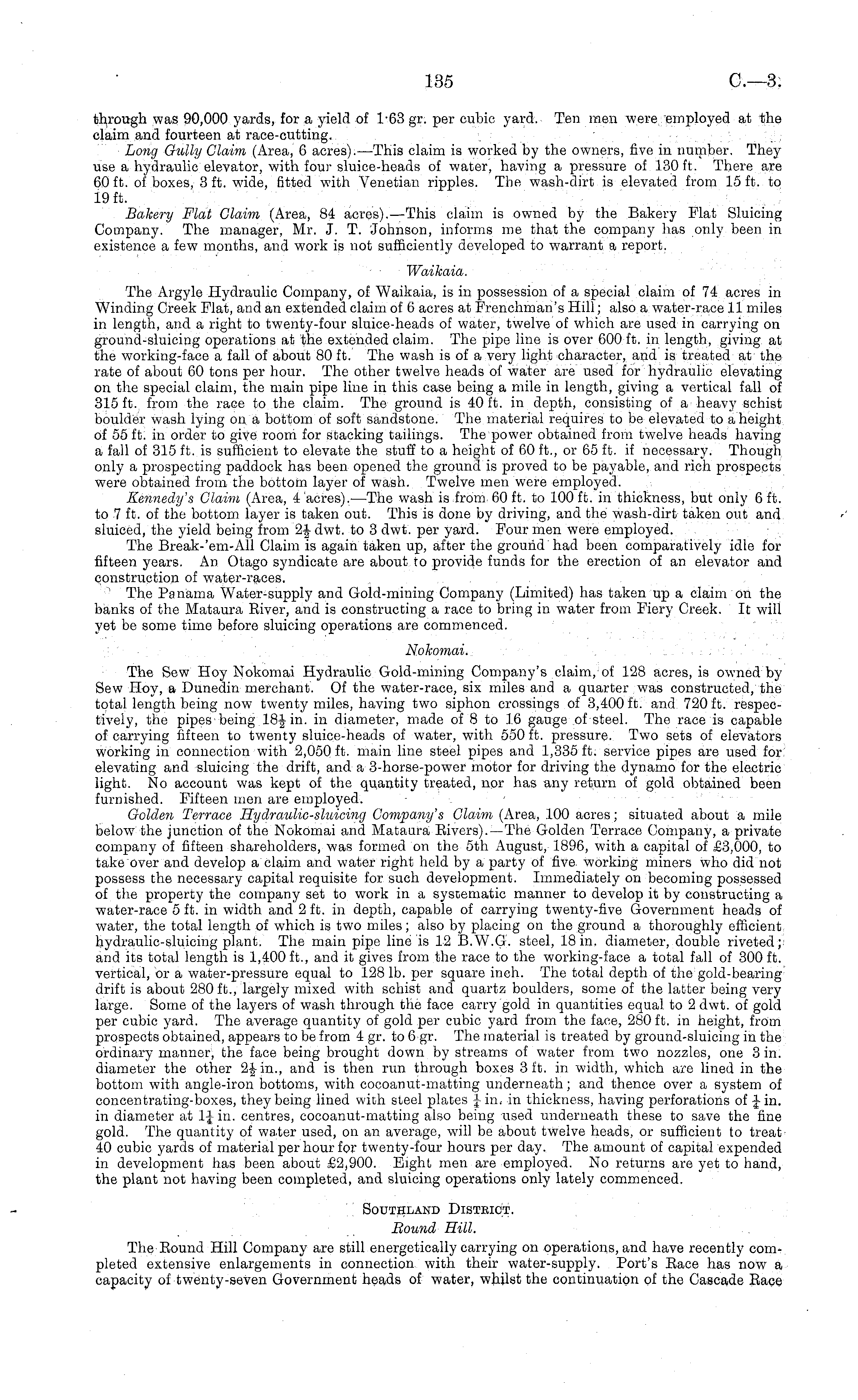 through was 90,000 yards, for a yield of 1-63 gr. per cubic yard. Ten men were employed at the claim and fourteen at race-cutting. Long Gully Claim (Area, 6 acres). —This claim is worked by the owners, five in number. They use a hydraulic elevator, with four sluice-heads of water, having a pressure of 130 ft. There are 60 ft. of boxes, 3 ft. wide, fitted with Venetian ripples. The wash-dirt is elevated from 15 ft. to 19 ft. Bakery Flat Claim (Area, 84 acres). —This claim is owned by the Bakery Flat Sluicing Company. The manager, Mr. J. T. Johnson, informs me that the company has only been in existence a few months, and work is not sufficiently developed to warrant a report. Waikaia. The Argyle Hydraulic Company, of Waikaia, is in possession of a special claim of 74 acres in Winding Creek Flat, and an extended claim of 6 acres at Frenchman's Hill; also a water-race 11 miles in length, and a right to twenty-four sluice-heads of water, twelve of which are used in carrying on ground-sluicing operations at the extended claim. The pipe line is over 600 ft. in length, giving at the working-face a fall of about 80 ft. The wash is of a very light character, and is treated at the rate of about 60 tons per hour. The other twelve heads of water are used for hydraulic elevating on the special claim, the main pipe line in this ease being a mile in length, giving a vertical fall of 315 ft. from the race to the claim. The ground is 40 ft. in depth, consisting of a heavy schist boulder wash lying on a bottom of soft sandstone. The material requires to be elevated to a height of 55 ft. in order to give room for stacking tailings. The power obtained from twelve heads having a fall of 315 ft. is sufficient to elevate the stuff to a height of 60 ft., or 65 ft. if necessary. Though only a prospecting paddock has been opened the ground is proved to be payable, and rich prospects were obtained from the bottom layer of wash. Twelve men were employed. Kennedy's Claim (Area, 4 acres). —The wash is from 60 ft. to 100 ft. in thickness, but only 6 ft. to 7 ft. of the bottom layer is taken out. This is done by driving, and the wash-dirt taken out and sluiced, the yield being from 2f-dwt. to 3 dwt. per yard. Four men were employed. The Break-em-All Claim is again taken up, after the ground had been comparatively idle for fifteen years. An Otago syndicate are about to provide funds for the erection of an elevator and construction of water-races. ■ ■ The Panama Water-supply and Gold-mining Company (Limited) has taken up a claim on the banks of the Mataura River, and is constructing a race to bring in water from Fiery Creek. It will yet be some time before sluicing operations are commenced. Nokomai. The Sew Hoy Nokomai Hydraulic Gold-mining Company's claim, of 128 acres, is owned by Sew Hoy, a Dunedin merchant. Of the water-race, six miles and a quarter was constructed, the total length being now twenty miles, having two siphon crossings of 3,400 ft. and 720 ft. respectively, the pipes being 18-J-in. in diameter, made of Bto 16 gauge of steel. The race is capable of carrying fifteen to twenty sluice-heads of water, with 550 ft. pressure. Two sets of elevators working in connection with 2,050 ft. main line steel pipes and 1,335 ft. service pipes are used for elevating and sluicing the drift, and a 3-horse-power motor for driving the dynamo for the electric light. No account was kept of the quantity treated, nor has any return of gold obtained been furnished. Fifteen men are employed. Golden Terrace Hydraulic-sluicing Company's Claim (Area, 100 acres; situated about a mile below the junction of the Nokomai and Mataura Rivers). —The Golden Terrace Company, a private company of fifteen shareholders, was formed on the sth August, 1896, with a capital of £3,000, to take over and develop a claim and water right held by a party of five working miners who did not possess the necessary capital requisite for such development. Immediately on becoming possessed of the property the company set to work in a systematic manner to develop it by constructing a water-race 5 ft. in width and 2 ft. in depth, capable of carrying twenty-five Government heads of water, the total length of which is two miles; also by placing on the ground a thoroughly efficient hydraulic-sluicing plant. The main pipe line is 12 B.W.G- steel, 18 in. diameter, double riveted; and its total length is 1,400 ft., and it gives from the race to the working-face a total fall of 300 ft. vertical, or a water-pressure equal to 128 lb. per square inch. The total depth of the gold-bearing drift is about 280 ft., largely mixed with schist and quartz boulders, some of the latter being very large. Some of the layers of wash through the face carry gold in quantities equal to 2 dwt. of gold per cubic yard. The average quantity of gold per cubic yard from the face, 280 ft. in height, from prospects obtained, appears to be from 4 gr. to 6 gr. The material is treated by ground-sluicing in the ordinary manner, the face being brought down by streams of water from two nozzles, one 3 in. diameter the other 2-J-in., and is then run through boxes 3 ft. in width, which are lined in the bottom with angle-iron bottoms, with cocoanut-matting underneath; and thence over a system of concentrating-boxes, they being lined with steel plates J in. in thickness, having perforations of J in. in diameter at ljin. centres, cocoanut-matting also being used underneath these to save the fine gold. The quantity of water used, on an average, will be about twelve heads, or sufficient to treat 40 cubic yards of material per hour for twenty-four hours per day. The amount of capital expended in development has been about £2,900. Eight men are employed. No returns are yet to hand, the plant not having been completed, and sluicing operations only lately commenced. Southland District. Bound Hill. The Round Hill Company are still energetically carrying on operations, and have recently completed extensiv