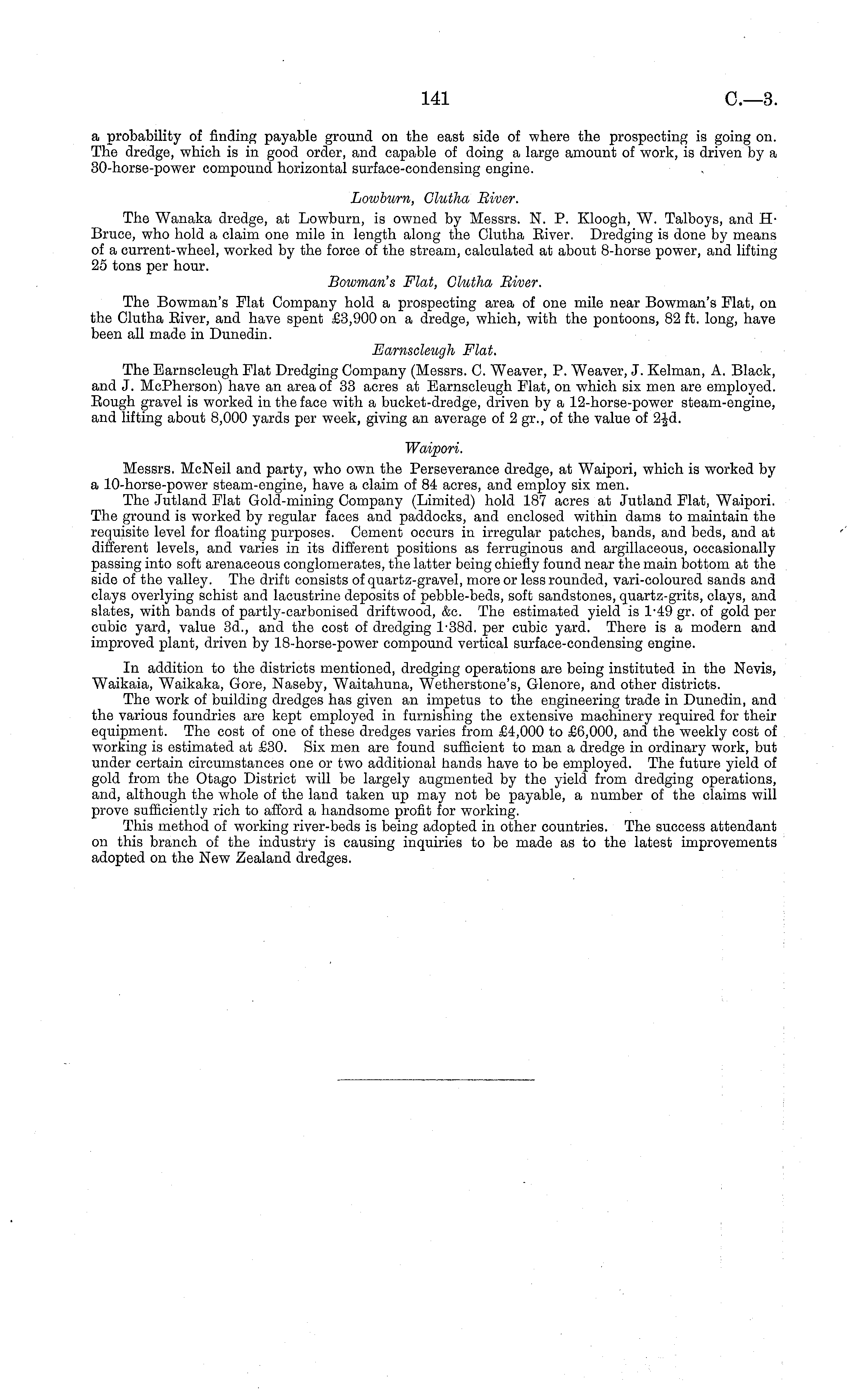 a probability of finding payable ground on the east side of where the prospecting is going on. The dredge, which is in good order, and capable of doing a large amount of work, is driven by a 30-horse-power compound horizontal surface-condensing engine. Lowburn, Clutha Biver. The Wanaka dredge, at Lowburn, is owned by Messrs. N. P. Kloogh, W. Talboys, and HBruce, who hold a claim one mile in length along the Clutha River. Dredging is done by means of a current-wheel, worked by the force of the stream, calculated at about 8-horse power, and lifting 25 tons per hour. Bowman's Flat, Clutha Biver. The Bowman's Flat Company hold a prospecting area of one mile near Bowman's Flat, on the Clutha River, and have spent £3,900 on a dredge, which, with the pontoons, 82 ft. long, have been all made in Dunedin. Earnscleugh Flat. The Earnscleugh Flat Dredging Company (Messrs. C. Weaver, P. Weaver, J. Kelman, A. Black, and J. McPherson) have an area of 33 acres at Earnscleugh Flat, on which six men are employed. Rough gravel is worked in the face with a bucket-dredge, driven by a 12-horse-power steam-engine, and lifting about 8,000 yards per week, giving an average of 2 gr., of the value of 2Jd. Waipori. Messrs. McNeil and party, who own the Perseverance dredge, at Waipori, which is worked by a 10-horse-power steam-engine, have a claim of 84 acres, and employ six men. The Jutland Flat Gold-mining Company (Limited) hold 187 acres at Jutland Flat, Waipori. The ground is worked by regular faces and paddocks, and enclosed within dams to maintain the requisite level for floating purposes. Cement occurs in irregular patches, bands, and beds, and at different levels, and varies in its different positions as ferruginous and argillaceous, occasionally passing into soft arenaceous conglomerates, the latter being chiefly found near the main bottom at the side of the valley. The drift consists of quartz-gravel, more or less rounded, vari-coloured sands and clays overlying schist and lacustrine deposits of pebble-beds, soft sandstones, quartz-grits, clays, and slates, with bands of partly-carbonised driftwood, &c. The estimated yield is 1-49 gr. of gold per cubic yard, value 3d., and the cost of dredging l-38d. per cubic yard. There is a modern and improved plant, driven by 18-horse-power compound vertical surface-condensing engine. In addition to the districts mentioned, dredging operations are being instituted in the Nevis, Waikaia, Waikaka, Gore, Naseby, Waitahuna, Wetherstone's, Glenore, and other districts. The work of building dredges has given an impetus to the engineering trade in Dunedin, and the various foundries are kept employed in furnishing the extensive machinery required for their equipment. The cost of one of these dredges varies from £4,000 to £6,000, and the weekly cost of working is estimated at £30. Six men are found sufficient to man a dredge in ordinary work, but under certain circumstances one or two additional hands have to be employed. The future yield of gold from the Otago District will be largely augmented by the yield from dredging operations, and, although the whole of the land taken up may not be payable, a number of the claims will prove sufficiently rich to afford a handsome profit for working. This method of working river-beds is being adopted in other countries. The success attendant on this branch of the industry is causing inquiries to be made as to the latest improvements adopted on the New Zealand dredges.