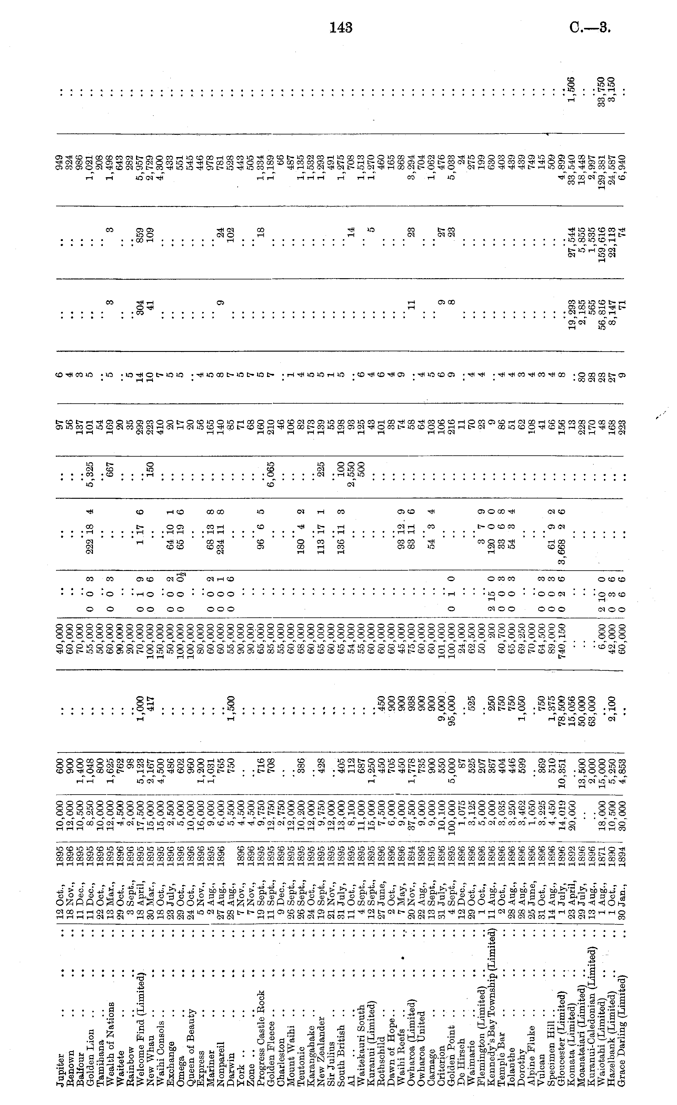 Jupiter Renown Balfour Golden Lion Tamihana Wealth of Nations Waitete Rainbow Welcome Find (Limited) New Whau Waihi Consols Exchange Omega Queen of Beauty Express Mariner Nonpareil Darwin York .. Zone Progress Castle Rock Golden Fleece .. Charleston .. .. Mount Waihi Teutonic Karangahake .. New Zealander Sir Julius South British Al .. Waitekauri South Kuranui (Limited) Rothschild Dawn of Hope.. Waihi Reefs .. ... Owharoa (Limited) Owharoa United Carnage Criterion Golden Point .. De Hirseh Waimarie Flemington (Limited) Kennedy's Bay Township (Limited) Temple Bar Iolanthe Dorothy Alpine Fluke Vulcan Specimen Hill Gloucester (Limited) Komata (Limited) . '. Moanataiari (Limited) Kuranui-Caledonian (Limited) .. Waiotahi (Limited) Hazelbank (Limited) Grace Darling (Limited) 12 Oct., 18 Nov., 11 Dec, 11 Dec, 22 Oct., 13 Mar., 29 Oct., 3 Sept., 18 April, 30 Mar., 18 Oct., 23 July, 29 Oct., 24 Oct., 5 Nov., 2 Aug., 27 Aug., 28 Aug., 7 Nov., 7 Nov., 19 Sept., 11 Sept., 9 Dec, 26 Sept., 26 Sept., 24 Oct., 19 Sept., 21 Nov., 31 July, 11 Oct., 4 Sept., 12 Sept., 27 June, 2 Oct., 7 May, 20 Nov., 22 Aug., 13 Sept., 31 July, 4 Sept., 12 Dec, 29 Oct., 1 Oct., 11 Aug., 2 Oct., 28 Aug., 28 Aug., 25 June, 31 Oct., 14 Aug., 1 July, 23 April, 29 July, 13 Aug., 1 Aug., 1 Oct., 30 Jan., 1895 1896 1895 1895 1896 1895 1896 1896 1895 1895 1895 1896 1896 1896 1896 1895 1896 1896 1896 1895 1895 1896 1895 1895 1895 1895 1895 1895 1895 1895 1895 1896 1896 1896 1894 1896 1895 1896 1895 1896 1896 1896 1896 1896 1896 1896 1896 1896 1896 1896 1892 1896 1896 1871 1890 1894 12,000 10,500 8,250 10,000 12,000 4,500 2,000 17,500 15,000 15,000 2,500 5,000 10,000 16,000 9,000 6,000 5,500 4,500 4,500 9,750 12,750 2,750 12,000 10,200 12,000 9,750 12,000 13,000 8,100 11,000 15,000 7,500 6,000 9,000 37,500 9,000 9,000 10,100 100,000 1,075 3,125 5,000 2,000 3,035 3,250 3,462 1,050 3,225 4,450 14,019 20,000 600 900 1,400 1,048 800 1,625 762 98 5,123 2,167 4,500 486 602 960 1,200 1,031 765 750 *716 708 *386 *428 405 112 687 1,250 450 705 450 1,778 735 900 550 5,000 87 525 207 367 404 446 599 1*000 417 1*500 60,000 70,000 55,000 50,000 60,000 90,000 20,000 70,000 100,000 150,000 50,000 100,000 100,000 80,000 60,000 60,000 55,000 90,000 90,000 65,000 85,000 55,000 60,000 68,000 60,000 65,000 60,000 65,000 54,000 55,000 60,000 60,000 60,000 45,000 75,000 60,000 60,000 101,000 100,000 24,000 62,500 50,000 200 60,700 65,000 69,250 70,000 64,500 89,000 740,150 •• 0 6' 3 0 6' 3 0 i' 9 0 0 6 0 6' 2 0 0 OJ 0 0 2 0 0 1 0 0 6 222*18 4 117 6 64*10 1 65 19 6 68*13 8 234 11 8 96**6 5 180**4 2 113*17 1 136*11 3 5 1325 *667 150 6,065 *225 100 2,550 500 56 137 101 54 169 20 35 299 223 410 20 17 20 56 165 140 85 71 68 160 210 46 106 82 173 139 55 198 93 125 43 101 38 74 58 64 103 106 216 11 70 23 9 86 51 62 108 41 66 156 13 228 170 48 168 223 4 3 5 *5 5 14 10 7 5 5 4 5 8 7 5 7 5 7 1 4 5 5 1 5 3 *304 41 9 3 859 109 **24 102 18 "l4 324 986 1,021 208 1,498 643 282 5,957 2,729 4,300 433 551 545 446 978 781 528 443 505 1,334 1,189 66 487 1,135 1,532 1,293 491 1,275 708 1,513 1,270 460 165 868 3,294 704 1,062 476 5,033 24 275 199 630 403 439 439 749 145 509 4,899 33,540 18,448 2,997 129,381 24,587 6,940 450 900 900 938 900 900 9,000 95,000 6 4 6 4 9 5 •• 9312. 9 83 11 6 "ll **23 54**3 4 4 5 6 9 **27 23 o i o 9 8 *525 3 7 9 120 0 0 33 6 8 54 3 4 4 4 250 750 750 1,050 2 15 0 0 0 3 0 0 3 4 4 3 4 3 4 8 369 510 10,351 750 1,375 78,500 15,056 50,000 63,000 0 0 3 0 0 3 0 2 6 61**9 2 3,668 2 6 18,000 10,500 30,000 13,500 2,000 15,000 5,250 4,853 6,000 42,000 60,000 2 10 0 0 3 6 0 6 6 80 28 28 27 9 19,293 2,185 565 56,816 8,147 71 27,544 5,855 1,535 159,616 22,113 74 1*501 33' 751 3,151 2*100