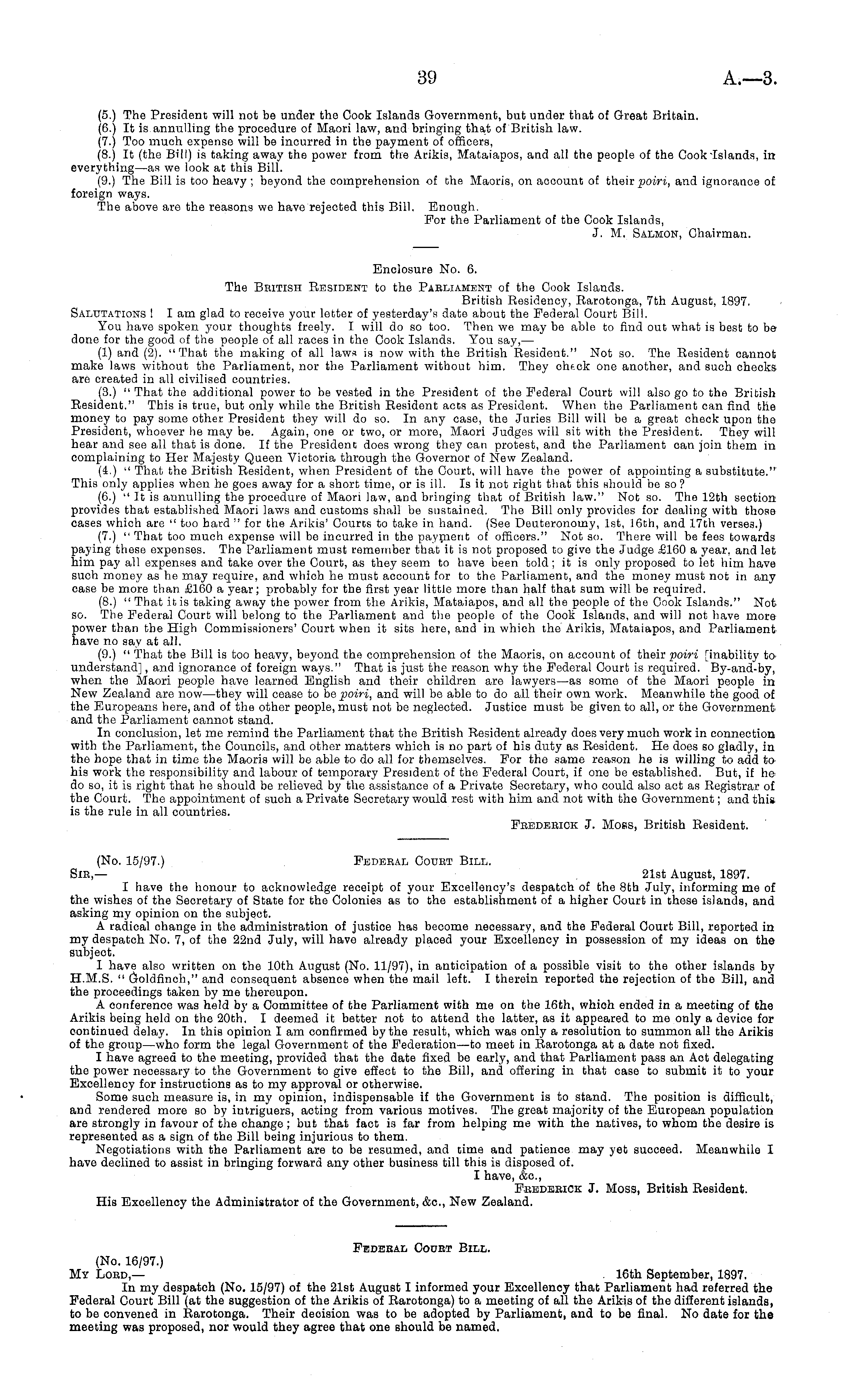 Enclosure No. 6. The British Resident to the Parliament of the Cook Islands. British Residency, Rarotonga, 7th August, 1897. Salutations ! I am glad to receive your letter of yesterday's date about the Federal Court Bill. You have spoken your thoughts freely. I will do so too, Then we may be able to find out what is best to be done for the good of the people of all races in the Cook Islands. You say,— (1) and (2). "That the making of all laws is now with the British Resident." Not so. The Resident cannot make laws without the Parliament, nor the Parliament without him. They chtck one another, and such checks are created in all civilised countries. (3.) " That the additional power to be vested in the President of the Federal Court will also go to the British Resident." This is true, but only while the British Resident acts as President. When the Parliament can find the money to pay some other President they will do so. In any case, the Juries Bill will be a great check upon the President, whoever he may be. Again, one or two, or more, Maori Judges will sit with the President. They will hear and see all that is done. If the President does wrong they can protest, and the Parliament can join them in complaining to Her Majesty Queen Victoria through the Governor of New Zealand. (4.) " That the British Resident, when President of the Court, will have the power of appointing a substitute." This only applies when he goes away for a short time, or is ill. Is it not right that this should be so? (6.) "It is annulling the procedure of Maori law, and bringing that of British law." Not so. The 12th section provides that established Maori laws and customs shall be sustained. The Bill only provides for dealing with those cases which are " too hard " for the Arikis' Courts to take in hand. (See Deuteronomy, Ist, 16th, and 17th verses.) (7.) " That too much expense will be incurred in the payment of officers." Not so. There will be fees towards paying these expenses. The Parliament must remember that it is not proposed to give the Judge £160 a year, and let him pay all expenses and take over the Court, as they seem to have been told; it is only proposed to let him have such money as he may require, and which he must account for to the Parliament, and the money must not in any case be more than £160 a year; probably for the first year little more than half that sum will be required. (8.) " That it is taking away the power from the Arikis, Mataiapos, and all the people of the Cook Islands." Not so. The Federal Court will belong to the Parliament and the people of the Cook Islands, and will not have more power than the High Commissioners' Court when it sits here, and in which the Arikis, Mataiapos, and Parliament have no say at all. (9.) " That the Bill is too heavy, beyond the comprehension of the Maoris, on account of their poiri [inability to understand], and ignorance of foreign ways." That is just the reason why the Federal Court is required. By-and-by, when the Maori people have learned English and their children are lawyers—as some of the Maori people in New Zealand are now—they will cease to be poiri, and will be able to do all their own work. Meanwhile the good of the Europeans here, and of the other people, must not be neglected. Justice must be given to all, or the Government and the Parliament cannot stand. In conclusion, let me remind the Parliament that the British Resident already does very much work in connection with the Parliament, the Councils, and other matters which is no part of his duty as Resident. He does so gladly, in the hope that in time the Maoris will be able to do all for themselves. For the same reason he is willing to add to his work the responsibility and labour of temporary President of the Federal Court, if one be established. But, if he do so, it is right that ho should be relieved by the assistance of a Private Secretary, who could also act as Registrar of the Court. The appointment of such a Private Secretary would rest with him and not with the Government; and this is the rule in all countries. Frederick J. Moss, British Resident.