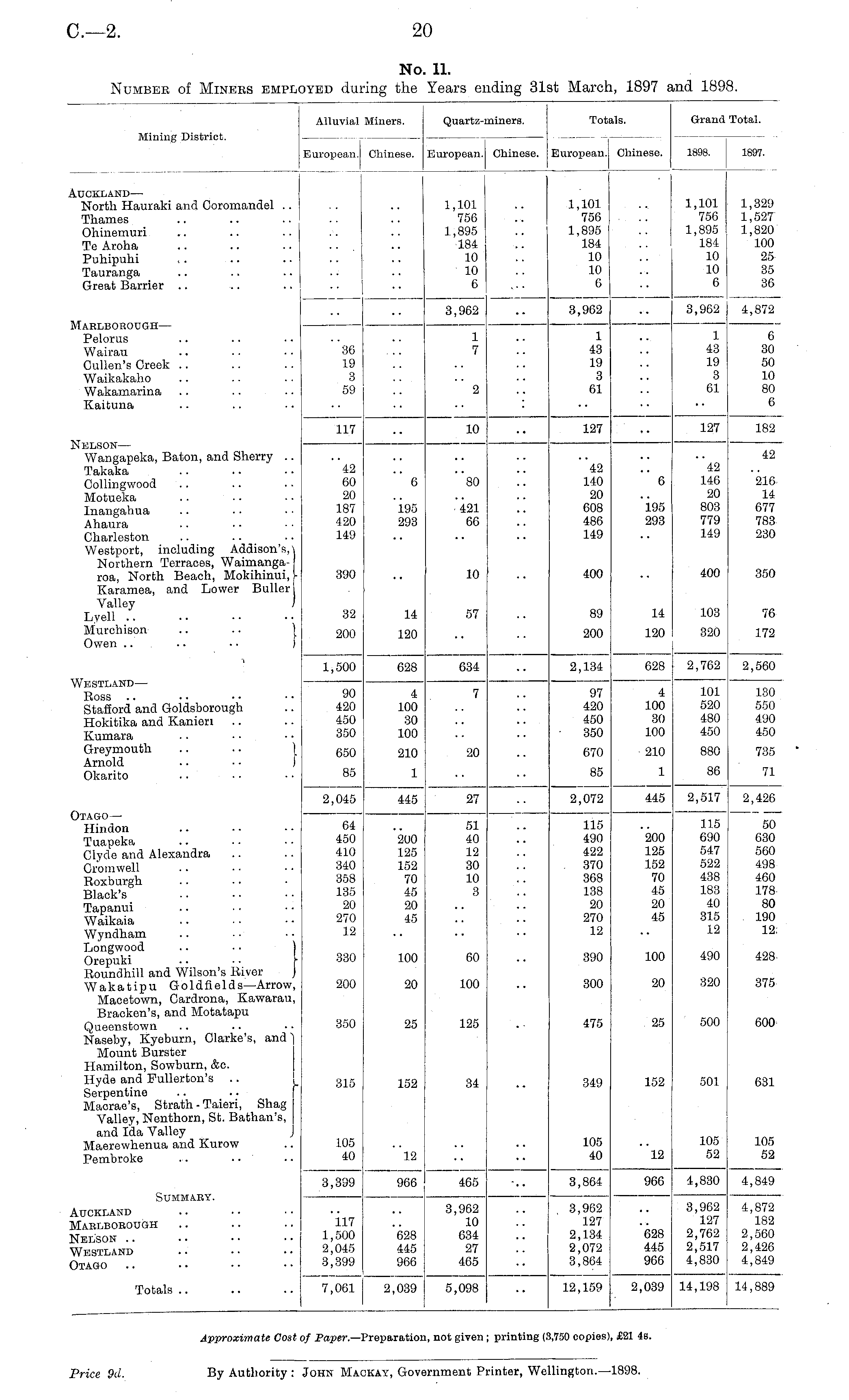 Mining District. Alluvial Miners. Quartz-miners. Totals. Gram Total. European. Chinese. European. Chinese. European. Chinese. 1898. 1897. Auckland — North Hauraki and Ooromandel .. Thames Ohinemuri Te Aroha Puhipuhi Tauranga Great Barrier 1,101 756 1,895 184 10 10 6 1,101 756 1,895 j 184 10 10 6 1,101 756 1,895 184 10 10 6 1,329 1,527 1,820 100 25 35 36 •• Marlbokough— Pelorus Wairau Cullen's Greek Waikakaho Wakamarina Kaituna 36 19 3 59 i 3,962 1 7 3,962 1 43 19 3 61 3,962 1 43 19 3 61 4,872 6 30 50 1(1 80 6 2 Nklson— Wangapeka, Baton, and Sherry .. Takaka Oollingwood Motueka Inangahua Ahaura Charleston Westport, including Addison's, Northern Terraces, Waimangaroa, North Beach, Mokihinui, ■ Karamea, and Lower Buller Valley Lyell .. Murchison Owen .. .. ■ • f 42 60 20 187 420 149 117 6 195 293 "80 421 66 10 42 140 20 608 486 149 127 6 195 293 42 146 20 803 779 149 127 42 216 14 677 783 230 182 390 10 400 400 350 32 14 57 89 14 103 76 200 120 200 120 320 172 1,500 90 420 450 350 628 634 628 2,762 2,560 2,134 Westland — Boss Stafford and Goldsborough Hokitika and Kanieri Kumara Greymouth Arnold • • ■ • ) Okarito 4 100 30 100 7 97 420 450 350 4 100 30 100 101 520 480 450 130 550 490 450 650 210 20 070 210 880 735 85 1 85 1 86 71 2,045 445 27 2,072 445 2,517 2,426 Otago— Hindon Tuapeka Clyde and Alexandra Cromwell Roxburgh Black's Tapanui Waikaia Wyndham Tjongwood .. ■ ■ J Orepuki ■ • • ■ r Roundhill and Wilson's River ) Wakatipu Goldfields —Arrow, Macetown, Cardrona, Kawarau, Bracken's, and Motatapu Queenstown Naseby, Kyeburn, Clarke's, and] Mount Burster Hamilton, Sowburn, &c. Hyde and Pullerton's .. Serpentine Macrae's, Strath - Taieri, Shag Valley, Nenthorn, St. Bathan's, and Ida Valley J Maerewhenua and Kurow Pembroke 64 450 410 340 358 135 20 270 12 330 200 200 125 152 70 45 20 45 100 20 51 40 12 30 10 8 60 100 115 490 422 . 370 368 138 20 270 12 390 300 200 125 152 70 45 20 45 100 20 115 690 547 522 438 183 40 315 12 490 320 50 630 560 498 460 178 80 190 12 428. 375 350 25 125 475 25 500 600 315 152 34 349 152 501 G31 105 40 12 105 40 12 105 52 105 52 3,399 966 465 Summary. 3,864 966 4,830 4,849 Auckland Mablboroush Nelson .. Wbstland Otago 117 1,500 2,045 3,399 628 445 966 3,962 10 634 27 465 3,962 127 2,134 2,072 3,864 628 445 966 3,962 127 2,762 2,517 4,830 4,872 182 2,560 2,426 4,849 Totals 7,061 2,039 5,098 2,039 14,198 14,889 12,159