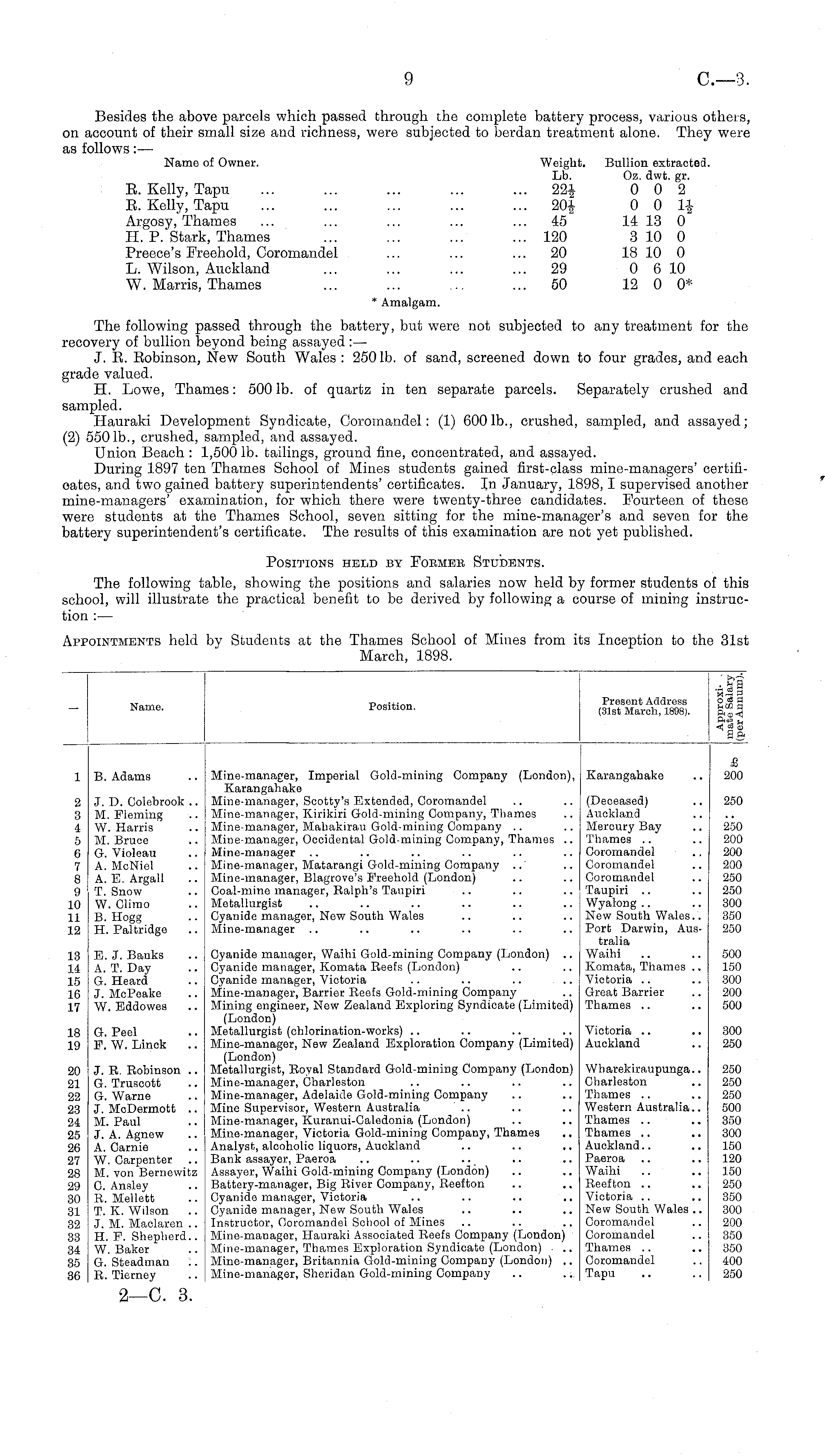 Besides the above parcels which passed through the complete battery process, various others, on account of their small size and richness, were subjected to berdan treatment alone. They were as follows:— Name of Owner. Weight. Bullion extracted. Lb. Oz. dwt. gr. R. Kelly, Tapu ... ... ... ... ... 22£ 0 0 2 R.Kelly, Tapu ... ... ... ... ... 20| 0 0 If Argosy, Thames ... ... ... ... ... 45 14 13 0 H. P. Stark, Thames ... ... ... ... 120 3 10 0 Preece's Freehold, Coromandel ... ... ... 20 18 10 0 L. Wilson, Auckland ... ... ... ... 29 0 610 W. Marris, Thames ... ... ... ... 50 12 0 0* * Amalgam. The following passed through the battery, but were not subjected to any treatment for the recovery of bullion beyond being assayed : — J. R. Robinson, New South Wales : 2501b. of sand, screened down to four grades, and each grade valued. H. Lowe, Thames: 500 lb. of quartz in ten separate parcels. Separately crushed and sampled. Hauraki Development Syndicate, Coromandel: (1) 6001b., crushed, sampled, and assayed; (2) 5501b., crushed, sampled, and assayed. Union Beach : 1,5001b. tailings, ground fine, concentrated, and assayed. During 1897 ten Thames School of Mines students gained first-class mine-managers' certificates, and two gained battery superintendents' certificates. In January, 1898,1 supervised another mine-managers' examination, for which there were twenty-three candidates. Fourteen of these were students at the Thames School, seven sitting for the mine-manager's and seven for the battery superintendent's certificate. The results of this examination are not yet published. Positions held by Foemee Students. The following table, showing the positions and salaries now held by former students of this school, will illustrate the practical benefit to be derived by following a course of mining instruction :—