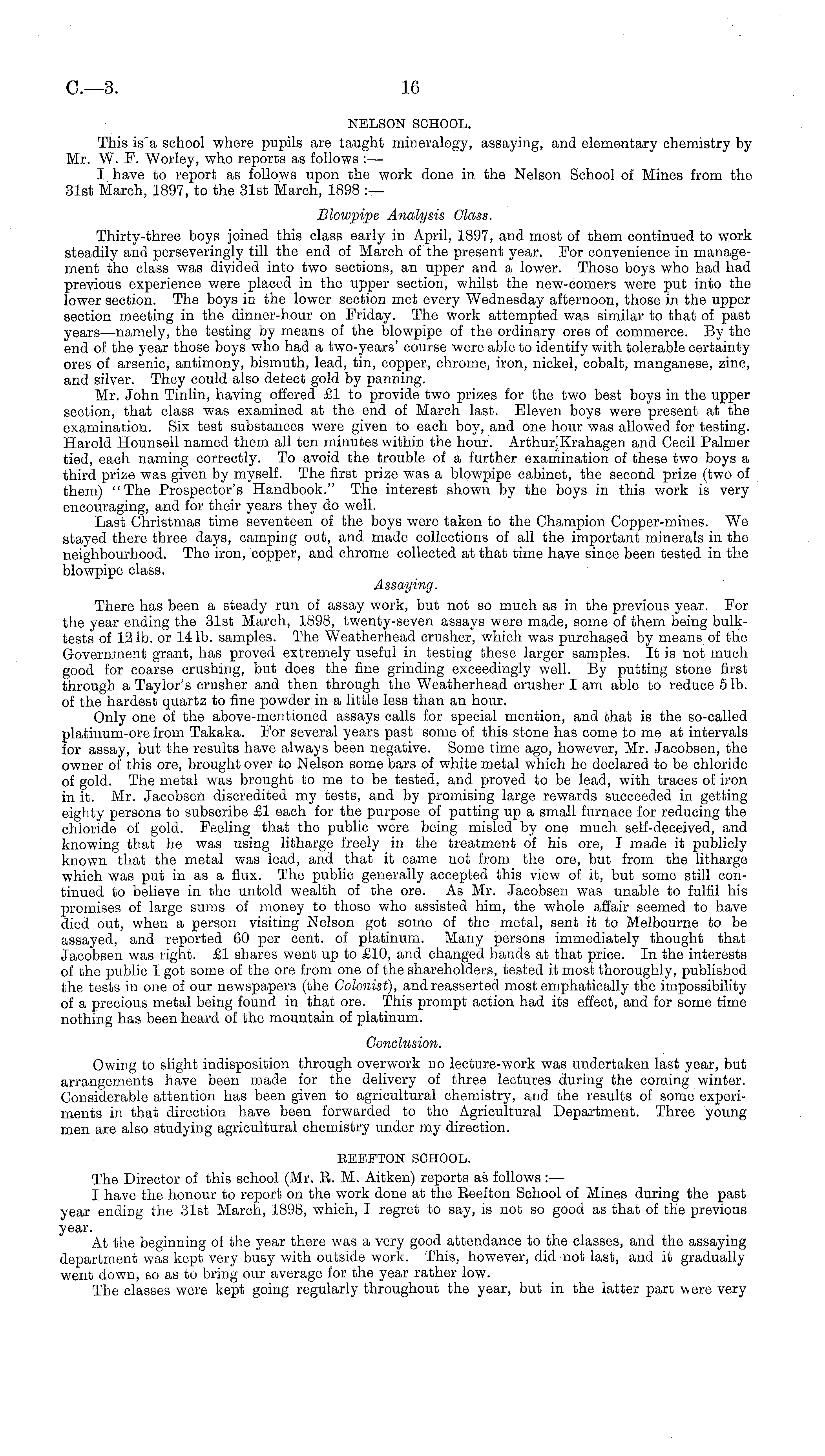 NELSON SCHOOL. This is a school where pupils are taught mineralogy, assaying, and elementary chemistry by Mr. W. F. Worley, who reports as follows : — I have to report as follows upon the work done in the Nelson School of Mines from the 31st March, 1897, to the 31st March, 1898 :— Blowpipe Analysis Class. Thirty-three boys joined this class early in April, 1897, and most of them continued to work steadily and perseveringly till the end of March of the present year. For convenience in management the class was divided into two sections, an upper and a lower. Those boys who had had previous experience were placed in the upper section, whilst the new-comers were put into the lower section. The boys in the lower section met every Wednesday afternoon, those in the upper section meeting in the dinner-hour on Friday. The work attempted was similar to that of past years—namely, the testing by means of the blowpipe of the ordinary ores of commerce. By the end of the year those boys who had a two-years' course were able to identify with tolerable certainty ores of arsenic, antimony, bismuth, lead, tin, copper, chrome, iron, nickel, cobalt, manganese, zinc, and silver. They could also detect gold by panning. Mr. John Tinlin, having offered £1 to provide two prizes for the two best boys in the upper section, that class was examined at the end of March last. Eleven boys were present at the examination. Six test substances were given to each boy, and one hour was allowed for testing. Harold Hounsell named them all ten minutes within the hour. Arthur-Krahagen and Cecil Palmer tied, each naming correctly. To avoid the trouble of a further examination of these two boys a third, prize was given by myself. The first prize was a blowpipe cabinet, the second prize (two of them) "The Prospector's Handbook." The interest shown by the boys in this work is very encouraging, and for their years they do well. Last Christmas time seventeen of the boys were taken to the Champion Copper-mines. We stayed there three days, camping out, and made collections of all the important minerals in the neighbourhood. The iron, copper, and chrome collected at that time have since been tested in the blowpipe class. Assaying. There has been a steady run of assay work, but not so much as in the previous year. For the year ending the 31st March, 1898, twenty-seven assays were made, some of them being bulktests of 121b. or 141b. samples. The Weatherhead crusher, which was purchased by means of the Government grant, has proved extremely useful in testing these larger samples. It is not much good for coarse crushing, but does the fine grinding exceedingly well. By putting stone first through a Taylor's crusher and then through the Weatherhead crusher I am able to reduce 5 lb. of the hardest quartz to fine powder in a little less than an hour. Only one of the above-mentioned assays calls for special mention, and that is the so-called platinum-ore from Takaka. For several years past some of this stone has come to me at intervals for assay, but the results have always been negative. Some time ago, however, Mr. Jacobsen, the owner of this ore, brought over to Nelson some bars of white metal which he declared to be chloride of gold. The metal was brought to me to be tested, and proved to be lead, with traces of iron in it. Mr. Jacobsen discredited my tests, and by promising large rewards succeeded in getting eighty persons to subscribe £1 each for the purpose of putting up a small furnace for reducing the chloride of gold. Feeling that the public were being misled by one much self-deceived, and knowing that he was using litharge freely in the treatment of his ore, I made it publicly known that the metal was lead, and that it came not from the ore, but from the litharge which was put in as a flux. The public generally accepted this view of it, but some still continued to believe in the untold wealth of the ore. As Mr. Jacobsen was unable to fulfil his promises of large sums of money to those who assisted him, the whole affair seemed to have died out, when a person visiting Nelson got some of the metal, sent it to Melbourne to be assayed, and reported 60 per cent, of platinum. Many persons immediately thought that Jacobsen was right. £1 shares went up to £10, and changed hands at that price. In the interests of the public I got some of the ore from one of the shareholders, tested it most thoroughly, published the tests in one of our newspapers (the Colonist), and reasserted most emphatically the impossibility of a precious metal being found in that ore. This prompt action had its effect, and for some time nothing has been heard of the mountain of platinum. Conclusion. Owing to slight indisposition through overwork no lecture-work was undertaken last year, but arrangements have been made for the delivery of three lectures during the coming winter. Considerable attention has been given to agricultural chemistry, and the results of some experiments in that direction have been forwarded to the Agricultural Department. Three young men are also studying agricultural chemistry under my direction. REEFTON SCHOOL. The Director of this school (Mr. R. M. Aitken) reports as follows: — I have the honour to report on the work done at the Reefton School of Mines during the past year ending the 31st March, 1898, which, I regret to say, is not so good as that of the previous year. At the beginning of the year there was a very good attendance to the classes, and the assaying department was kept very busy with outside work. This, however, did not last, and it gradually went down, so as to bring our average for the year rather low. The classes were kept going regularly throughout the year, but in the latter part were very