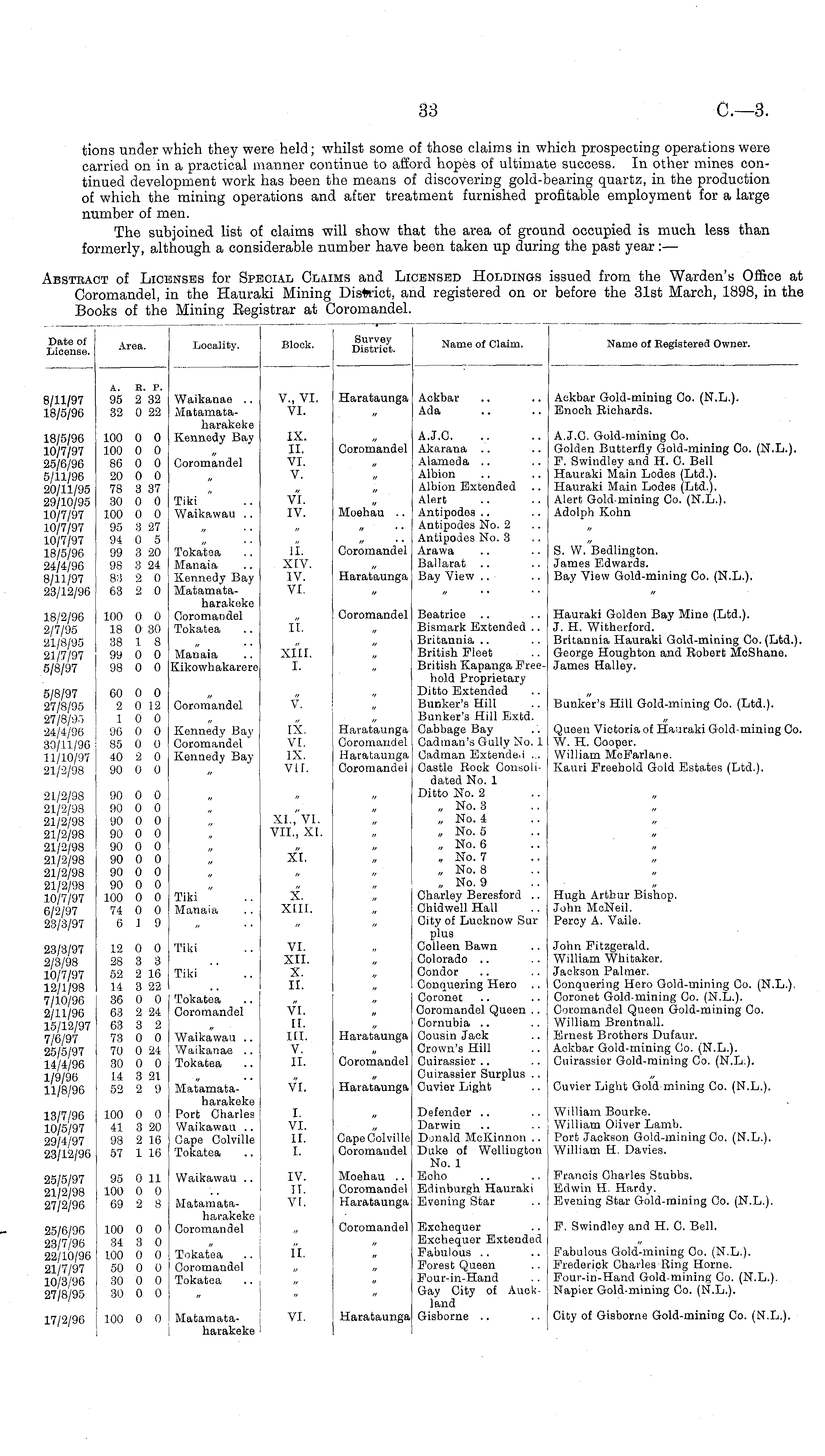 Abstract of Licenses for Special Claims and Licensed Holdings issued from the Warden's Office at Coromandel, in the Hauraki Mining District, and registered on or before the 31st March, 1898, in the Books of the Mining Registrar at Coromandel.