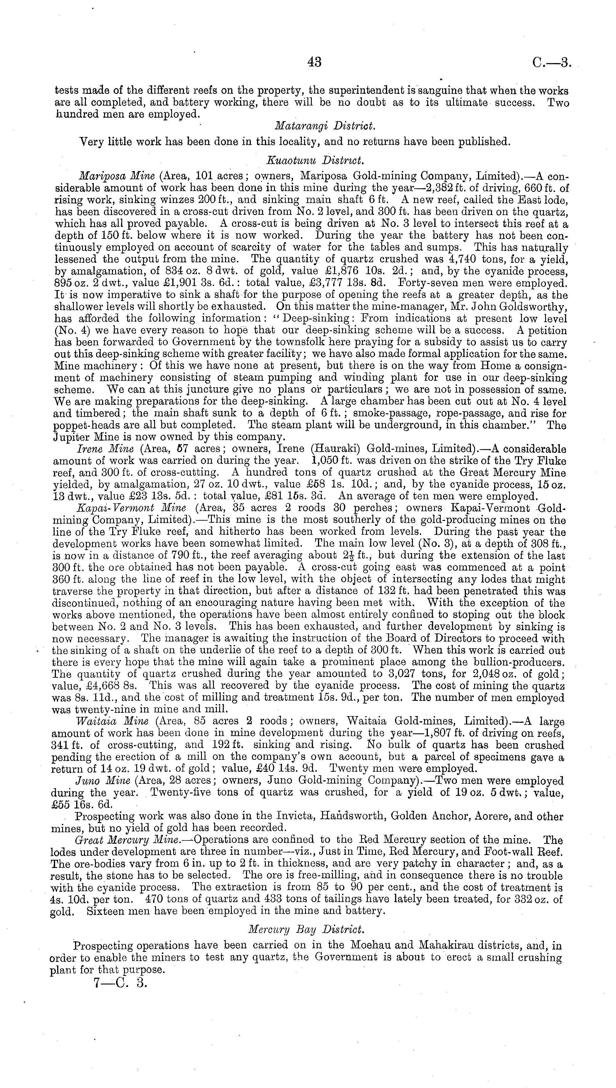 tests made of the different reefs on the property, the superintendent is sanguine that when the works are all completed, and battery working, there will be no doubt as to its ultimate success. Two hundred men are employed. Matarangi District. Very little work has been done in this locality, and no returns have been published. Kuaotunu District. Mariposa Mine (Area, 101 acres; owners, Mariposa Gold-mining Company, Limited). —A considerable amount of work has been done in this mine during the year—2,3B2 ft. of driving, 660 ft. of rising work, sinking winzes 200 ft., and sinking main shaft 6 ft. A new reef, called the East lode, has been discovered in a cross-cut driven from No. 2 level, and 300 ft. has been driven on the quartz, which has all proved payable. A cross-cut is being driven at No. 3 level to intersect this reef at a depth of 150 ft. below where it is now worked. During the year the battery has not been continuously employed on account of scarcity of water for the tables and sumps. This has naturally lessened the output from the mine. The quantity of quartz crushed was 4,740 tons, for a yield, by amalgamation, of 834 oz. 8 dwt. of gold, value £1,876 10s. 2d.; and, by the cyanide process, 895 oz. 2 dwt., value £1,901 3s. 6d.: total value, £3,777 13s. Bd. Forty-seven men were employed. It is now imperative to sink a shaft for the purpose of opening the reefs at a greater depth, as the shallower levels will shortly be exhausted. On this matter the mine-manager, Mr. John Goldsworthy, has afforded the following information: "Deep-sinking: From indications at present low level (No. 4) we have every reason to hope that our deep-sinking scheme will be a success. A petition has been forwarded to Government by the townsfolk here praying for a subsidy to assist us to carry out this deep-sinking scheme with greater facility; we have also made formal application for the same. Mine machinery : Of this we have none at present, but there is on the way from Home a consignment of machinery consisting of steam pumping and winding plant for use in our deep-sinking scheme. We can at this juncture give no plans or particulars ; we are not in possession of same. We are making preparations for the deep-sinking. A large chamber has been cut out at No. 4 level and timbered; the main shaft sunk to a depth of 6 ft.; smoke-passage, rope-passage, and rise for poppet-heads are all but completed. The steam plant will be underground, in this chamber." The Jupiter Mine is now owned by this company. Irene Mine (Area, 67 acres; owners, Irene (Hauraki) Gold-mines, Limited). —A considerable amount of work was carried on during the year. 1,050 ft. was driven on the strike of the Try Fluke reef, and 300 ft. of cross-cutting. A hundred tons of quartz crushed at the Great Mercury Mine yielded, by amalgamation, 27 oz. 10 dwt., value £58 Is. lOd.; and, by the cyanide process, 15 oz. 13 dwt., value £23 13s. sd. : total value, £81 15s. 3d. An average of ten men were employed. Kapai- Vermont Mine (Area, 35 acres 2 roods 30 perches; owners Kapai-Vermont Goldmining Company, Limited). —This mine is the most southerly of the gold-producing mines on the line of the Try Fluke reef, and hitherto has been worked from levels. During the past year the development works have been somewhat limited. The main low level (No. 3), at a depth of 308 ft., is now in a distance of 790 ft., the reef averaging about 2Jft., but during the extension of the last 300 ft. the ore obtained has not been payable. A cross-cut going east was commenced at a point 360 ft. along the line of reef in the low level, with the object of intersecting any lodes that might traverse the property in that direction, but after a distance of 132 ft. had been penetrated this was discontinued, nothing of an encouraging nature having been met with. With the exception of the works above mentioned, the operations have been almost entirely confined to stoping out the block between No. 2 and No. 3 levels. This has been exhausted, and further development by sinking is now necessary. The manager is awaiting the instruction of the Board of Directors to proceed with the sinking of a shaft on the underlie of the reef to a depth of 300 ft. When this work is carried out there is every hope that the mine will again take a prominent place among the bullion-producers. The quantity of quartz crushed during the year amounted to 3,027 tons, for 2,048 oz. of gold; value, £4,668 Bs. This was all recovered by the cyanide process. The cost of mining the quartz was Bs. lid., and the cost of milling and treatment 15s. 9d., per ton. The number of men employed was twenty-nine in mine and mill. Waitaia Mine (Area, 85 acres 2 roods ; owners, Waitaia Gold-mines, Limited). —A large amount of work has been done in mine development during the year—l,Bo7 ft. of driving on reefs, 341 ft. of cross-cutting, and 192 ft. sinking and rising. No bulk of quartz has been crushed pending the erection of a mill on the company's own account, but a parcel of specimens gave a return of 14 oz. 19 dwt. of gold; value, £40 14s. 9d. Twenty men were employed. Juno Mine (Area, 28 acres; owners, Juno Gold-mining Company).—Two men were employed during the year. Twenty-five tons of quartz was crushed, for a yield of 19 oz. 5 dwt.; value, £55 16s. 6d. Prospecting work was also done in the Invicta, Haridsworth, Golden Anchor, Aorere, and other mines, but no yield of gold has been recorded. Great Mercury -Mirae.—Operations are confined to the Red Mercury section of the mine. The lodes under development are three in number—viz., Just in Time, Red Mercury, and Foot-wall Reef. The ore-bodies vary from 6 in. up to 2 ft. in thickness, and are very patchy in character ; and, as a result, the stone has to be selected. The ore is free-milling, and in consequence there is no trouble with the cyanide process. The extraction is from 85 to 90 per cent., and the cost of treatment is 4s. lOd. per ton. 470 tons of quartz