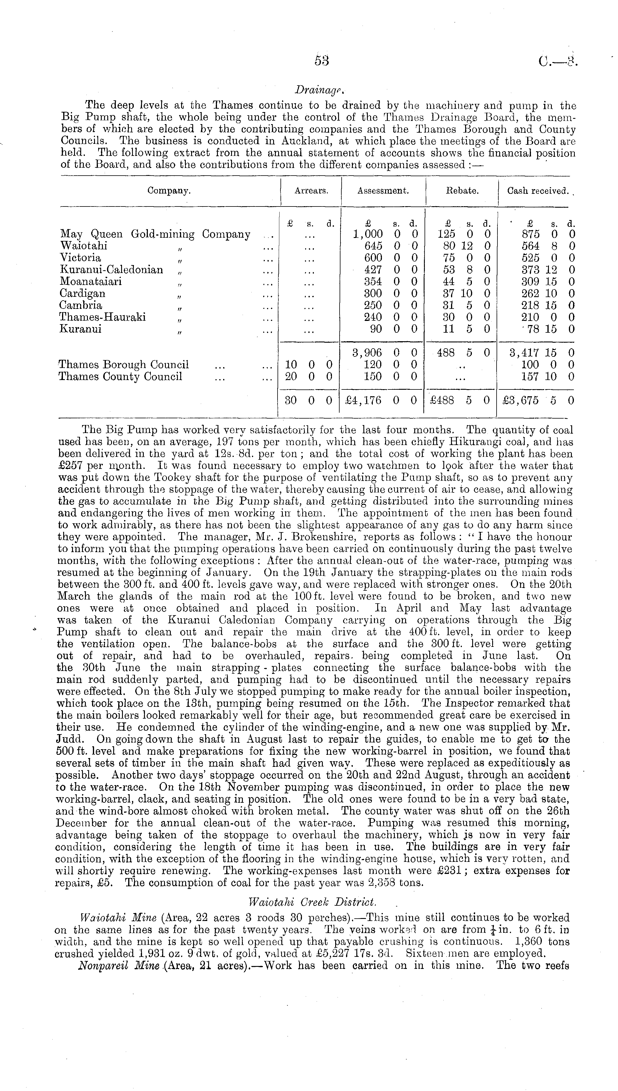 Drainage. The deep levels at the Thames continue to be drained by the machinery and pump in the Big Pump shaft, the whole being under the control of the Thames Drainage Board, the members of which are elected by the contributing companies and the Thames Borough and County Councils. The business is conducted in Auckland, at which place the meetings of the Board are held. The following extract from the annual statement of accounts shows the financial position of the Board, and also the contributions from the different companies assessed : —
