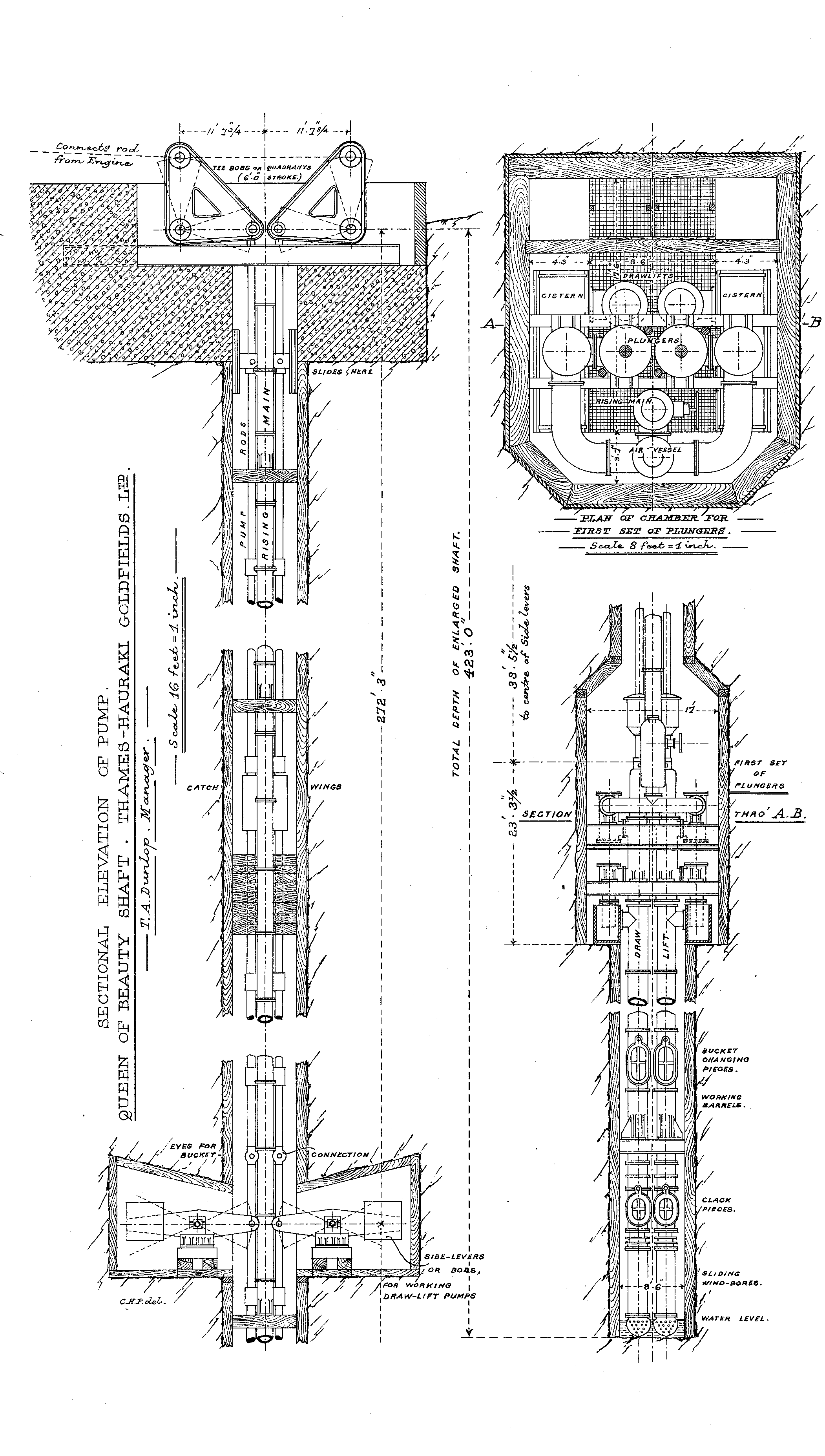 SECTI ONAL ELEVATION OF PUMP. QUEEN OF BEAUTY SHAFT. THAMES HAURAKI GOLDFIELDS, Ltd.