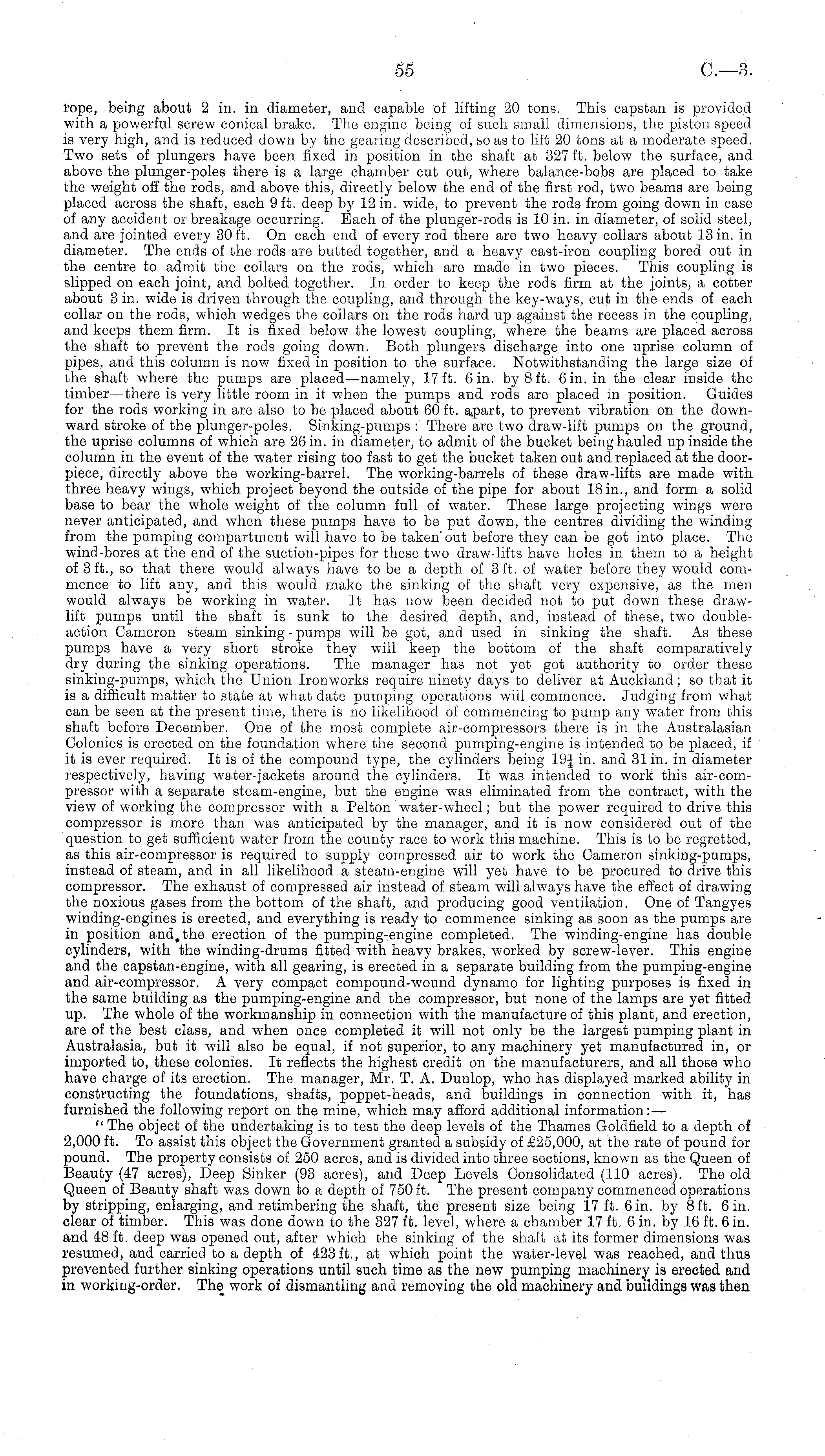rope, being about 2 in. in diameter, and capable of lifting 20 tons. This capstan is provided with a powerful screw conical brake. The engine being of such small dimensions, the piston speed is very high, and is reduced down by the gearing described, so as to lift 20 tons at a moderate speed. Two sets of plungers have been fixed in position in the shaft at 327 ft. below the surface, and above the plunger-poles there is a large chamber cut out, where balance-bobs are placed to take the weight off the rods, and above this, directly below the end of the first rod, two beams are being placed across the shaft, each 9 ft. deep by 12 in. wide, to prevent the rods from going down in case of any accident or breakage occurring. Each of the plunger-rods is 10 in. in diameter, of solid steel, and are jointed every 30 ft. On each end of every rod there are two heavy collars about 13 in. in diameter. The ends of the rods are butted together, and a heavy cast-iron coupling bored out in the centre to admit the collars on the rods, which are made in two pieces. This coupling is slipped on each joint, and bolted together. In order to keep the rods firm at the joints, a cotter about 3 in. wide is driven through the coupling, and through the key-ways, cut in the ends of each collar on the rods, which wedges the collars on the rods hard up against the recess in the coupling, and keeps them firm. It is fixed below the lowest coupling, where the beams are placed across the shaft to prevent the rods going down. Both plungers discharge into one uprise column of pipes, and this column is now fixed in position to the surface. Notwithstanding the large size of the shaft where the pumps are placed —namely, 17 ft. 6 in. by 8 ft. 6 in. in the clear inside the timber —there is very little room in it when the pumps and rods are placed in position. Guides for the rods working in are also to be placed about 60 ft. apart, to prevent vibration on the downward stroke of the plunger-poles. Sinking-pumps : There are two draw-lift pumps on the ground, the uprise columns of which are 26 in. in diameter, to admit of the bucket being hauled up inside the column in the event of the water rising too fast to get the bucket taken out and replaced at the doorpiece, directly above the working-barrel. The working-barrels of these draw-lifts are made with three heavy wings, which project beyond the outside of the pipe for about 18in., and form a solid base to bear the whole weight of the column full of water. These large projecting wings were never anticipated, and when these pumps have to be put down, the centres dividing the winding from the pumping compartment will have to be taken' out before they can be got into place. The wind-bores at the end of the suction-pipes for these two draw-lifts have holes in them to a height of 3 ft., so that there would always have to be a depth of 3 ft. of water before they would commence to lift any, and this would make the sinking of the shaft very expensive, as the men would always be working in water. It has now been decided not to put down these drawlift pumps until the shaft is sunk to the desired depth, and, instead of these, two doubleaction Cameron steam sinking - pumps will be got, and used in sinking the shaft. As these pumps have a very short stroke they will keep the bottom of the shaft comparatively dry during the sinking operations. The manager has not yet got authority to order these sinking-pumps, which the Union Ironworks require ninety days to deliver at Auckland; so that it is a difficult matter to state at what date pumping operations will commence. Judging from what can be seen at the present time, there is no likelihood of commencing to pump any water from this shaft before December. One of the most complete air-compressors there is in the Australasian Colonies is erected on the foundation where the second pumping-engine is intended to be placed, if it is ever required. It is of the compound type, the cylinders being 19Jin. and 31 in. in diameter respectively, having wa.ter-jackets around the cylinders. It was intended to work this air-com-pressor with a separate steam-engine, but the engine was eliminated from the contract, with the view of working the compressor with a Pelton water-wheel; but the power required to drive this compressor is more than was anticipated by the manager, and it is now considered out of the question to get sufficient water from the county race to work this machine. This is to be regretted, as this air-compressor is required to supply compressed air to work the Cameron sinking-pumps, instead of steam, and in all likelihood a steam-engine will yet have to be procured to drive this compressor. The exhaust of compressed air instead of steam will always have the effect of drawing the noxious gases from the bottom of the shaft, and producing good ventilation. One of Tangyes winding-engines is erected, and everything is ready to commence sinking as soon as the pumps are in position and, the erection of the pumping-engine completed. The winding-engine has double cylinders, with the winding-drums fitted with heavy brakes, worked by screw-lever. This engine and the capstan-engine, with all gearing, is erected in a separate building from the pumping-engine and air-compressor. A very compact compound-wound dynamo for lighting purposes is fixed in the same building as the pumping-engine and the compressor, but none of the lamps are yet fitted up. The whole of the workmanship in connection with the manufacture of this plant, and erection, are of the best class, and when once completed it will not only be the largest pumping plant in Australasia, but it will also be equal, if not superior, to any machinery yet manufactured in, or imported to, these colonies. It reflects the highest credit on the manufacturers, and all those who have charge of its erection. The manager, Mr. T. A. Dunlop, who has displayed marked ability in constructing the foundations, shafts, poppe