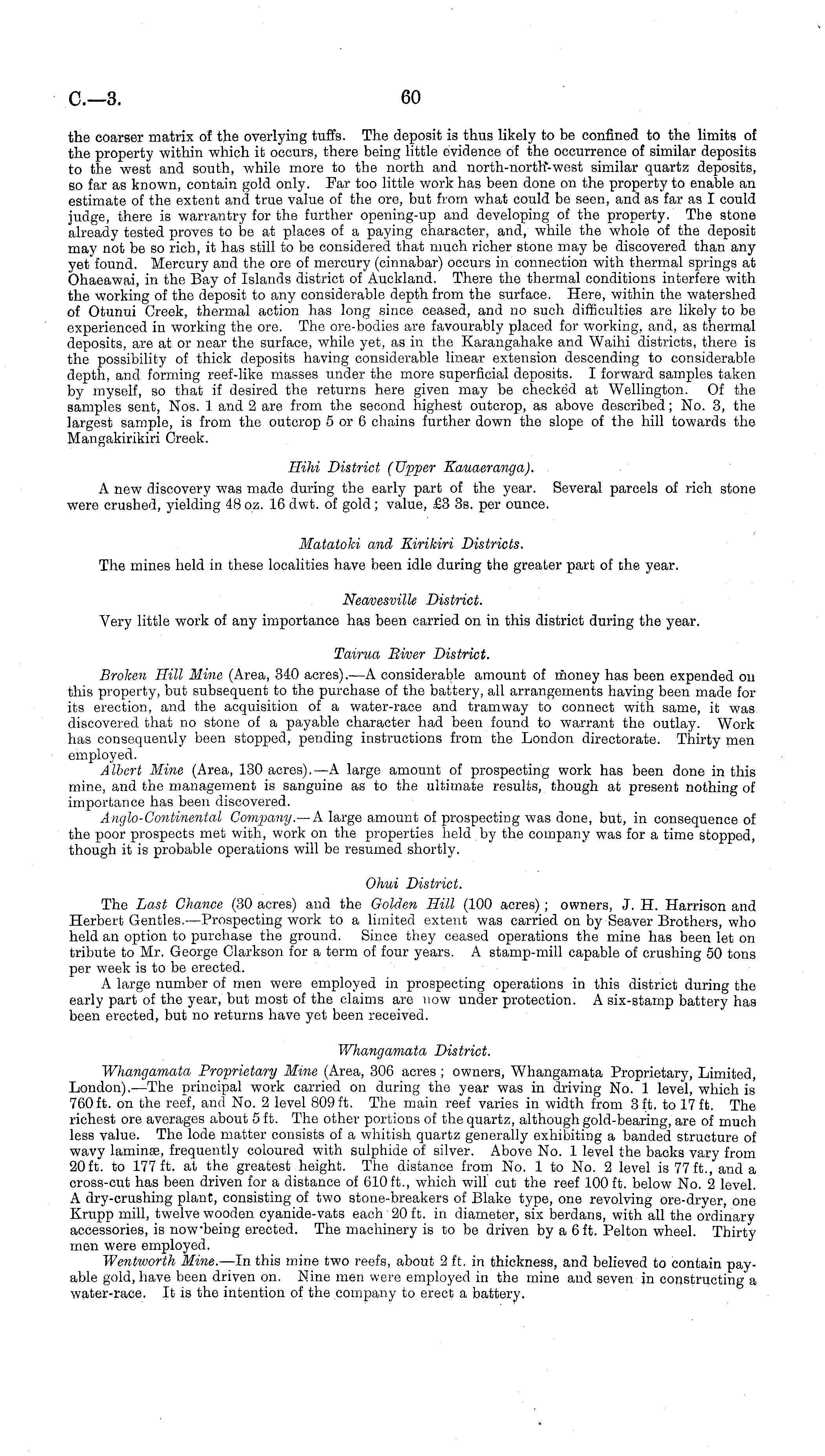 the coarser matrix of the overlying tuffs. The deposit is thus likely to be confined to the limits of the property within which it occurs, there being little evidence of the occurrence of similar deposits to the west and south, while more to the north and north-north-west similar quartz deposits, so far as known, contain gold only. Far too little work has been done on the property to enable an estimate of the extent and true value of the ore, but from what could be seen, and as far as I could judge, there is warrantry for the further opening-up and developing of the property. The stone already tested proves to be at places of a paying character, and, while the whole of the deposit may not be so rich, it has still to be considered that much richer stone may be discovered than any yet found. Mercury and the ore of mercury (cinnabar) occurs in connection with thermal springs at Ohaeawai, in the Bay of Islands district of Auckland. There the thermal conditions interfere with the working of the deposit to any considerable depth from the surface. Here, within the watershed of Otunui Creek, thermal action has long since ceased, and no such difficulties are likely to be experienced in working the ore. The ore-bodies are favourably placed for working, and, as thermal deposits, are at or near the surface, while yet, as in the Karangahake and Waihi districts, there is the possibility of thick deposits having considerable linear extension descending to considerable depth, and forming reef-like masses under the more superficial deposits. I forward samples taken by myself, so that if desired the returns here given may be checked at Wellington. Of the samples sent, Nos. 1 and 2 are from the second highest outcrop, as above described; No. 3, the largest sample, is from the outcrop 5 or 6 chains further down the slope of the hill towards the Mangakirikiri Creek. Hihi District (Upper Kauaeranga). A new discovery was made during the early part of the year. Several parcels of rich stone were crushed, yielding 48oz. 16 dwt. of gold; value, £3 3s. per ounce. Matatoki and Kirikiri Districts. The mines held in these localities have been idle during the greater part of the year. Neavesville District. Very little work of any importance has been carried on in this district during the year. Tairua River District. Broken Hill Mine (Area, 340 acres). —A considerable amount of money has been expended on this property, but subsequent to the purchase of the battery, all arrangements having been made for its erection, and the acquisition of a water-race and tramway to connect with same, it was discovered that no stone of a payable character had been found to warrant the outlay. Work has consequently been stopped, pending instructions from the London directorate. Thirty men employed. Albert Mine (Area, 130 acres). —A large amount of prospecting work has been done in this mine, and the management is sanguine as to the ultimate results, though at present nothing of importance has been discovered. Anglo-Continental Company.—A large amount of prospecting was done, but, in consequence of the poor prospects met with, work on the properties held by the company was for a time stopped, though it is probable operations will be resumed shortly. Ohui District. The Last Chance (30 acres) and the Golden Hill (100 acres); owners, J. H. Harrison and Herbert Gentles. —Prospecting work to a limited extent was carried on by Seaver Brothers, who held an option to purchase the ground. Since they ceased operations the mine has been let on tribute to Mr. George Clarkson for a term of four years. A stamp-mill capable of crushing 50 tons per week is to be erected. A large number of men were employed in prospecting operations in this district during the early part of the year, but most of the claims are now under protection. A six-stamp battery has been erected, but no returns have yet been received. Whangamata District. Whangamata Proprietary Mine (Area, 306 acres ; owners, Whangamata Proprietary, Limited, London). —The principal work carried on during the year was in driving No. 1 level, which is 760 ft. on the reef, and No. 2 level 809 ft. The main reef varies in width from 3 ft. to 17 ft. The richest ore averages about 5 ft. The other portions of the quartz, although gold-bearing, are of much less value. The lode matter consists of a whitish quartz generally exhibiting a banded structure of wavy laminae, frequently coloured with sulphide of silver. Above No. 1 level the backs vary from 20ft. to 177 ft. at the greatest height. The distance from No. 1 to No. 2 level is 77ft., and a cross-cut has been driven for a distance of 610 ft., which will cut the reef 100 ft. below No. 2 level. A dry-crushing plant, consisting of two stone-breakers of Blake type, one revolving ore-dryer, one Krupp mill, twelve wooden cyanide-vats each 20 ft. in diameter, six berdans, with all the ordinary accessories, is nowbeing erected. The machinery is to be driven by a 6 ft. Pelton wheel. Thirty men were employed. Wentworth Mine. —ln this mine two reefs, about 2 ft. in thickness, and believed to contain payable gold, have been driven on. Nine men were employed in the mine and seven in constructing a water-race. It is the intention of the company to erect a battery.