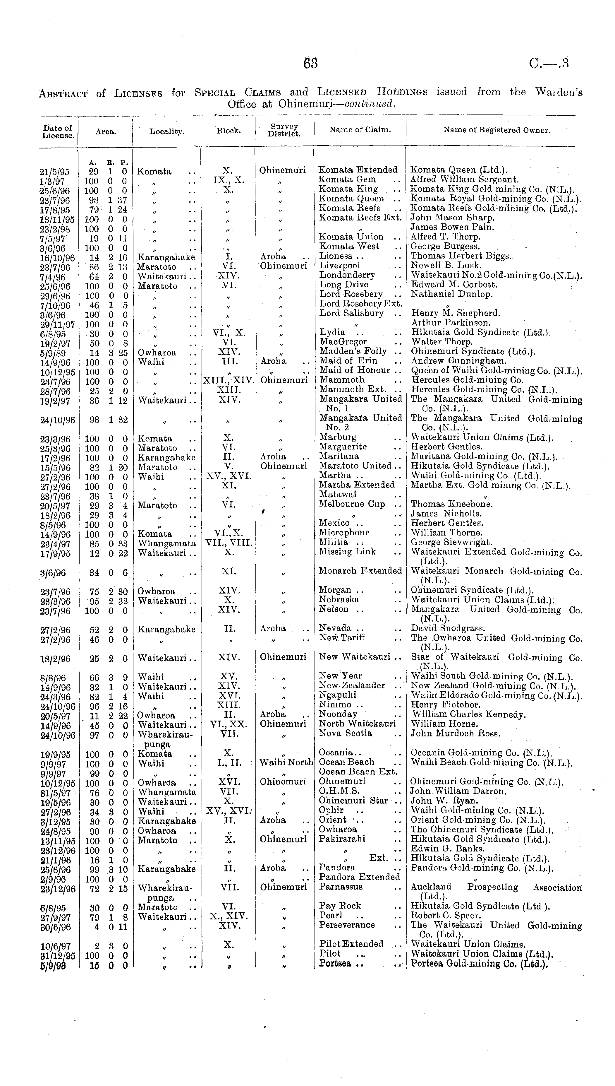 Abstract of Licenses for Special Claims and Licensed Holdings issued from the Warden's Office at Ohinemuri — continued.