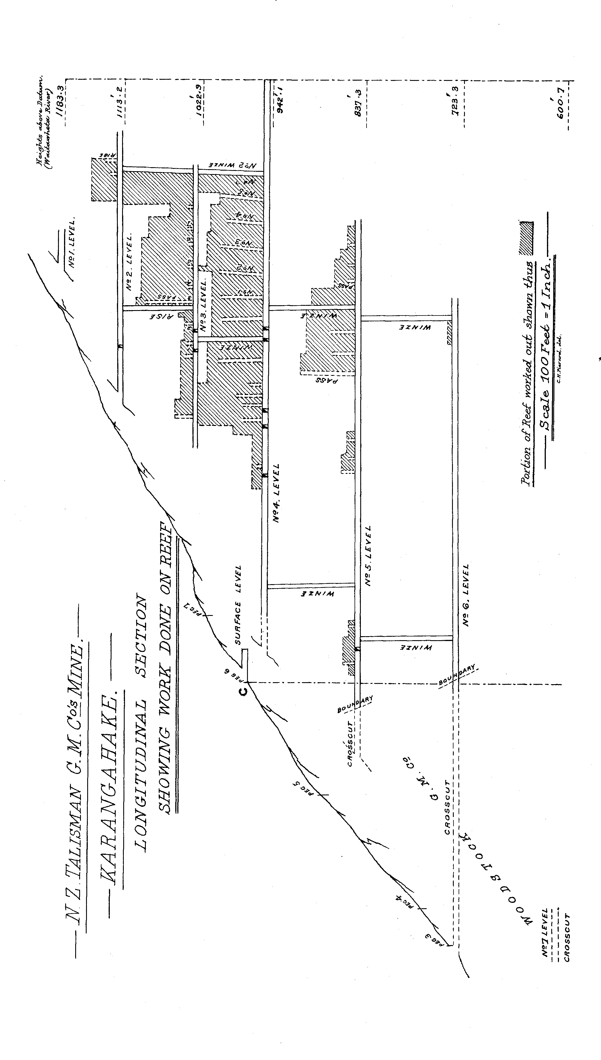 N.Z. Talisman G.M.Co's Mine. KARANGAHAKE.LONGITUDINAL SECTION SHOWING WORK DONE ON REEF