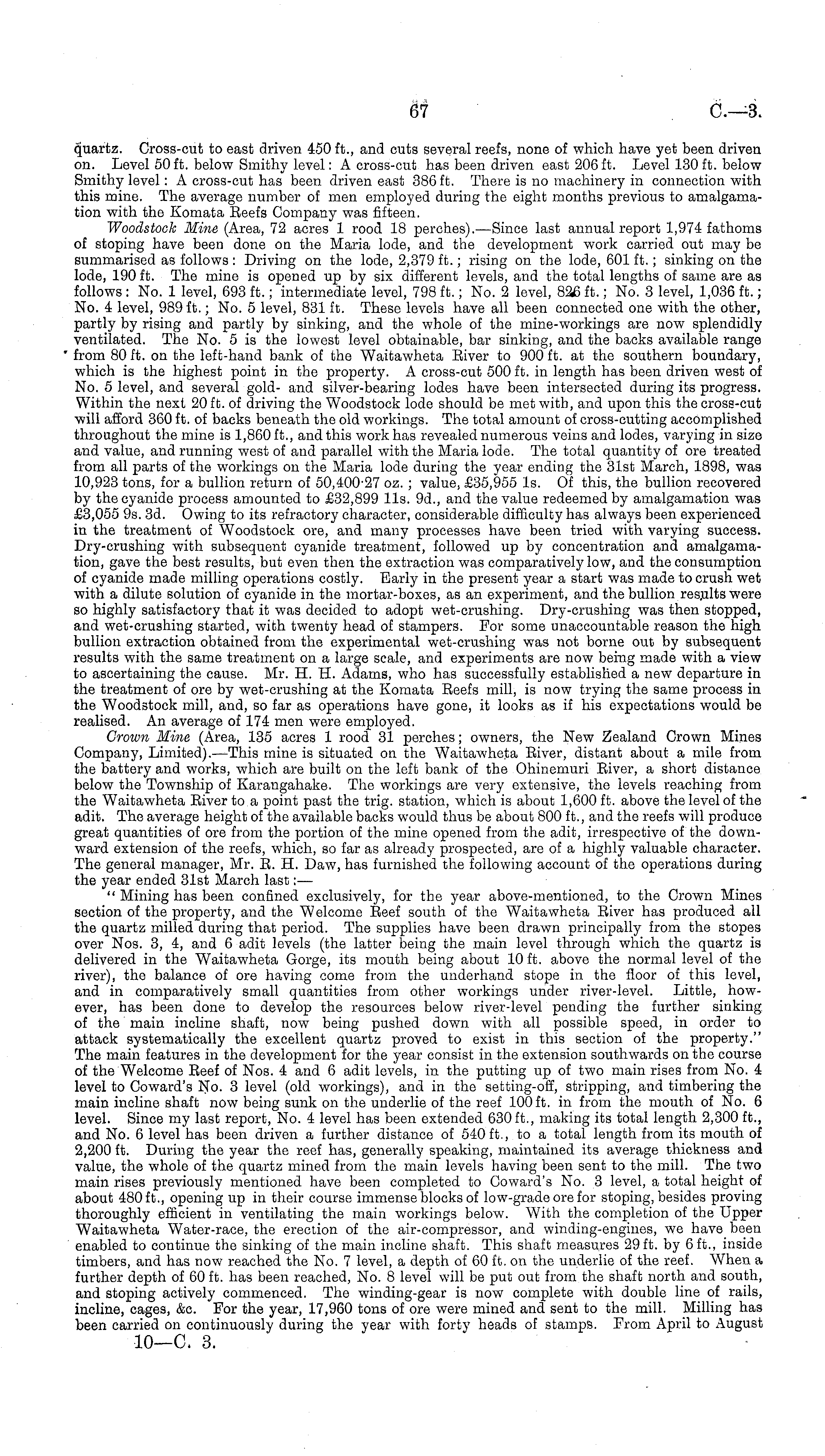 quartz. Cross-cut to east driven 450 ft., and cuts several reefs, none of which have yet been driven on. Level 50 ft. below Smithy level: A cross-cut has been driven east 206 ft. Level 130 ft. below Smithy level: A cross-cut has been driven east 386 ft. There is no machinery in connection with this mine. The average number of men employed during the eight months previous to amalgamation with the Komata Reefs Company was fifteen. Woodstock Mine (Area, 72 acres 1 rood 18 perches).—Since last annual report 1,974 fathoms of stoping have been done on the Maria lode, and the development work carried out may be summarised as follows: Driving on the lode, 2,379 ft.; rising on the lode, 601 ft.; sinking on the lode, 190 ft. The mine is opened up by six different levels, and the total lengths of same are as follows : No. 1 level, 693 ft.; intermediate level, 798 ft.; No. 2 level, 82£ ft.; No. 3 level, 1,036 ft.; No. 4 level, 989 ft.; No. 5 level, 831 ft. These levels have all been connected one with the other, partly by rising and partly by sinking, and the whole of the mine-workings are now splendidly ventilated. The No. 5 is the lowest level obtainable, bar sinking, and the backs available range from 80 ft. on the left-hand bank of the Waitawheta River to 900 ft. at the southern boundary, which is the highest point in the property. A cross-cut 500 ft. in length has been driven west of No. 5 level, and several gold- and silver-bearing lodes have been intersected during its progress. Within the next 20 ft. of driving the Woodstock lode should be met with, and upon this the cross-cut will afford 360 ft. of backs beneath the old workings. The total amount of cross-cutting accomplished throughout the mine is 1,860 ft., and this work has revealed numerous veins and lodes, varying in size and value, and running west of and parallel with the Maria lode. The total quantity of ore treated from all parts of the workings on the Maria lode during the year ending the 31st March, 1898, was 10,923 tons, for a bullion return of 50,400-27 oz. ; value, £35,955 Is. Of this, the bullion recovered by the cyanide process amounted to £32,899 lis. 9d., and the value redeemed by amalgamation was £3,055 9s. 3d. Owing to its refractory character, considerable difficulty has always been experienced in the treatment of Woodstock ore, and many processes have been tried with varying success. Dry-crushing with subsequent cyanide treatment, followed up by concentration and amalgamation, gave the best results, but even then the extraction was comparatively low, and the consumption of cyanide made milling operations costly. Early in the present year a start was made to crush wet with a dilute solution of cyanide in the mortar-boxes, as an experiment, and the bullion res.ults were so highly satisfactory that it was decided to adopt wet-crushing. Dry-crushing was then stopped, and wet-crushing started, with twenty head of stampers. For some unaccountable reason the high bullion extraction obtained from the experimental wet-crushing was not borne out by subsequent results with the same treatment on a large scale, and experiments are now being made with a view to ascertaining the cause. Mr. H. H. Adams, who has successfully established a new departure in the treatment of ore by wet-crushing at the Komata Reefs mill, is now trying the same process in the Woodstock mill, and, so far as operations have gone, it looks as if his expectations would be realised. An average of 174 men were employed. Crown Mine (Area, 135 acres 1 rood 31 perches; owners, the New Zealand Crown Mines Company, Limited). —This mine is situated on the Waitawheta River, distant about a mile from the battery and works, which are built on the left bank of the Ohinemuri River, a short distance below the Township of Karangahake. The workings are very extensive, the levels reaching from the Waitawheta River to a point past the trig, station, which is about 1,600 ft. above the level of the adit. The average height of the available backs would thus be about 800 ft., and the reefs will produce great quantities of ore from the portion of the mine opened from the adit, irrespective of the downward extension of the reefs, which, so far as already prospected, are of a highly valuable character. The general manager, Mr. R. H. Daw, has furnished the following account of the operations during the year ended 31st March last; — " Mining has been confined exclusively, for the year above-mentioned, to the Crown Mines section of the property, and the Welcome Reef south of the Waitawheta River has produced all the quartz milled during that period. The supplies have been drawn principally from the stopes over Nos. 3, 4, and 6 adit levels (the latter being the main level through which the quartz is delivered in the Waitawheta Gorge, its mouth being about 10 ft. above the normal level of the river), the balance of ore having come from the underhand stope in the floor of this level, and in comparatively small quantities from other workings under river-level. Little, however, has been done to develop the resources below river-level pending the further sinking of the main incline shaft, now being pushed down with all possible speed, in order to attack systematically the excellent quartz proved to exist in this section of the property." The main features in the development for the year consist in the extension southwards on the course of the Welcome Reef of Nos. 4 and 6 adit levels, in the putting up of two main rises from No. 4 level to Coward's No. 3 level (old workings), and in the setting-off, stripping, and timbering the main incline shaft now being sunk on the underlie of the reef 100 ft. in from the mouth of No. 6 level. Since my last report, No. 4 level has been extended 630 ft., making its total length 2,300 ft., and No. 6 level has been driven a further distance of 540 ft., to a total length from its mouth of 2,200 ft. During the year the reef has, generally speaking, maint