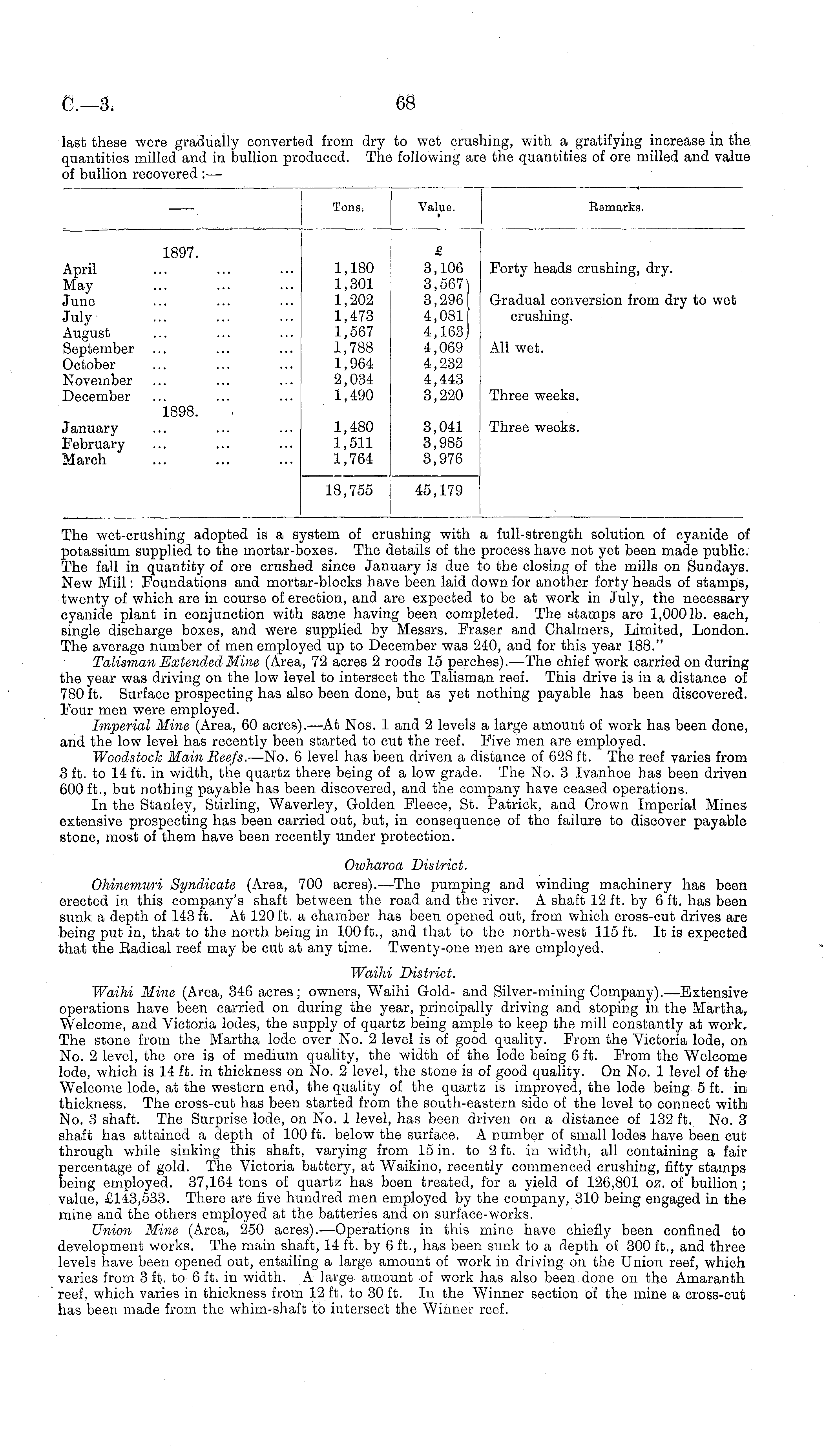 The wet-crushing adopted is a system of crushing with a full-strength solution of cyanide of potassium supplied to the mortar-boxes. The details of the process have not yet been made public. The fall in quantity of ore crushed since January is due to the closing of the mills on Sundays. New Mill: Foundations and mortar-blocks have been laid down for another forty heads of stamps, twenty of which are in course of erection, and are expected to be at work in July, the necessary cyanide plant in conjunction with same having been completed. The stamps are I,ooolb. each, single discharge boxes, and were supplied by Messrs. Fraser and Chalmers, Limited, London. The average number of men employed up to December was 240, and for this year 188." Talisman Extended Mine (Area, 72 acres 2 roods 15 perches). —The chief work carried on during the year was driving on the low level to intersect the Talisman reef. This drive is in a distance of 780 ft. Surface prospecting has also been done, but as yet nothing payable has been discovered. Four men were employed. Imperial Mine (Area, 60 acres). —At Nos. 1 and 2 levels a large amount of work has been done, and the low level has recently been started to cut the reef. Five men are employed. Woodstock Main Reefs. —No. 6 level has been driven a distance of 628 ft. The reef varies from 3 ft. to 14 ft. in width, the quartz there being of a low grade. The No. 3 Ivanhoe has been driven 600 ft., but nothing payable has been discovered, and the company have ceased operations. In the Stanley, Stirling, Waverley, Golden Fleece, St. Patrick, and Crown Imperial Mines extensive prospecting has been carried out, but, in consequence of the failure to discover payable stone, most of them have been recently under protection. Owharoa District. Ohinemuri Syndicate (Area, 700 acres). —The pumping and winding machinery has been erected in this company's shaft between the road and the river. A shaft 12 ft. by 6 ft. has been sunk a depth of 143 ft. At 120 ft. a chamber has been opened out, from which cross-cut drives are being put in, that to the north being in 100 ft., and that to the north-west 115 ft. It is expected that the Radical reef may be cut at any time. Twenty-one men are employed. Waihi District. Waihi Mine (Area, 346 acres; owners, Waihi Gold- and Silver-mining Company).—Extensive operations have been carried on during the year, principally driving and stoping in the Martha, Welcome, and Victoria lodes, the supply of quartz being ample to keep the mill constantly at work. The stone from the Martha lode over No. 2 level is of good quality. From the Victoria lode, on No. 2 level, the ore is of medium quality, the width of the lode being 6 ft. From the Welcome lode, which is 14 ft. in thickness on No. 2 level, the stone is of good quality. On No. 1 level of the Welcome lode, at the western end, the quality of the quartz is improved, the lode being 5 ft. in thickness. The cross-cut has been started from the south-eastern side of the level to connect with No. 3 shaft. The Surprise lode, on No. 1 level, has been driven on a distance of 132 ft. No. 3 shaft has attained a depth of 100 ft. below the surface. A number of small lodes have been cut through while sinking this shaft, varying from 15 in. to 2 ft. in width, all containing a fair percentage of gold. The Victoria battery, at Waikino, recently commenced crushing, fifty stamps being employed. 37,164 tons of quartz has been treated, for a yield of 126,801 oz. of bullion ; value, £143,533. There are five hundred men employed by the company, 310 being engaged in the mine and the others employed at the batteries and on surface-works. Union Mine (Area, 250 acres). —Operations in this mine have chiefly been confined to development works. The main shaft, 14 ft. by 6 ft., has been sunk to a depth of 300 ft., and three levels have been opened out, entailing a large amount of work in driving on the Union reef, which varies from 3 ft. to 6 ft. in width. A large amount of work has also been done on the Amaranth reef, which varies in thickness from 12 ft. to 30 ft. In the Winner section of the mine a cross-cut has been made from the whim-shaft to intersect the Winner reef.