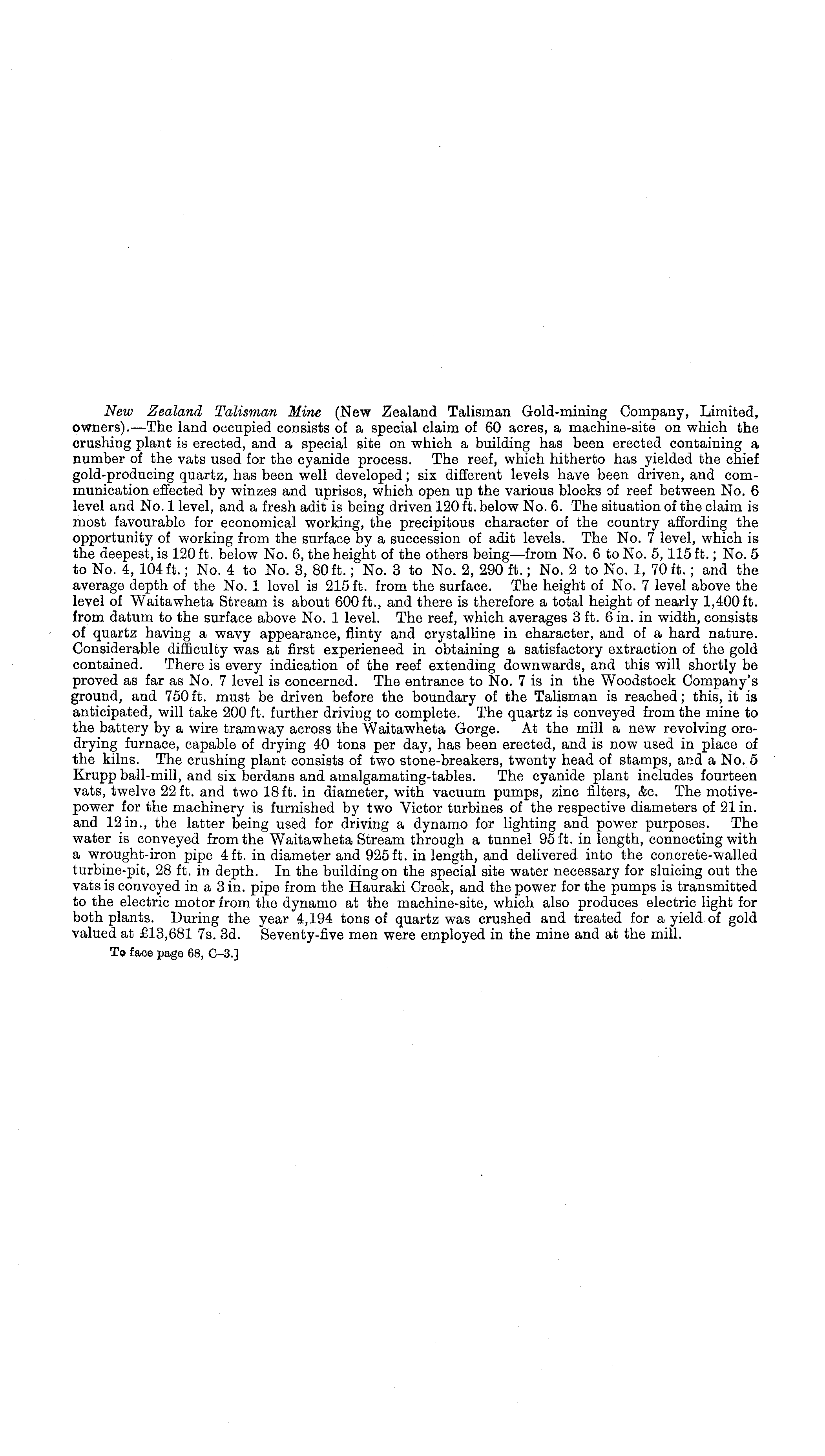 New Zealand Talisman Mine (New Zealand Talisman Gold-mining Company, Limited, owners). —The land occupied consists of a special claim of 60 acres, a machine-site on which the crushing plant is erected, and a special site on which a building has been erected containing a number of the vats used for the cyanide process. The reef, which hitherto has yielded the chief gold-producing quartz, has been well developed; six different levels have been driven, and communication effected by winzes and uprises, which open up the various blocks of reef between No. 6 level and No. 1 level, and a fresh adit is being driven 120 ft. below No. 6. The situation of the claim is most favourable for economical working, the precipitous character of the country affording the opportunity of working from the surface by a succession of adit levels. The No. 7 level, which is the deepest, is 120 ft. below No. 6, the height of the others being—from No. 6to No. 5,115 ft.; No. 5 to No. 4, 104 ft.; No. 4 to No. 3, 80 ft.; No. 3 to No. 2, 290 ft.; No. 2 to No. 1, 70 ft.; and the average depth of the No. 1 level is 215 ft. from the surface. The height of No. 7 level above the level of Waitawheta Stream is about 600 ft., and there is therefore a total height of nearly 1,400 ft. from datum to the surface above No. 1 level. The reef, which averages 3 ft. 6 in. in width, consists of quartz having a wavy appearance, flinty and crystalline in character, and of a hard nature. Considerable difficulty was at first experienced in obtaining a satisfactory extraction of the gold contained. There is every indication of the reef extending downwards, and this will shortly be proved as far as No. 7 level is concerned. The entrance to No. 7is in the Woodstock Company's ground, and 750 ft. must be driven before the boundary of the Talisman is reached; this, it is anticipated, will take 200 ft. further driving to complete. The quartz is conveyed from the mine to the battery by a wire tramway across the Waitawheta Gorge. At the mill a new revolving oredrying furnace, capable of drying 40 tons per day, has been erected, and is now used in place of the kilns. The crushing plant consists of two stone-breakers, twenty head of stamps, and a No. 5 Krupp ball-mill, and six berdans and amalgamating-tables. The cyanide plant includes fourteen vats, twelve 22 ft. and two 18 ft. in diameter, with vacuum pumps, zinc filters, &c. The motivepower for the machinery is furnished by two Victor turbines of the respective diameters of 21 in. and 12 in., the latter being used for driving a dynamo for lighting and power purposes. The water is conveyed from the Waitawheta Stream through a tunnel 95 ft. in length, connecting with a wrought-iron pipe 4 ft. in diameter and 925 ft. in length, and delivered into the concrete-walled turbine-pit, 28 ft. in depth. In the building on the special site water necessary for sluicing out the vats is conveyed in a 3 in. pipe from the Hauraki Creek, and the power for the pumps is transmitted to the electric motor from the dynamo at the machine-site, which also produces electric light for both plants. During the year 4,194 tons of quartz was crushed and treated for a yield of gold valued at £13,681 7s. 3d. Seventy-five men were employed in the mine and at the mill. To face page 68, C-3.]