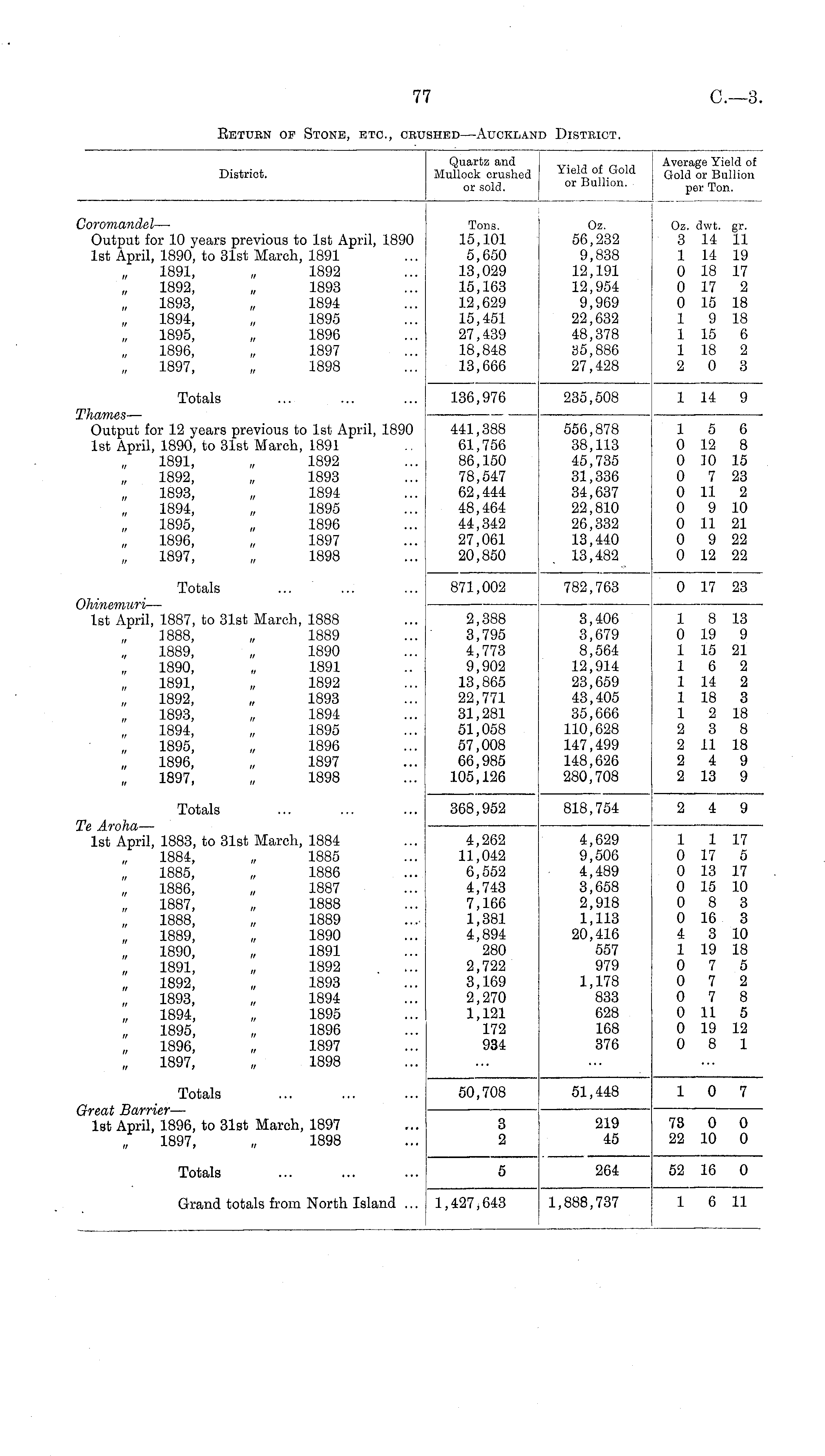 District. Quartz and Mullock crushed or sold. Yield of Gold or Bullion. Average Yield of Gold or Bullion per Ton. 'oromandel — Output for 10 years previous to 1st April, 1890 1st April, 1890, to 31st March, 1891 1891, „ 1892 1892, „ 1893 1893, „ 1894 1894, „ 1895 1895, „ 1896 1896, „ 1897 1897, „ 1898 Tons. 15,101 5,650 13,029 15,163 12,629 15,451 27,439 18,848 13,666 Oz. 56,232 9,838 12,191 12,954 9,969 22,632 48,378 a5,886 27,428 Oz. dwt. gr. 3 14 11 1 14 19 0 18 17 0 17 2 0 15 18 1 9 18 1 15 6 1 18 2 2 0 3 Totals 136,976 235,508 1 14 9 ''hames — Output for 12 years previous to 1st April, 1890 1st April, 1890, to 31st March, 1891 1891, „ 1892 1892, „ 1893 1893, „ 1894 1894, „ 1895 1895, „ 1896 1896, „ 1897 1897, „ 1898 441,388 61,756 86,150 78,547 62,444 48,464 44,342 27,061 20,850 556,878 38,113 45,735 31,336 34,637 22,810 26,332 13,440 13,482 1 0 0 0 0 0 0 0 0 5 12 10 7 11 9 11 9 12 6 8 15 23 2 10 21 22 22 Totals 871,002 782,763 0 17 23 '/7?7? P'YYl ICy? 1st April, 1887, to 31st March, 1888 1888, „ 1889 1889, „ 1890 1890, „ 1891 1891, „ 1892 1892, „ 1893 1893, „ 1894 1894, „ 1895 1895, „ 1896 1896, „ 1897 1897, „ 1898 2,388 3,795 4,773 9,902 13,865 22,771 31,281 51,058 57,008 66,985 105,126 3,406 3,679 8,564 12,914 23,659 43,405 35,666 110,628 147,499 148,626 280,708 1 0 1 1 1 1 1 2 2 2 2 8 19 15 6 14 18 2 3 11 4 13 13 9 21 2 2 3 18 8 18 9 9 Totals 368,952 818,754 2 4 9 'e Aroha — 1st April, 1883, to 31st March, 1884 1884, „ 1885 1885, „ 1886 1886, „ 1887 1887, „ 1888 1888, „ 1889 1889, „ 1890 1890, „ 1891 1891, „ 1892 . ... 1892, „ 1893 1893, „ 1894 1894, „ 1895 1895, „ 1896 1896, „ 1897 1897, „ 1898 4,262 11,042 6,552 4,743 7,166 1,381 4,894 280 2,722 3,169 2,270 1,121 172 934 4,629 9,506 4,489 3,658 2,918 1,113 20,416 557 979 1,178 833 628 168 376 1 0 0 0 0 0 4 1 0 0 0 0 0 0 1 17 13 15 8 16 3 19 7 7 7 11 19 8 17 5 17 10 3 3 10 18 5 2 8 5 12 1 Totals 50,708 51,448 1 0 7 heat Barrier — 1st April, 1896, to 31st March, 1897 1897, „ 1898 3 2 219 45 78 22 0 10 0 0 Totals 264 52 16 0 Grand totals from North Island ... 1,427,643 1,888,737 6 11