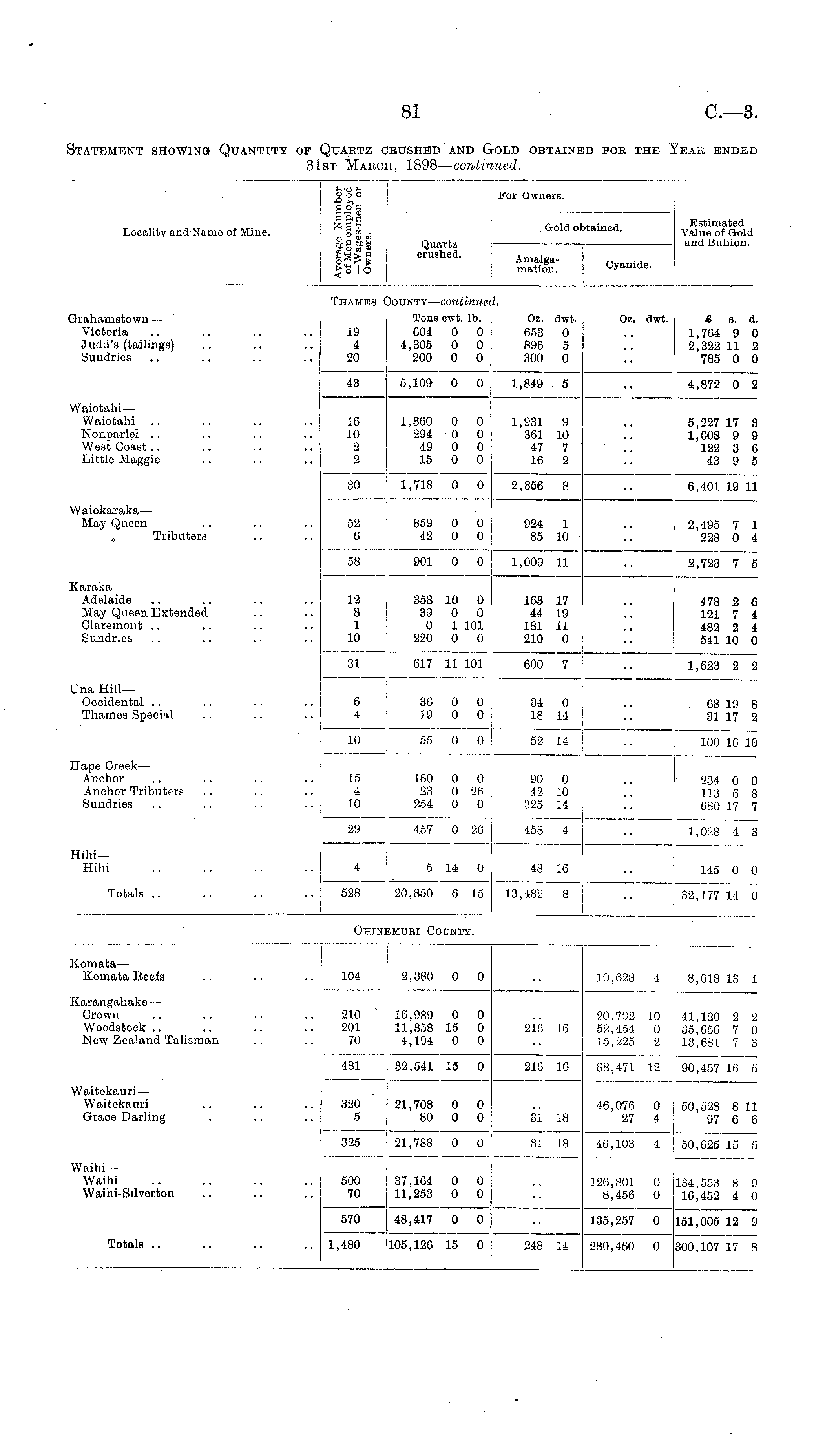 Locality and Name of Mine. 03 Q3 O ■9 =*>- a o a a a 9 «» • aa&i sill i Quartz crushed. For Owners. Gold obtained. Estimated Value of Gold and Bullion. Amalgamation. Cyanide. Thames Iounty— continue! Grahamstown— Victoria Judd's (tailings) Sundries 19 4 20 Tons cwt. lb. 604 0 0 4,305 0 0 200 0 0 Oz. dwt. 653 0 896 5 300 0 Oz. dwt. £ a. d. 1,764 9 0 2,322 11 2 785 0 0 Waiotahi— Waiotahi Nonpariel West Goast Little Maggie 43 5,109 0 0 1,849 5 4,872 0 2 16 10 2 2 1,360 0 0 294 0 0 49 0 0 15 0 0 1,931 9 361 10 47 7 16 2 5,227 17 3 1,008 9 9 122 3 6 43 9 5 Waiokaraka— May Queen „ Tributers 30 1,718 0 0 2,356 8 6,401 19 11 52 6 859 42 0 0 0 0 924 1 85 10 2,495 7 1 228 0 4 Karaka— Adelaide May Queen Extended Claremont Sundries 58 901 0 0 1,009 11 2,723 7 5 12 8 1 10 358 10 0 39 0 0 0 1 101 220 0 0 163 17 44 19 181 11 210 0 478 2 6 121 7 4 482 2 4 541 10 0 31 617 11 101 600 7 1,623 2 2 Una HillOccidental Thames Special 6 4 36 19 0 0 0 0 34 0 18 14 68 19 8 31 17 2 Hape Creek— Anchor Anchor Tributers Sundries 10 55 0 0 52 14 100 16 10 15 4 10 180 0 0 23 0 26 254 0 0 90 0 42 10 325 14 234 0 0 113 6 8 680 17 7 29 457 0 26 458 4 1,028 4 3 Hihi— Hihi 4 5 14 0 48 16 145 0 0 Totals 528 20,850 6 15 13,482 8 32,177 14 0 Ohin: :muri County. Komata— Komata Reefs 8,018 13 1 104 2,380 0 0 10,628 4 Karangahake— Crown Woodstock New Zealand Talisman 210 201 70 16,989 0 11,358 15 4,194 0 0 0 0 216 16 20,792 10 52,454 0 15,225 2 41,120 2 2 35,656 7 0 13,681 7 3 Waitekauri — Waitekauri Grace Darling 481 32,541 15 0 216 16 88,471 12 90,457 16 5 320 5 21,708 80 0 0 0 0 31 18 46,076 27 0 4 50,528 8 11 97 6 6 325 21,788 0 0 31 18 46,103 4 50,625 15 5 Waihi— Waihi Waihi-Silverton 500 70 37,164 11,253 0 0 0 0 126,801 0 8,456 0 134,553 8 9 16,452 4 0 Totals .. 570 48,417 0 0 105,126 15 0 135,257 0 151,005 12 9 1,480 248 14 280,460 0 300,107 17 8