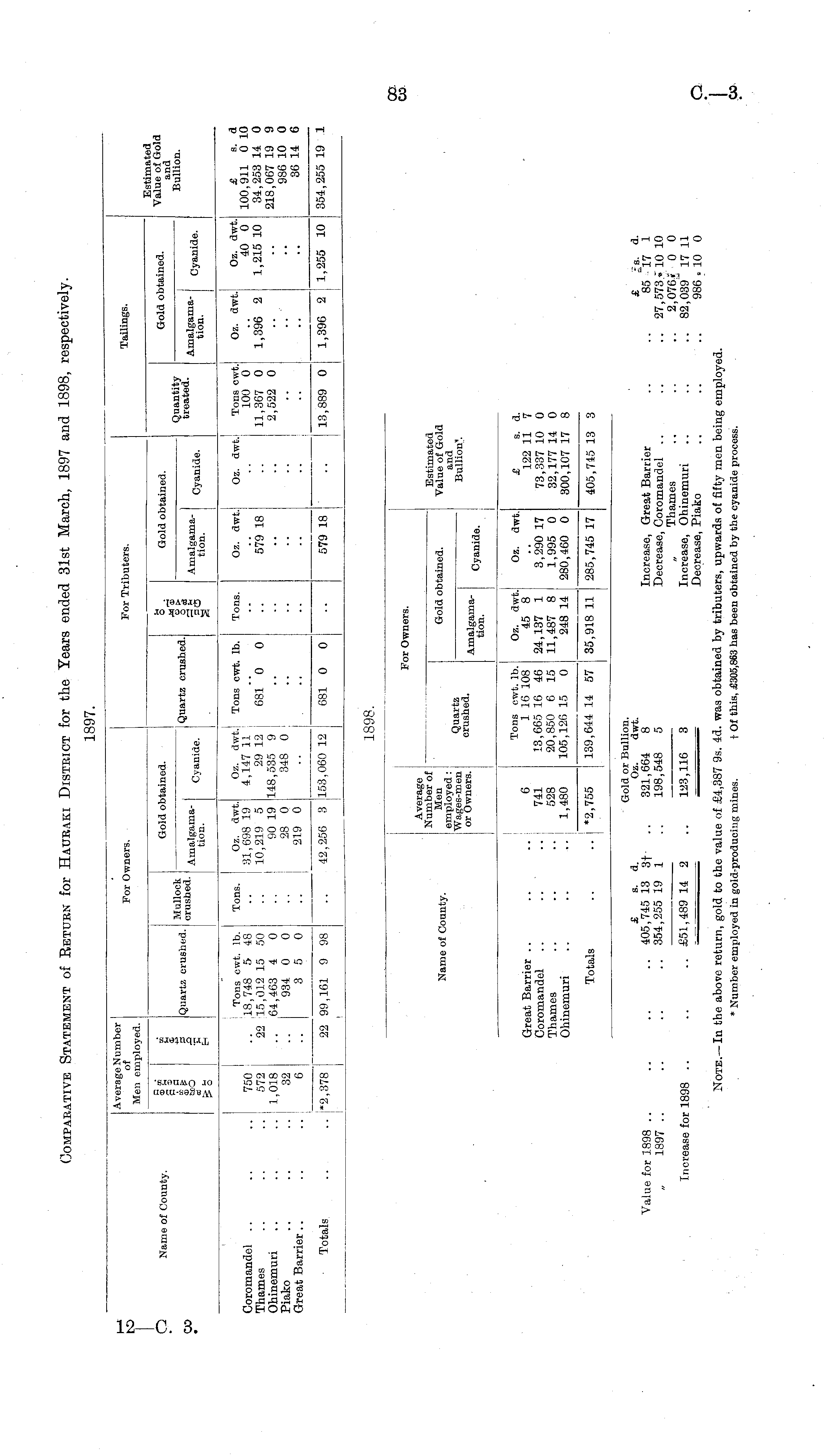 Average Number of For Owners, For Tributers. Tailings. Men employed. WO CC EH o . s > Gold ol itained. Estimated Value of Gold and Name of County. Gold obtained. Gold obtained. j Quartz crushed. Mullock crushed. Quartz crushed. treated. [ion. Amalgamation. Cyanide. Amalgamation. Cyanide. Amalgamation. Cyanide. I Tons. Oz. dwt. 31,698 19 10,219 5 90 19 28 0 219 0 i Coromandel .. Thames Ohinemuri Piako Great Barrier.. 750 572 1,018 32 6 Tons cwt. lb. .. 18,748 5 48 22 15,012 15 50 .. 64,463 4 0 934 0 0 3 5 0 22 99,161 9 98 Oz. dwt. 4,147 11 29 12 148,535 9 348 0 ■ Tons cwt. lb. 681 "o 0 Tons. Oz. dwt. 579 18 Oz. dwt.i ■■ •• Tons cwt. 100 0 11,367 0 2,522 0 Oz. dwt.; 1,396 2 j •• . Oz. dwt. 40 0 1,215 10 100,911 0 1( 34,253 14 I 218,067 19 ! 986 10 ( 36 14 I I •• •• Totals 1*2,378 42,256 3 579 18 b ! 13,889 0 j 1,396 2 1,255 10 354,255 19 153,060 12 681 0 0 .. ' ■■ , I 1898. For Owners. Name of County. Average i Number of Men ; employed : i Wages-men ! or Owners, Gold obtained. Estimated btained. Value of Gold and Bullion'. Quartz crushed. Amalgamation. Cyanide. I ! Cyanide. Great Barrier Coromandel .. Thames Ohinemuri Tons ..16 1 .. 741 13,665 .. i 528 20,850 .. ! 1,480 105,126 Tons cwt. lb. 1 16 108 13,665 16 46 20,850 6 15 105,126 15 0 Oz. dwt. Oz. dwt. 45 8 24,137 1 3,290 17 11,487 8 ! 1,995 0 248 14 ! 280,460 0 Oz. dwt. £ s. d. 122 11 7 3,290 17 73,337 10 0 1,995 0 32,177 14 0 280,460 0 300,107 17 8 Totals .. I *2,755 j 139,644 139,644 14 57 35,918 11 ' 285,745 17 285,745 17 405,745 13 3 Value for 1898 1897 .. £ s. d. .. 405,745 13 3f .. 354,255 19 1 Gold or Bullion. Oz. dwt. 321,664 8 198,548 5 Increase, Great Barrier Decrease, Coromandel .. Thames Increase, Ohinemuri Decrease, Piako £ fs. d. 85 17 1 .. 27,573. 10 10 2,076.f 0 0 .. 82,039" 17 11 986 . 10 0 Increase for 1898 .. .. £51,489 14 2 123,116 3