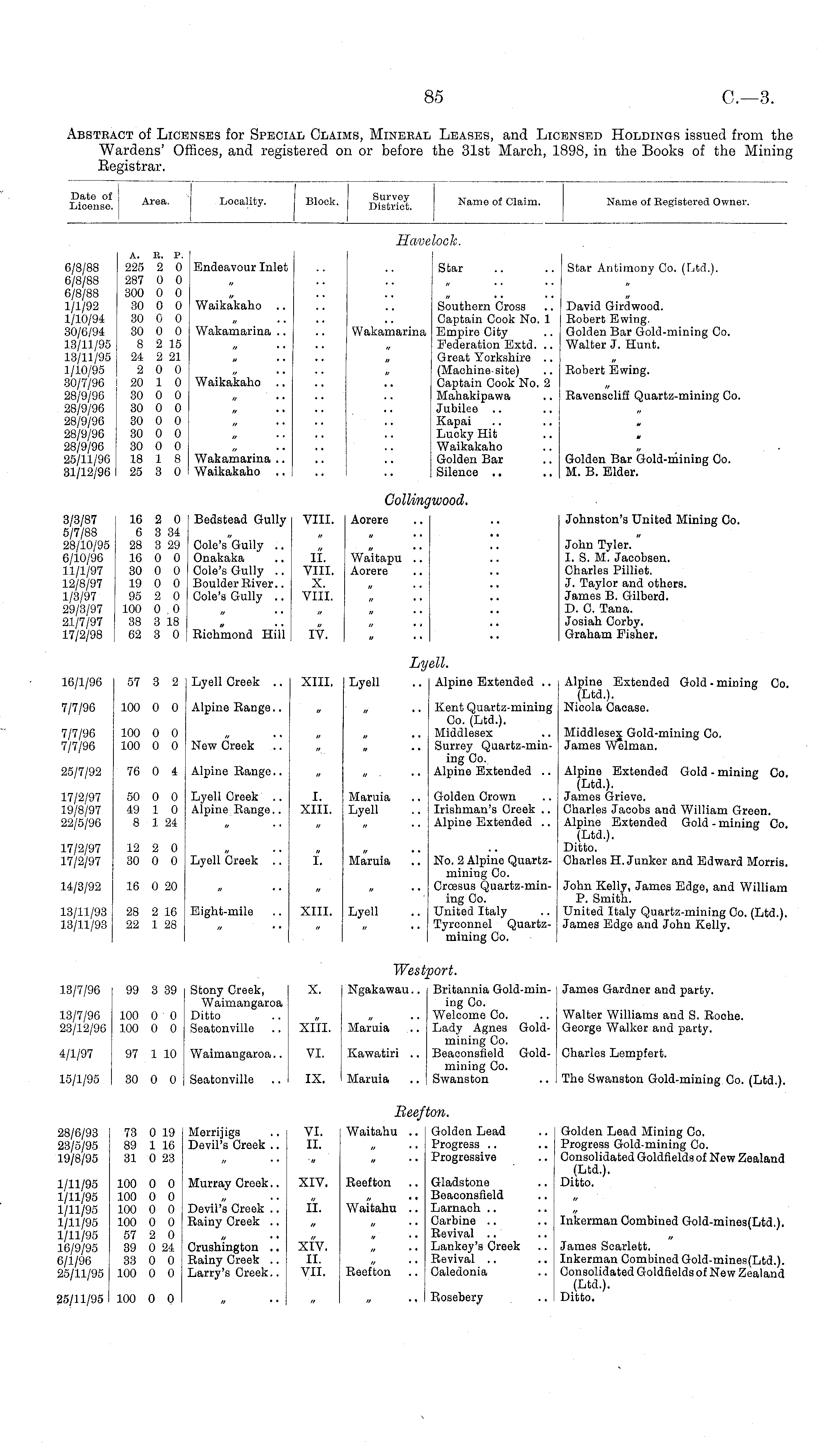 Abstract of Licenses for Special Claims, Mineral Leases, and Licensed Holdings issued from the Wardens' Offices, and registered on or before the 31st March, 1898, in the Books of the Mining Registrar.