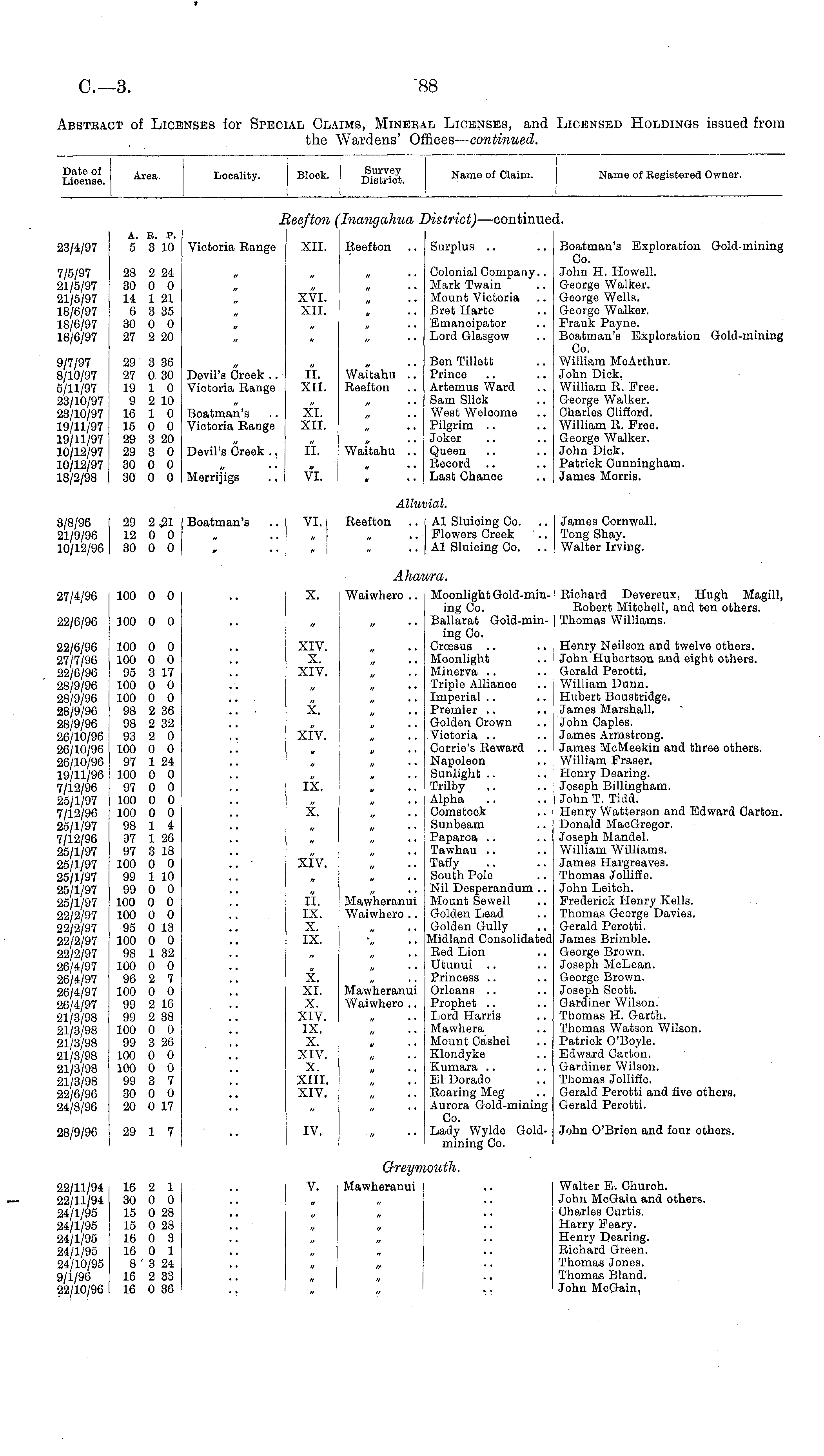 Date of License. Area. Locality. Block. Survey District. Name of Claim. Name of Registered Owner. 'eefton ( (Inangahua District)— continue! j.. 23/4/97 A. R. P. 5 3 10 Victoria Range XII. Reefton .. Surplus .. Boatman's Exploration Gold-mining Co. John H. Howell. George Walker. George Wells. George Walker. Frank Payne. Boatman's Exploration Gold-mining Co. William McArthur. John Dick. William R. Free. George Walker. Charles Clifford. William R. Free. George Walker. John Dick. Patrick Cunningham. James Morris. 7/5/97 21/5/97 21/5/97 18/6/97 18/6/97 18/6/97 28 2 24 30 0 0 14 1 21 6 3 35 30 0 0 27 2 20 XVI. XII. .. Colonial Company.. „ .. Mark Twain .. Mount Victoria .. Bret Harte .. Emancipator „ .. Lord Glasgow 9/7/97 8/10/97 5/11/97 23/10/97 23/10/97 19/11/97 19/11/97 10/12/97 10/12/97 18/2/98 29 3 36 27 0 30 19 1 0 9 2 10 16 1 0 15 0 0 29 3 20 29 3 0 30 0 0 30 0 0 Devil's Creek .. Victoria Range II. XII. XI. XII. II. VI. .. Ben Tillett Waitahu .. Prince Reefton .. Artemus Ward „ .. Sam Slick „ .. West Welcome „ .. Pilgrim .. „ .. Joker Waitahu .. Queen „ .. Record , .. Last Chanoe Boatman's Victoria Range Devil's Creek .. Merrijigs 29 2,21 12 0 0 30 0 0 Boatman's Alluvial. James Cornwall. Tong Shay. Walter Irving. 3/8/96 21/9/96 10/12/96 VI. Reefton .. Al Sluicing Co. .. Flowers Creek „ .. Al Sluicing Co. 27/4/96 100 0 0 Ahaura. Richard Devereux, Hugh Magill, Robert Mitchell, and ten others. Thomas Williams. 22/6/96 22/6/96 27/7/96 22/6/96 28/9/96 28/9/96 28/9/96 28/9/96 26/10/96 26/10/96 26/10/96 19/11/96 7/12/96 25/1/97 7/12/96 25/1/97 7/12/96 25/1/97 25/1/97 25/1/97 25/1/97 25/1/97 22/2/97 22/2/97 22/2/97 22/2/97 26/4/97 26/4/97 26/4/97 26/4/97 21/3/98 21/3/98 21/3/98 21/3/98 21/3/98 21/3/98 22/6/96 24/8/96 100 0 0 100 0 0 100 0 0 95 3 17 100 0 0 100 0 0 98 2 36 98 2 32 93 2 0 100 0 0 97 1 24 100 0 0 97 0 0 100 0 0 100 0 0 98 1 4 97 1 26 97 3 18 100 0 0 99 1 10 99 0 0 100 0 0 100 0 0 95 0 13 100 0 0 98 1 32 100 0 0 96 2 7 100 0 0 99 2 16 99 2 38 100 0 0 99 3 26 100 0 0 100 0 0 99 3 7 30 0 0 20 0 17 X. XIV. X. XIV. X. XIV. IX. X. xi'v. II. IX. X. IX. X. XI. X. XIV. IX. X. XIV. X. XIII. XIV. IV. Waiwhero.. Moonlight Gold-min-ing Co. „ .. Ballarat Gold-min-ing Go. .. Croesus .. „ .. Moonlight „ .. Minerva .. „ .. Triple Alliance „ .. Imperial .. „ .. Premier .. „ .. Golden Crown .. Victoria .. „ .. Corrie's Reward .. „ .. Napoleon „ .. Sunlight .. .. Trilby „ .. Alpha .. .. | .. Comstock „ .. Sunbeam „ .. Paparoa .. „ .. Tawhau .. .. Taffy .. South Pole „ .. Nil Desperandum .. Mawheranui Mount Sewell Waiwhero .. Golden Lead .. Golden Gully •„ .. Midland Consolidated „ .. Red Lion .. Utunui .. „ .. Princess Mawheranui Orleans Waiwhero .. Prophet .. .. Lord Harris „ .. Mawhera .. Mount Cashel „ .. Klondyke „ .. Kumara .. El Dorado „ .. Roaring Meg „ .. Aurora Gold-mining Co. .. Lady Wylde Goldmining Co. Henry Neilson and twelve others. John Hubertson and eight others. Gerald Perotti. William Dunn. Hubert Boustridge. James Marshall. John Caples. James Armstrong. James McMeekin and three others. William Fraser. Henry Dearing. Joseph Billingham. John T. Tidd. Henry Watterson and Edward Carton. Donald MacGregor. Joseph Mandel. William Williams. James Hargreaves. Thomas Jolliffe. John Leitch. Frederick Henry Kells. Thomas George Davies. Gerald Perotti. James Brimble. George Brown. Joseph McLean. George Brown. Joseph Scott. Gardiner Wilson. Thomas H. Garth. Thomas Watson Wilson. Patrick O'Boyle. Edward Carton. Gardiner Wilson. Thomas Jolliffe. Gerald Perotti and five others. Gerald Perotti. 28/9/96 29 1 7 John O'Brien and four others. 22/11/94 22/11/94 24/1/95 24/1/95 24/1/95 24/1/95 24/10/95 9/1/96 22/10/96 16 2 1 30 0 0 15 0 28 15 0 28 16 0 3 16 0 1 8 ' 3 24 16 2 33 16 0 36 V. Greymouth. Mawheranui Walter E. Church. John McGain and others. Charles Curtis. Harry Feary. Henry Dearing. Richard Green. Thomas Jones. Thomas Bland. John McGain,