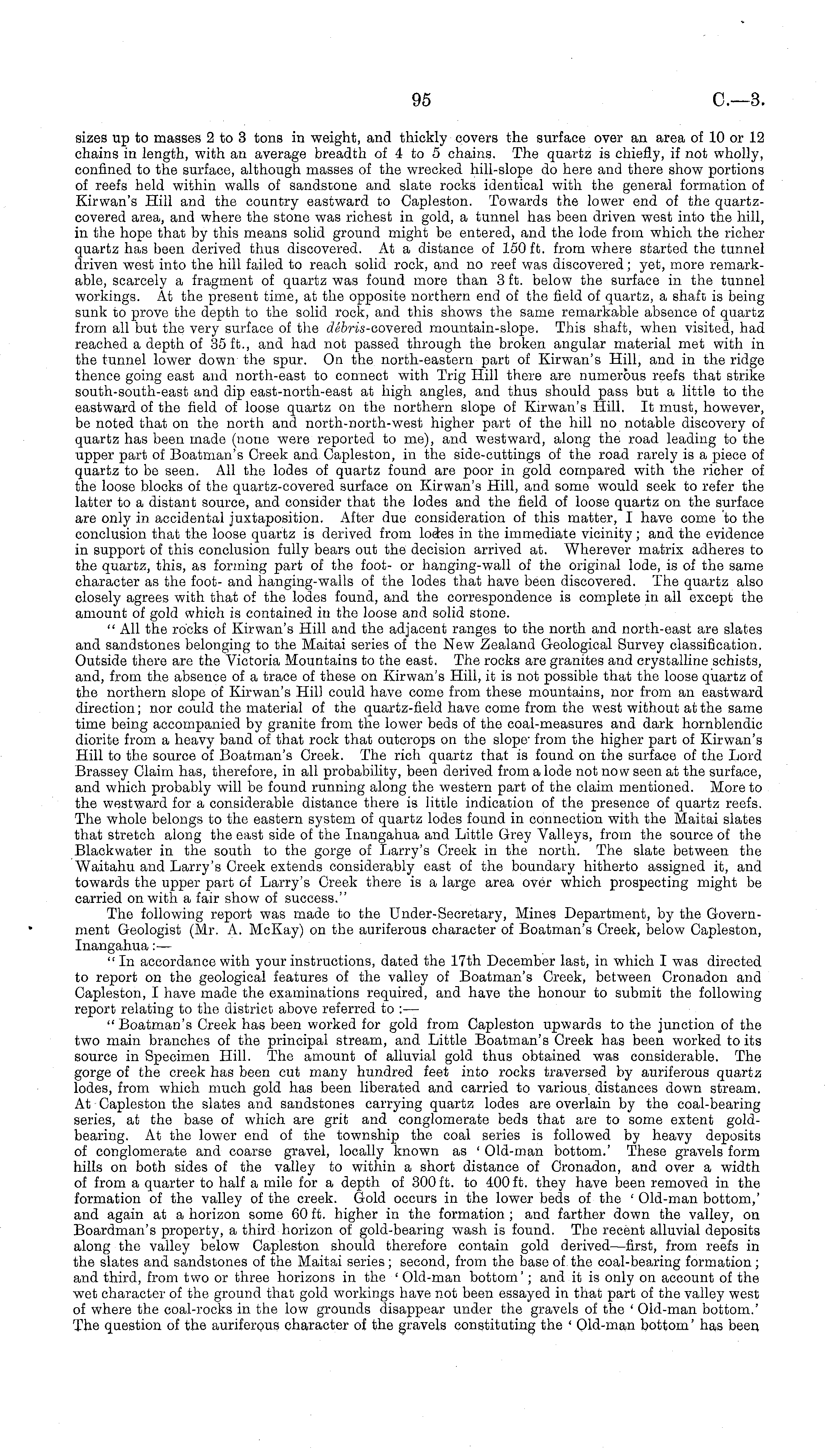 sizes up to masses 2 to 3 tons in weight, and thickly covers the surface over an area of 10 or 12 chains in length, with an average breadth of 4 to 5 chains. The quartz is chiefly, if not wholly, confined to the surface, although masses of the wrecked hill-slope do here and there show portions of reefs held within walls of sandstone and slate rocks identical with the general formation of Kirwan's Hill and the country eastward to Capleston. Towards the lower end of the quartzcovered area, and where the stone was richest in gold, a tunnel has been driven west into the hill, in the hope that by this means solid ground might be entered, and the lode from which the richer quartz has been derived thus discovered. At a distance of 150 ft. from where started the tunnel driven west into the hill failed to reach solid rock, and no reef was discovered; yet, more remarkable, scarcely a fragment of quartz was found more than 3 ft. below the surface in the tunnel workings. At the present time, at the opposite northern end of the field of quartz, a shaft is being sunk to prove the depth to the solid rock, and this shows the same remarkable absence of quartz from all but the very surface of the debris-ooveieA mountain-slope. This shaft, when visited, had reached a depth of 35 ft., and had not passed through the broken angular material met with in the tunnel lower down the spur. On the north-eastern part of Kirwan's Hill, and in the ridge thence going east and north-east to connect with Trig Hill there are numerous reefs that strike south-south-east and dip east-north-east at high angles, and thus should pass but a little to the eastward of the field of loose quartz on the northern slope of Kirwan's Hill. It must, however, be noted that on the north and north-north-west higher part of the hill no notable discovery of quartz has been made (none were reported to me), and westward, along the road leading to the upper part of Boatman's Creek and Capleston, in the side-cuttings of the road rarely is a piece of quartz to be seen. All the lodes of quartz found are poor in gold compared with the richer of the loose blocks of the quartz-covered surface on Kirwan's Hill, and some would seek to refer the latter to a distant source, and consider that the lodes and the field of loose quartz on the surface are only in accidental juxtaposition. After due consideration of this matter, I have come to the conclusion that the loose quartz is derived from lodes in the immediate vicinity; and the evidence in support of this conclusion fully bears out the decision arrived at. Wherever matrix adheres to the quartz, this, as forming part of the foot- or hanging-wall of the original lode, is of the same character as the foot- and hanging-walls of the lodes that have been discovered. The quartz also closely agrees with that of the lodes found, and the correspondence is complete in all except the amount of gold which is contained in the loose and solid stone. " All the rocks of Kirwan's Hill and the adjacent ranges to the north and north-east are slates and sandstones belonging to the Maitai series of the New Zealand Geological Survey classification. Outside there are the Victoria Mountains to the east. The rocks are granites and crystalline schists, and, from the absence of a trace of these on Kirwan's Hill, it is not possible that the loose quartz of the northern slope of Kirwan's Hill could have come from these mountains, nor from an eastward direction; nor could the material of the quartz-field have come from the west without at the same time being accompanied by granite from the lower beds of the coal-measures and dark hornblendic diorite from a heavy band of that rock that outcrops on the slope- from the higher part of Kirwan's Hill to the source of Boatman's Creek. The rich quartz that is found on the surface of the Lord Brassey Claim has, therefore, in all probability, been derived from a lode not now seen at the surface, and which probably will be found running along the western part of the claim mentioned. More to the westward for a considerable distance there is little indication of the presence of quartz reefs. The whole belongs to the eastern system of quartz lodes found in connection with the Maitai slates that stretch along the east side of the Inangahua and Little Grey Valleys, from the source of the Blackwater in the south to the gorge of Larry's Creek in the north. The slate between the Waitahu and Larry's Creek extends considerably east of the boundary hitherto assigned it, and towards the upper part of Larry's Creek there is a large area over which prospecting might be carried on with a fair show of success." The following report was made to the Under-Secretary, Mines Department, by the Government Geologist (Mr. A. McKay) on the auriferous character of Boatman's Creek, below Capleston, Inangahua:— "In accordance with your instructions, dated the 17th December last, in which I was directed to report on the geological features of the valley of Boatman's Creek, between Cronadon and Capleston, I have made the examinations required, and have the honour to submit the following report relating to the district above referred to : — " Boatman's Creek has been worked for gold from Capleston upwards to the junction of the two main branches of the principal stream, and Little Boatman's Creek has been worked to its source in Specimen Hill. The amount of alluvial gold thus obtained was considerable. The gorge of the creek has been cut many hundred feet into rocks traversed by auriferous quartz lodes, from which much gold has been liberated and carried to various, distances down stream. At Capleston the slates and sandstones carrying quartz lodes are overlain by the coal-bearing series, at the base of which are grit and conglomerate beds that are to some extent goldbearing. At the lower end of the township the coal series is followed by heavy deposits of conglomerate and coarse gravel, locally known as ' Old-man bottom.' 