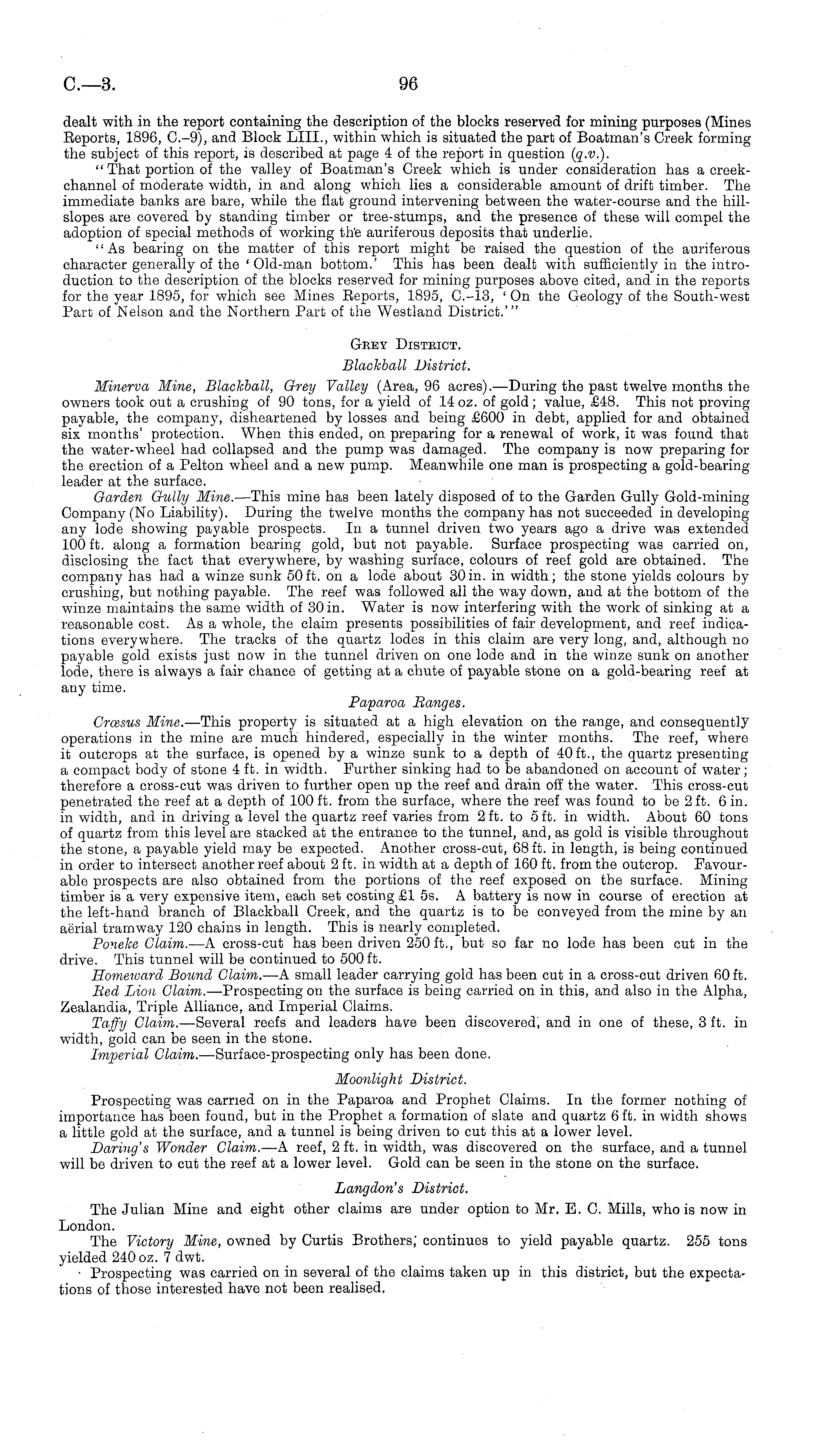 dealt with in the report containing the description of the blocks reserved for mining purposes (Mines Reports, 1896, C.-9), and Block LIIL, within which is situated the part of Boatman's Creek forming the subject of this report, is described at page 4 of the report in question (q.v.). " That portion of the valley of Boatman's Creek which is under consideration has a creekchannel of moderate width, in and along which lies a considerable amount of drift timber. The immediate banks are bare, while the flat ground intervening between the water-course and the hillslopes are covered by standing timber or tree-stumps, and the presence of these will compel the adoption of special methods of working the auriferous deposits that underlie. "As bearing on the matter of this report might be raised the question of the auriferous character generally of the 'Old-man bottom.' This has been dealt with sufficiently in the introduction to the description of the blocks reserved for mining purposes above cited, and in the reports for the year 1895, for which see Mines Reports, 1895, C.-13, ' On the Geology of the South-west Part of Nelson and the Northern Part of the Westland District.'" Geey Disteict. Blackball District. Minerva Mine, Blackball, Grey Valley (Area, 96 acres). —During the past twelve months the owners took out a crushing of 90 tons, for a yield of 14 oz. of gold; value, £48. This not proving payable, the company, disheartened by losses and being £600 in debt, applied for and obtained six months' protection. When this ended, on preparing for a renewal of work, it was found that the water-wheel had collapsed and the pump was damaged. The company is now preparing for the erection of a Pelton wheel and a new pump. Meanwhile one man is prospecting a gold-bearing leader at the surface. Garden Gully Mine. —This mine has been lately disposed of to the Garden Gully Gold-mining Company (No Liability). During the twelve months the company has not succeeded in developing any lode showing payable prospects. In a tunnel driven two years ago a drive was extended 100 ft. along a formation bearing gold, but not payable. Surface prospecting was carried on, disclosing the fact that everywhere, by washing surface, colours of reef gold are obtained. The company has had a winze sunk 50ft. on a lode about 30in. in width; the stone yields colours by crushing, but nothing payable. The reef was followed all the way down, and at the bottom of the winze maintains the same width of 30 in. Water is now interfering with the work of sinking at a reasonable cost. As a whole, the claim presents possibilities of fair development, and reef indications everywhere. The tracks of the quartz lodes in this claim are very long, and, although no payable gold exists just now in the tunnel driven on one lode and in the winze sunk on another lode, there is always a fair chance of getting at a chute of payable stone on a gold-bearing reef at any time. Paparoa Ranges. Crcesus Mine. —This property is situated at a high elevation on the range, and consequently operations in the mine are much hindered, especially in the winter months. The reef, where it outcrops at the surface, is opened by a winze sunk to a depth of 40 ft., the quartz presenting a compact body of stone 4 ft. in width. Further sinking had to be abandoned on account of water; therefore a cross-cut was driven to further open up the reef and drain off the water. This cross-cut penetrated the reef at a depth of 100 ft. from the surface, where the reef was found to be 2 ft. 6 in. in width, and in driving a level the quartz reef varies from 2 ft. to 5 ft. in width. About 60 tons of quartz from this level are stacked at the entrance to the tunnel, and, as gold is visible throughout the stone, a payable yield may be expected. Another cross-cut, 68 ft. in length, is being continued in order to intersect another reef about 2 ft. in width at a depth of 160 ft. from the outcrop. Favourable prospects are also obtained from the portions of the reef exposed on the surface. Mining timber is a very expensive item, each set costing £1 ss. A battery is now in course of erection at the left-hand branch of Blackball Creek, and the quartz is to be conveyed from the mine by an aerial tramway 120 chains in length. This is nearly completed. Poneke Claim. —A cross-cut has been driven 250 ft., but so far no lode has been cut in the drive. This tunnel will be continued to 500 ft. Homeward Bound Claim. —A small leader carrying gold has been cut in a cross-cut driven 60 ft. Red Lion Claim. —Prospecting on the surface is being carried on in this, and also in the Alpha, Zealandia, Triple Alliance, and Imperial Claims. Taffy Claim. —Several reefs and leaders have been discovered, and in one of these, 3 ft. in width, gold can be seen in the stone. Imperial Claim. —Surface-prospecting only has been done. Moonlight District. Prospecting was carried on in the Paparoa and Prophet Claims. In the former nothing of importance has been found, but in the Prophet a formation of slate and quartz 6 ft. in width shows a little gold at the surface, and a tunnel is being driven to cut this at a lower level. Daring's Wonder Claim. —A reef, 2 ft. in width, was discovered on the surface, and a tunnel will be driven to cut the reef at a lower level. Gold can be seen in the stone on the surface. Langdon's District. The Julian Mine and eight other claims are under option to Mr. E. C. Mills, who is now in London. The Victory Mine, owned by Curtis Brothers; continues to yield payable quartz. 255 tons yielded 240 oz. 7 dwt. Prospecting was carried on in several of the claims taken up in this district, but the expectations of those interested have not been realised.