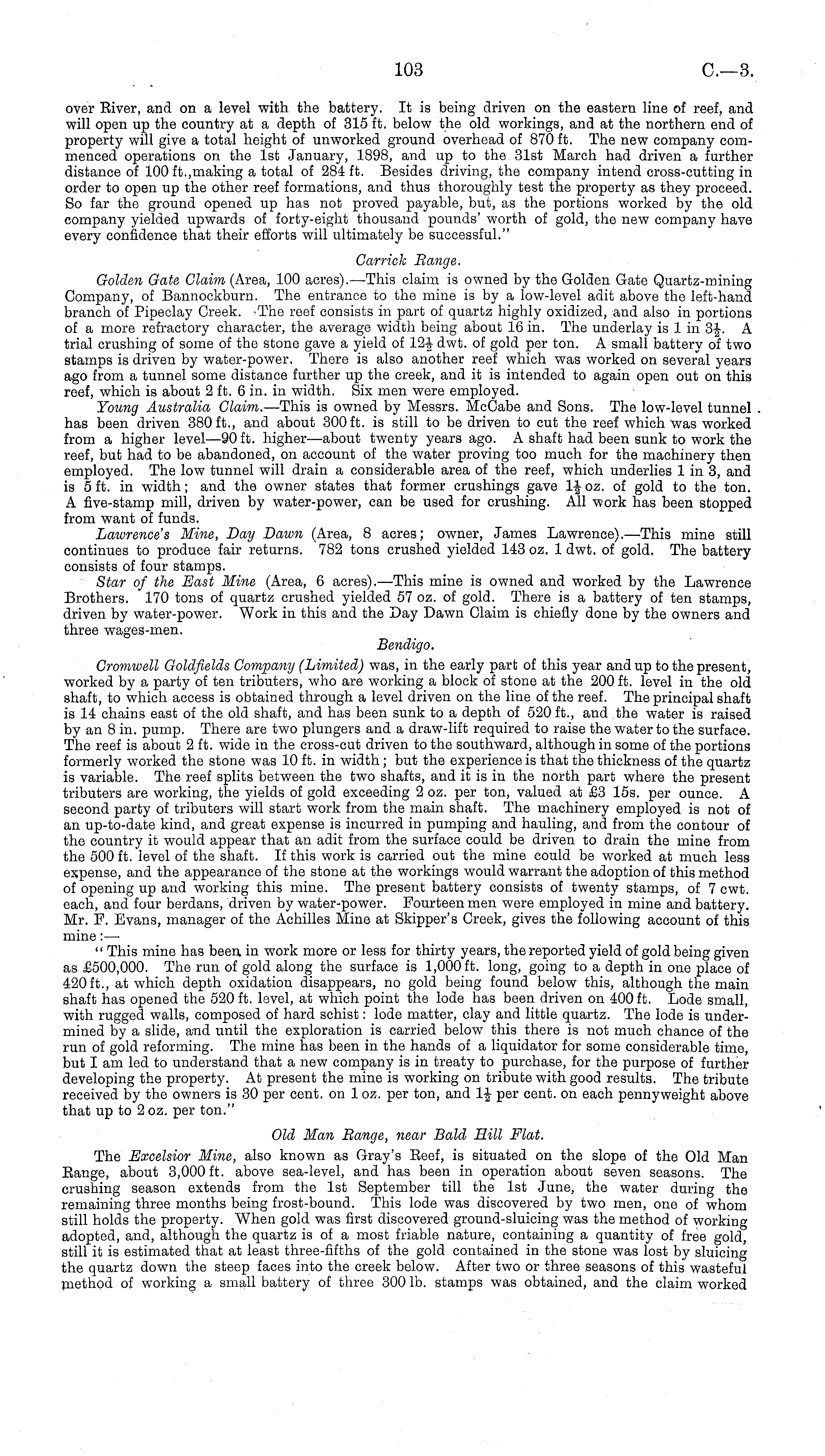 over Eiver, and on a level with the battery. It is being driven on the eastern line of reef, and will open up the country at a depth of 315 ft. below the old workings, and at the northern end of property will give a total height of unworked ground overhead of 870 ft. The new company commenced operations on the Ist January, 1898, and up to the 31st March had driven a further distance of 100 ft.,making a total of 284 ft. Besides driving, the company intend cross-cutting in order to open up the other reef formations, and thus thoroughly test the property as they proceed. So far the ground opened up has not proved payable, but, as the portions worked by the old company yielded upwards of forty-eight thousand pounds' worth of gold, the new company have every confidence that their efforts will ultimately be successful." Carrick Range. Golden Gate Claim (Area, 100 acres). —This claim is owned by the Golden Gate Quartz-mining Company, of Bannockburn. The entrance to the mine is by a low-level adit above the left-hand branch of Pipeclay Creek. >The reef consists in part of quartz highly oxidized, and also in portions of a more refractory character, the average width being about 16 in. The underlay is lin 3J. A trial crushing of some of the stone gave a yield of 12-J dwt. of gold per ton. A small battery of two stamps is driven by water-power, There is also another reef which was worked on several years ago from a tunnel some distance further up the creek, and it is intended to again open out on this reef, which is about 2 ft. 6 in. in width. Six men were employed. Young Australia Claim. —This is owned by Messrs. McGabe and Sons. The low-level tunnel has been driven 380 ft., and about 300 ft. is still to be driven to cut the reef which was worked from a higher level—9o ft. higher—about twenty years ago. A shaft had been sunk to work the reef, but had to be abandoned, on account of the water proving too much for the machinery then employed. The low tunnel will drain a considerable area of the reef, which underlies lin 3, and is sft. in width; and the owner states that former crushings gave If oz. of gold to the ton. A five-stamp mill, driven by water-power, can be used for crushing. All work has been stopped from want of funds. Lawrence's Mine, Day Dawn (Area, 8 acres; owner, James Lawrence). —This mine still continues to produce fair returns. 782 tons crushed yielded 143 oz. 1 dwt. of gold. The battery consists of four stamps. Star of the East Mine (Area, 6 acres). —This mine is owned and worked by the Lawrence Brothers. 170 tons of quartz crushed yielded 57 oz. of gold. There is a battery of ten stamps, driven by water-power. Work in this and the Day Dawn Claim is chiefly done by the owners and three wages-men. Bendigo. Cromwell Goldfields Company (Limited) was, in the early part of this year and up to the present, worked by a party of ten tributers, who are working a block of stone at the 200 ft. level in the old shaft, to which access is obtained through a level driven on the line of the reef. The principal shaft is 14 chains east of the old shaft, and has been sunk to a depth of 520 ft., and the water is raised by an 8 in. pump. There are two plungers and a draw-lift required to raise the water to the surface. The reef is about 2 ft. wide in the cross-cut driven to the southward, although in some of the portions formerly worked the stone was 10 ft. in width; but the experience is that the thickness of the quartz is variable. The reef splits between the two shafts, and it is in the north part where the present tributers are working, the yields of gold exceeding 2 oz. per ton, valued at £3 15s. per ounce. A second party of tributers will start work from the main shaft. The machinery employed is not of an up-to-date kind, and great expense is incurred in pumping and hauling, and from the contour of the country it would appear that an adit from the surface could be driven to drain the mine from the 500 ft. level of the shaft. If this work is carried out the mine could be worked at much less expense, and the appearance of the stone at the workings would warrant the adoption of this method of opening up and working this mine. The present battery consists of twenty stamps, of 7 cwt. each, and four berdans, driven by water-power. Fourteen men were employed in mine and battery. Mr. F. Evans, manager of the Achilles Mine at Skipper's Creek, gives the following account of this mine:— " This mine has been in work more or less for thirty years, the reported yield of gold being given as £500,000. The run of gold along the surface is 1,000 ft. long, going to a depth in one place of 420 ft., at which depth oxidation disappears, no gold being found below this, although the main shaft has opened the 520 ft. level, at which point the lode has been driven on 400 ft. Lode small, with rugged walls, composed of hard schist: lode matter, clay and little quartz. The lode is undermined by a slide, and until the exploration is carried below this there is not much chance of the run of gold reforming. The mine has been in the hands of a liquidator for some considerable time, but I am led to understand that a new company is in treaty to purchase, for the purpose of further developing the property. At present the mine is working on tribute with good results. The tribute received by the owners is 30 per cent, on 1 oz. per ton, and If per cent, on each pennyweight above that up to 2 oz, per ton." Old Man Range, near Bald Hill Flat. The Excelsior Mine, also known as Gray's Eeef, is situated on the slope of the Old Man Eange, about 3,000 ft. above sea-level, and has been in operation about seven seasons. The crushing season extends from the Ist September till the Ist June, the water during the remaining three months being frost-bound. This lode was discovered by two men, one of whom still holds the property. When gold was first discovered ground-sluicing was the method of working adopted, and, although the quart