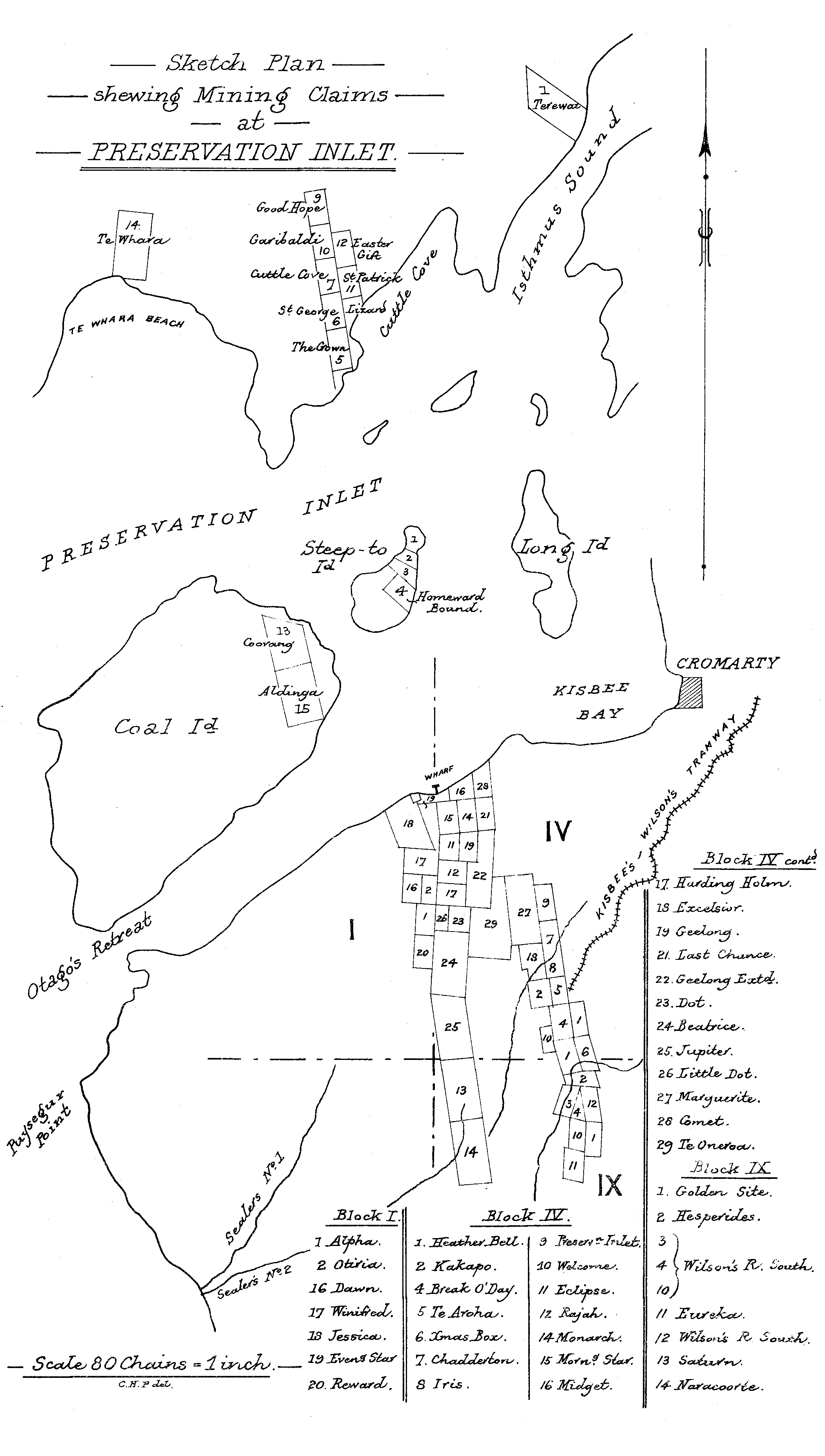 Sketch Plan shewing Mining Claims at PRESERVATION INLET.